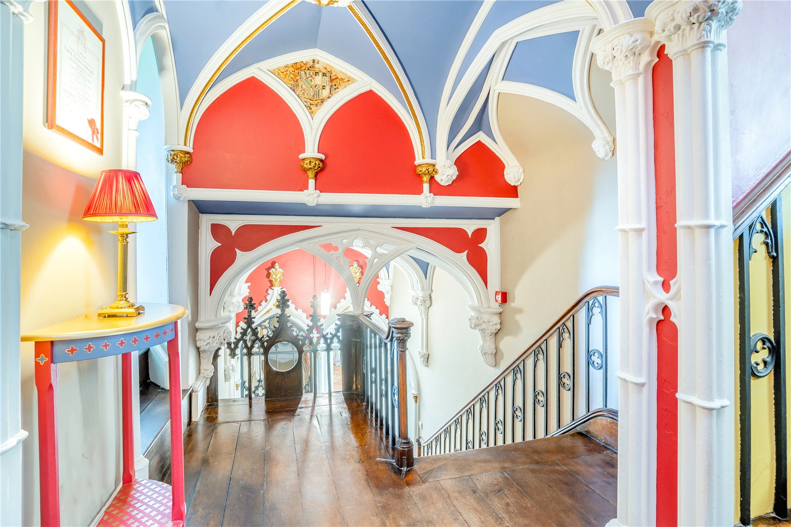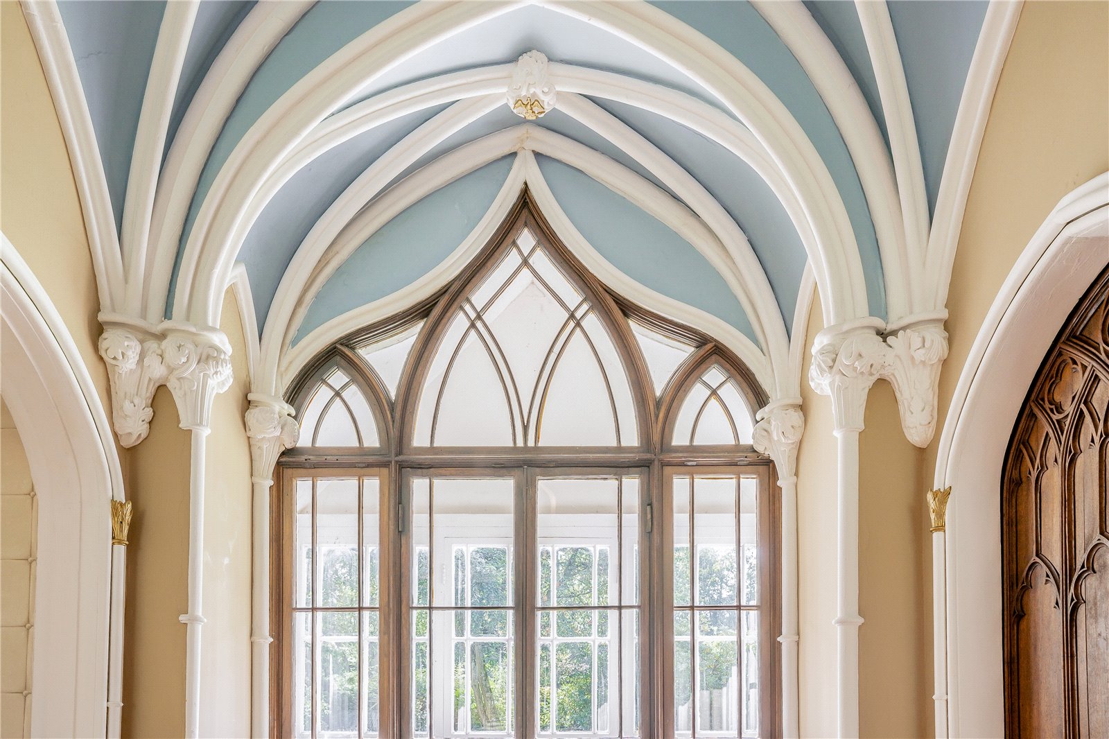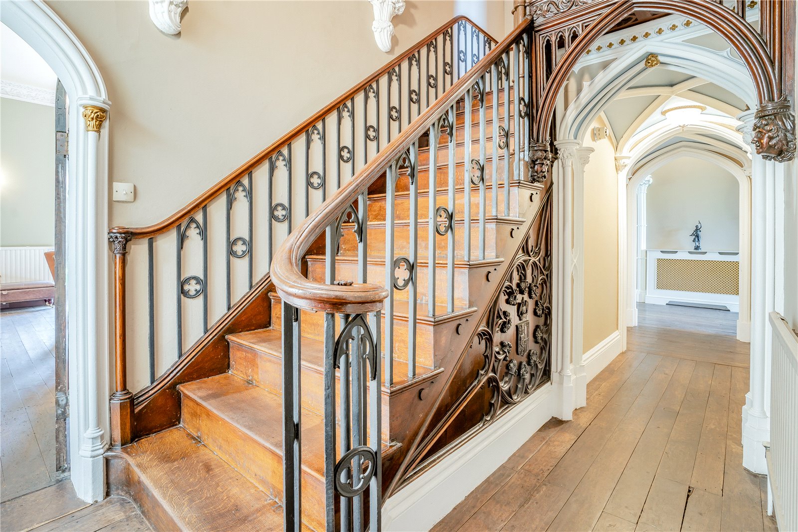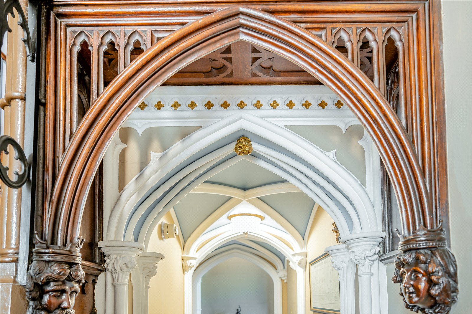 This stunning Grade II* listed Georgian Strawberry Gothic manor house offers a perfect blend of historic charm and generous living space. The 6-bedroom, 3-reception room residence is rich in character, featuring a full-depth hallway with a ribbed vaulted ceiling, oak floorboarding, and impressive internal doors showcasing exquisite Strawberry Hill detailing. The hallway is adorned with a deep enriched cornice and boasts a striking architectural balcony with cusped paneling, projecting elegantly into the space. Spanning approximately 7,000 sq. ft., the thoughtful layout centers around a breathtaking staircase and hallway, offering an intimate yet connected feel throughout the home.