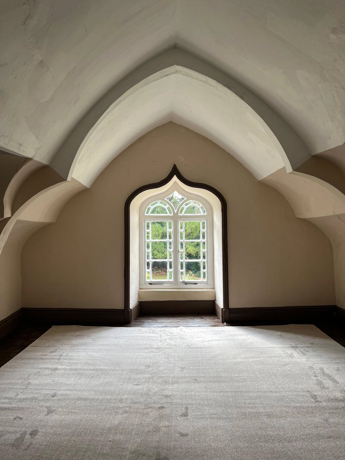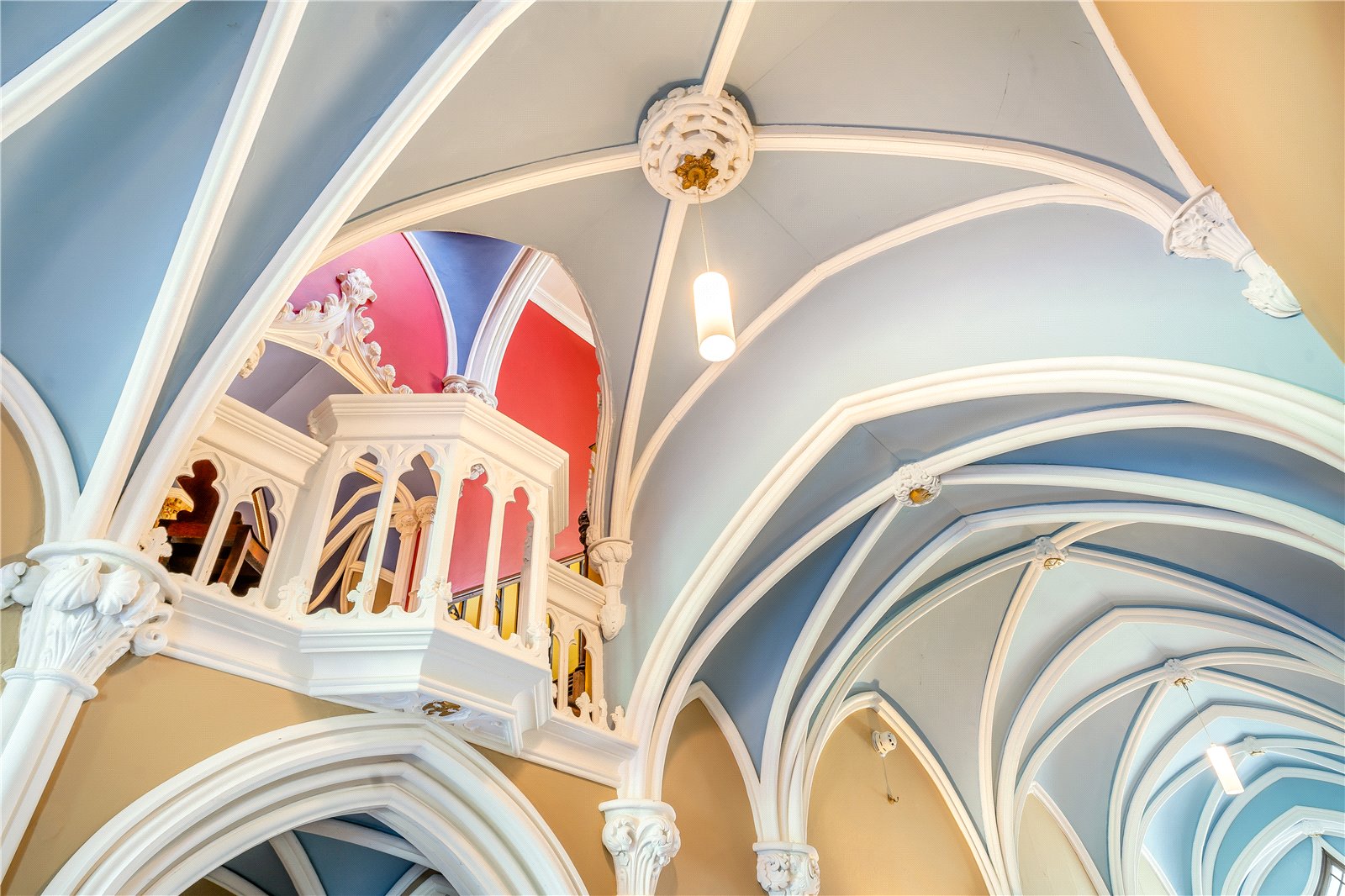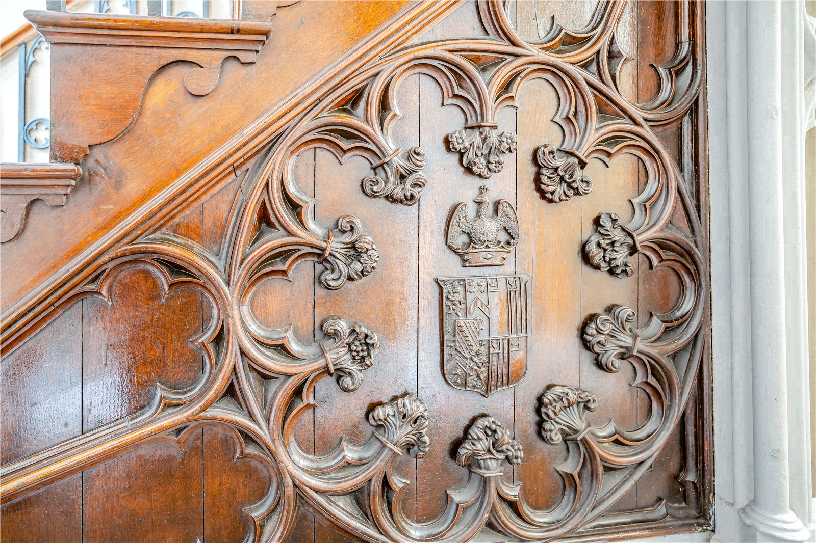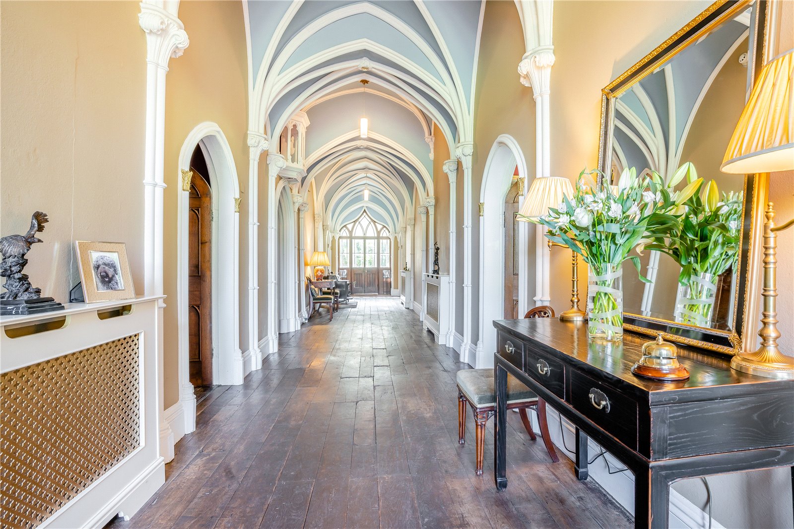 This stunning Grade II* listed Georgian Strawberry Gothic manor house offers a perfect blend of historic charm and generous living space. The 6-bedroom, 3-reception room residence is rich in character, featuring a full-depth hallway with a ribbed vaulted ceiling, oak floorboarding, and impressive internal doors showcasing exquisite Strawberry Hill detailing. The hallway is adorned with a deep enriched cornice and boasts a striking architectural balcony with cusped paneling, projecting elegantly into the space. Spanning approximately 7,000 sq. ft., the thoughtful layout centers around a breathtaking staircase and hallway, offering an intimate yet connected feel throughout the home.