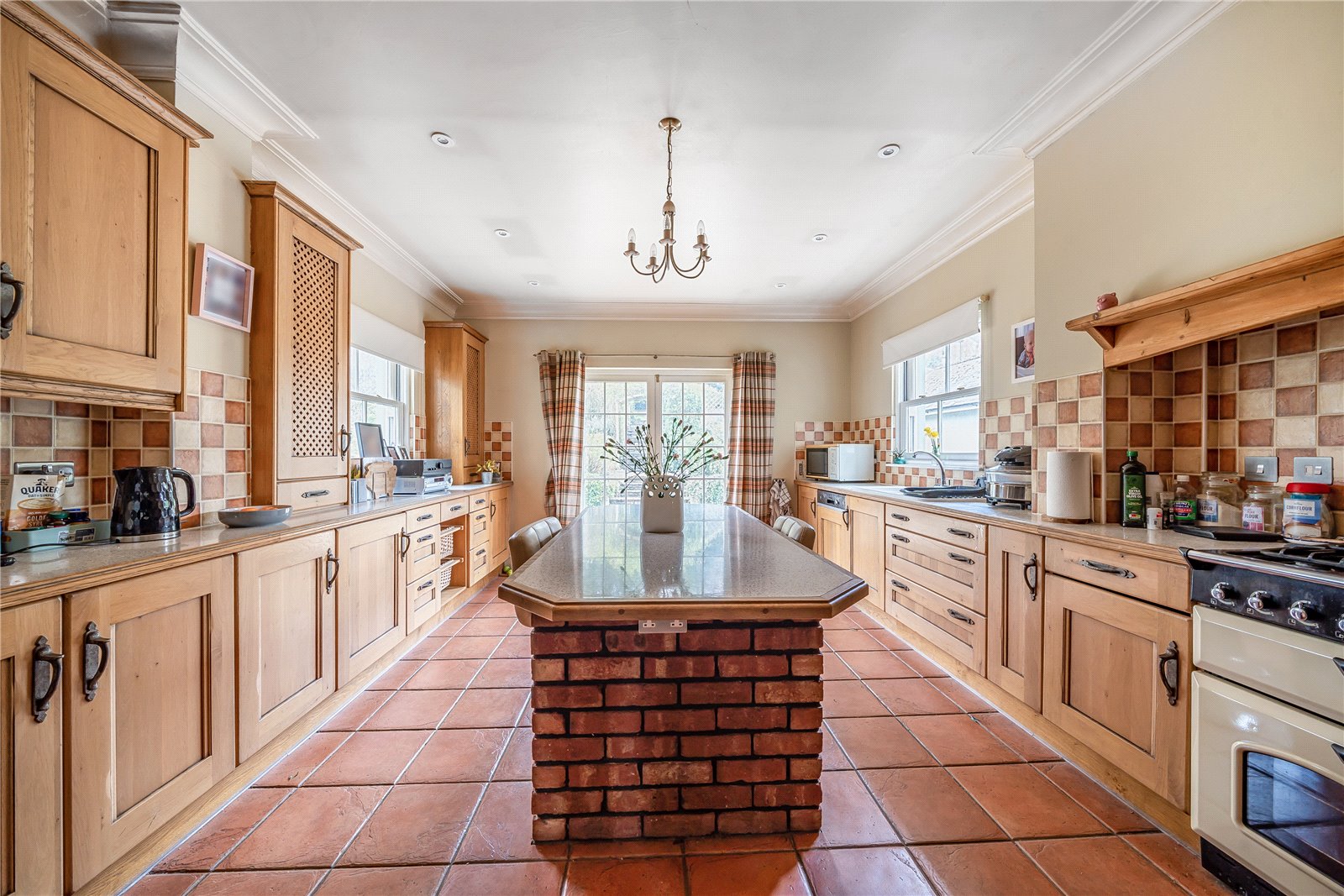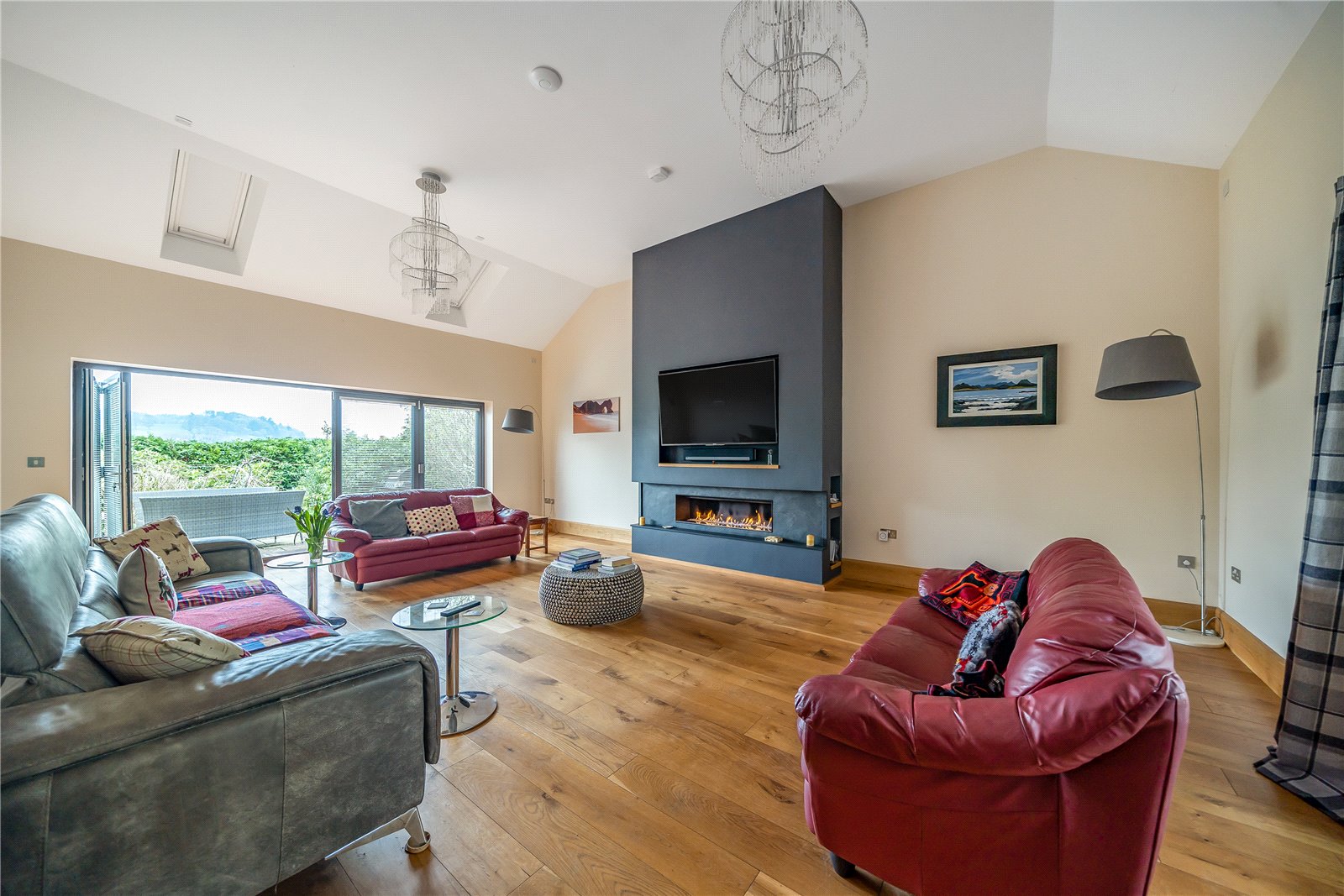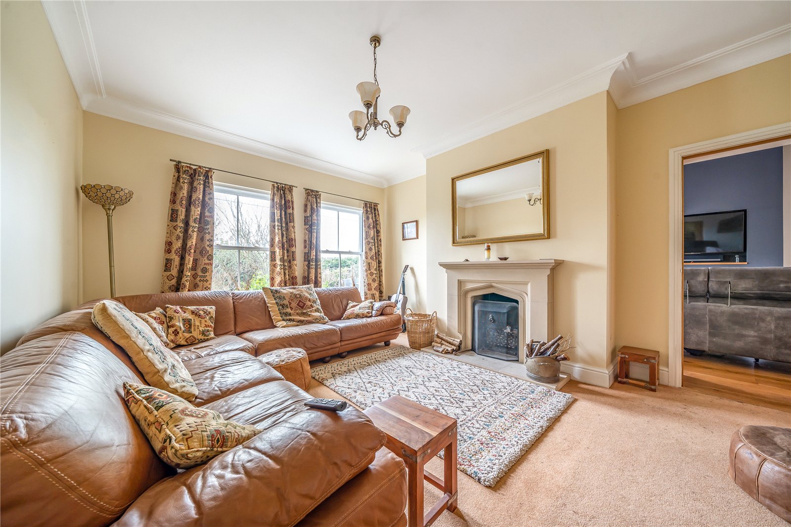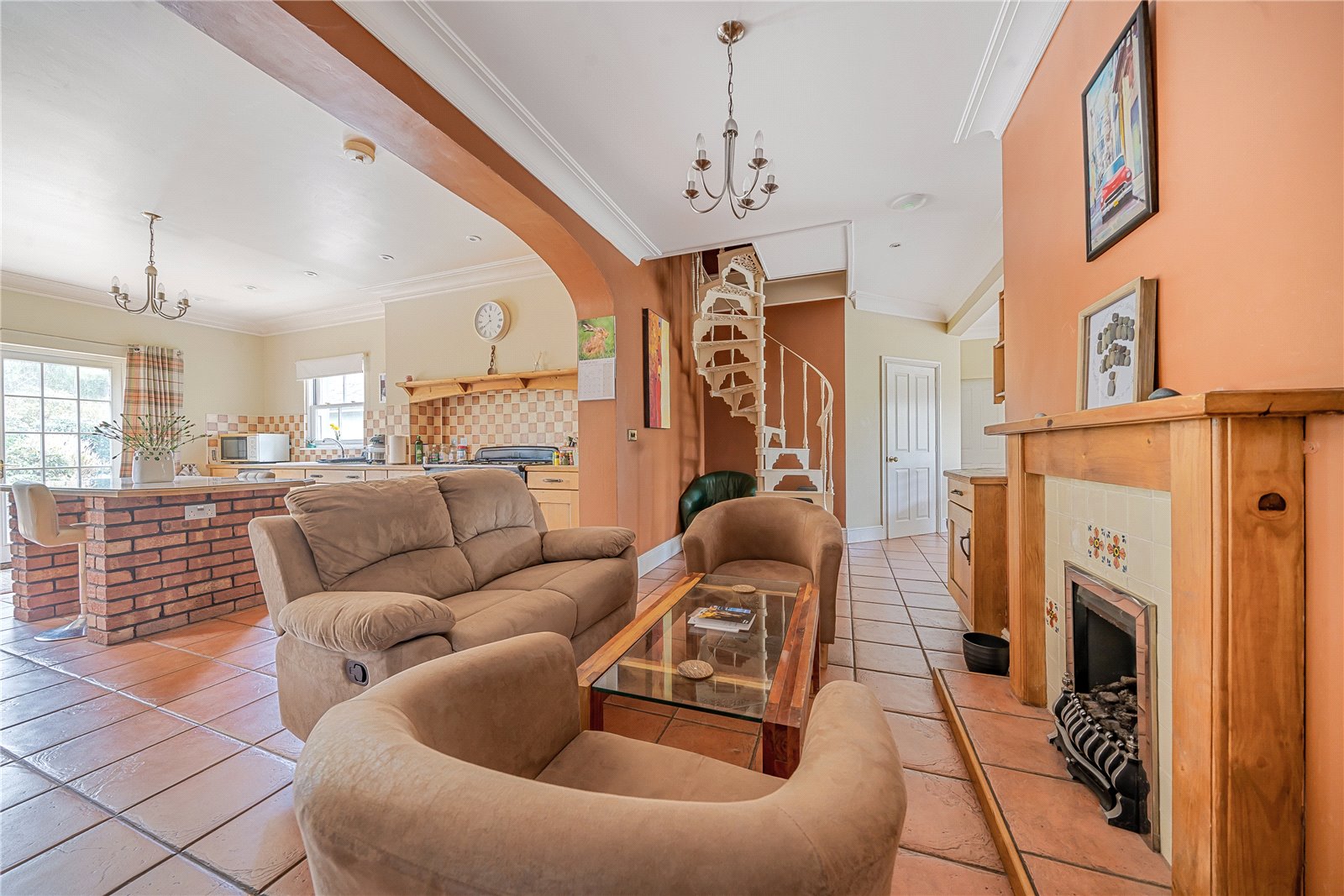 As you entrer the front door you are greeted by a spacious reception hall with a feature fireplace and a stylish staircase that leads to the upper floors. The cozy sitting room, designed for winter comfort, features an inviting fire surround and south-facing windows. Undoubtedly, the main highlight of the house is the principal living room, boasting bi-fold doors opening to the front patio, high-level ceilings, and a captivating built-in feature fireplace that stands as a focal point.The kitchen exudes warmth and hospitality, showcasing oak-fronted units along two walls, a central island, a snug seating area around a feature fireplace, and a sizable opening to the dining area. This dining space, flooded with natural light from its south-facing aspect, offers ample room to accommodate numerous guests.