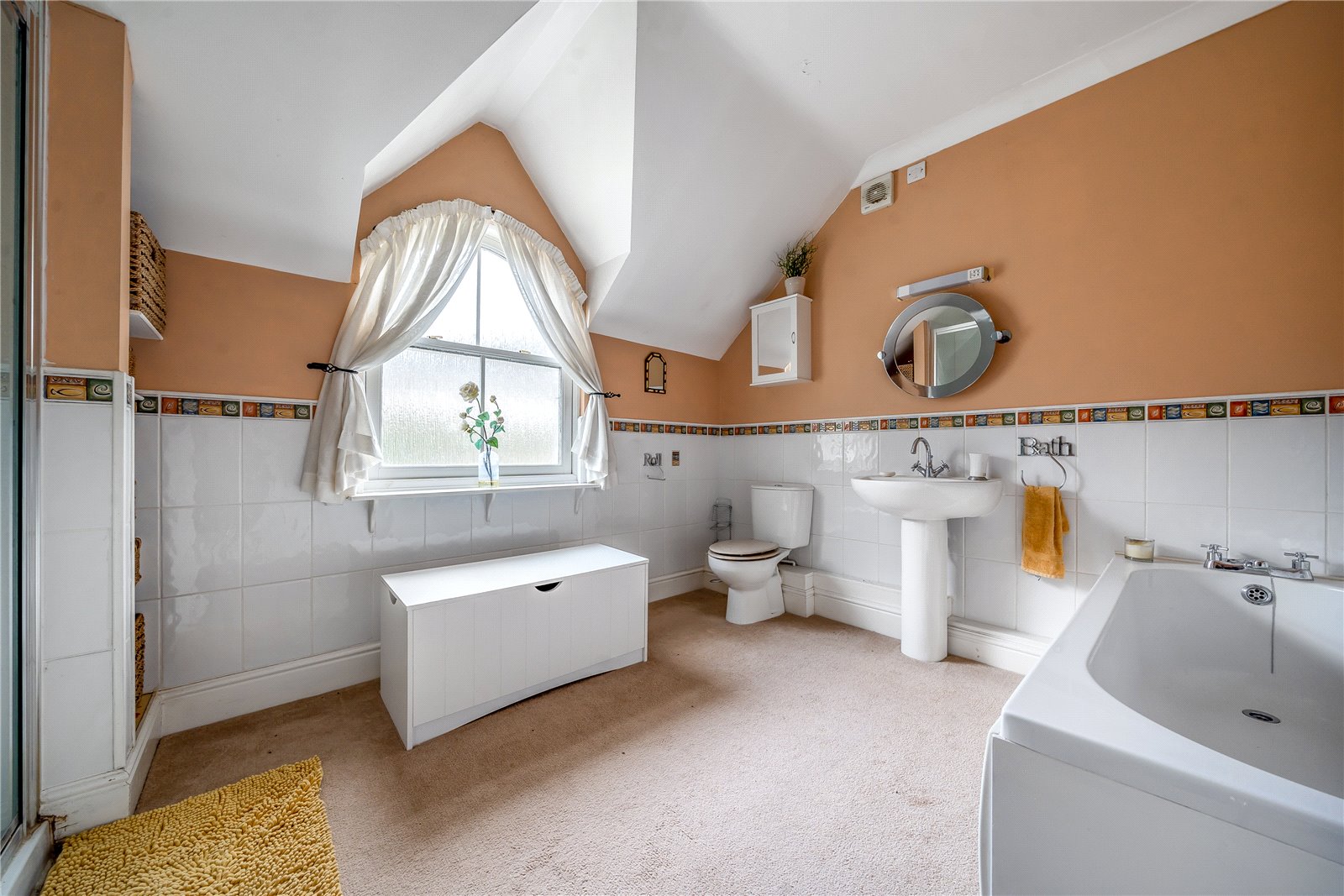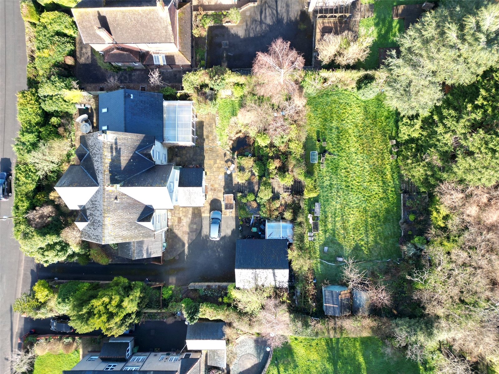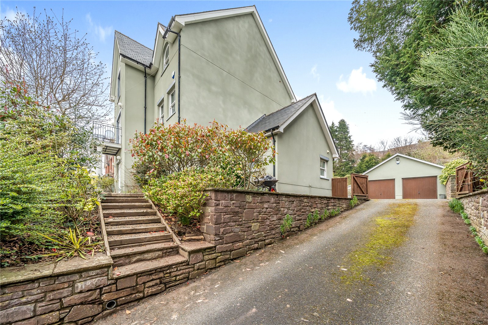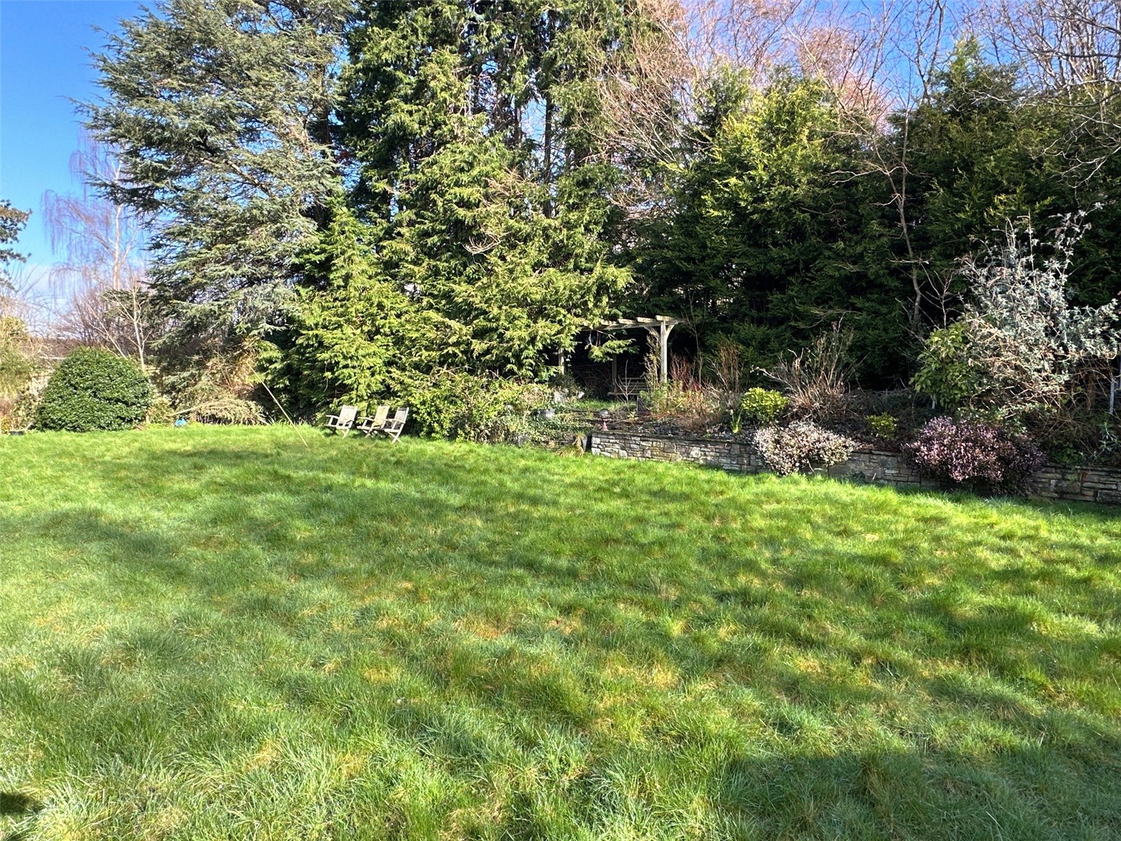 The property stands on a plot of just under 0.5 acre which includes a private driveway leading to a parking area and double garage.The grounds to the rear offer a good degree of privacy with mature shrubs and bushes and an upper lawned terrace which would make a great tennis court.