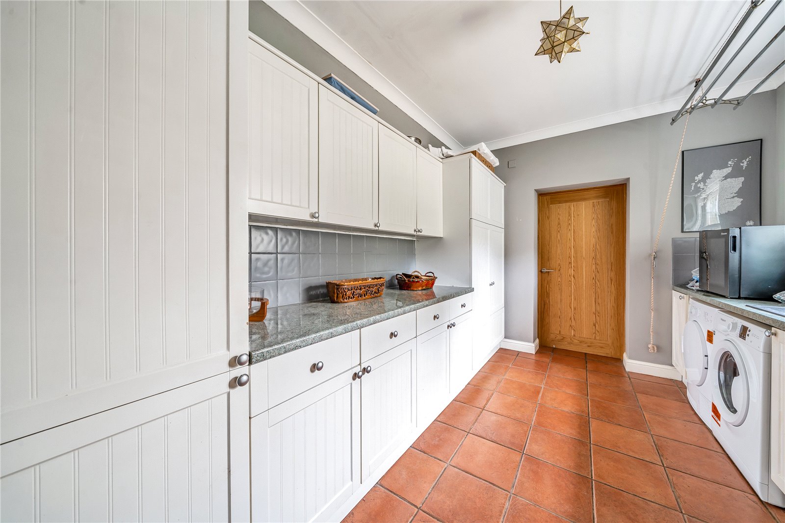 The ground floor is completed by a spacious utility room with space for various appliances; a garden room located to the rear of the lving room, an office and a ground floor WC.