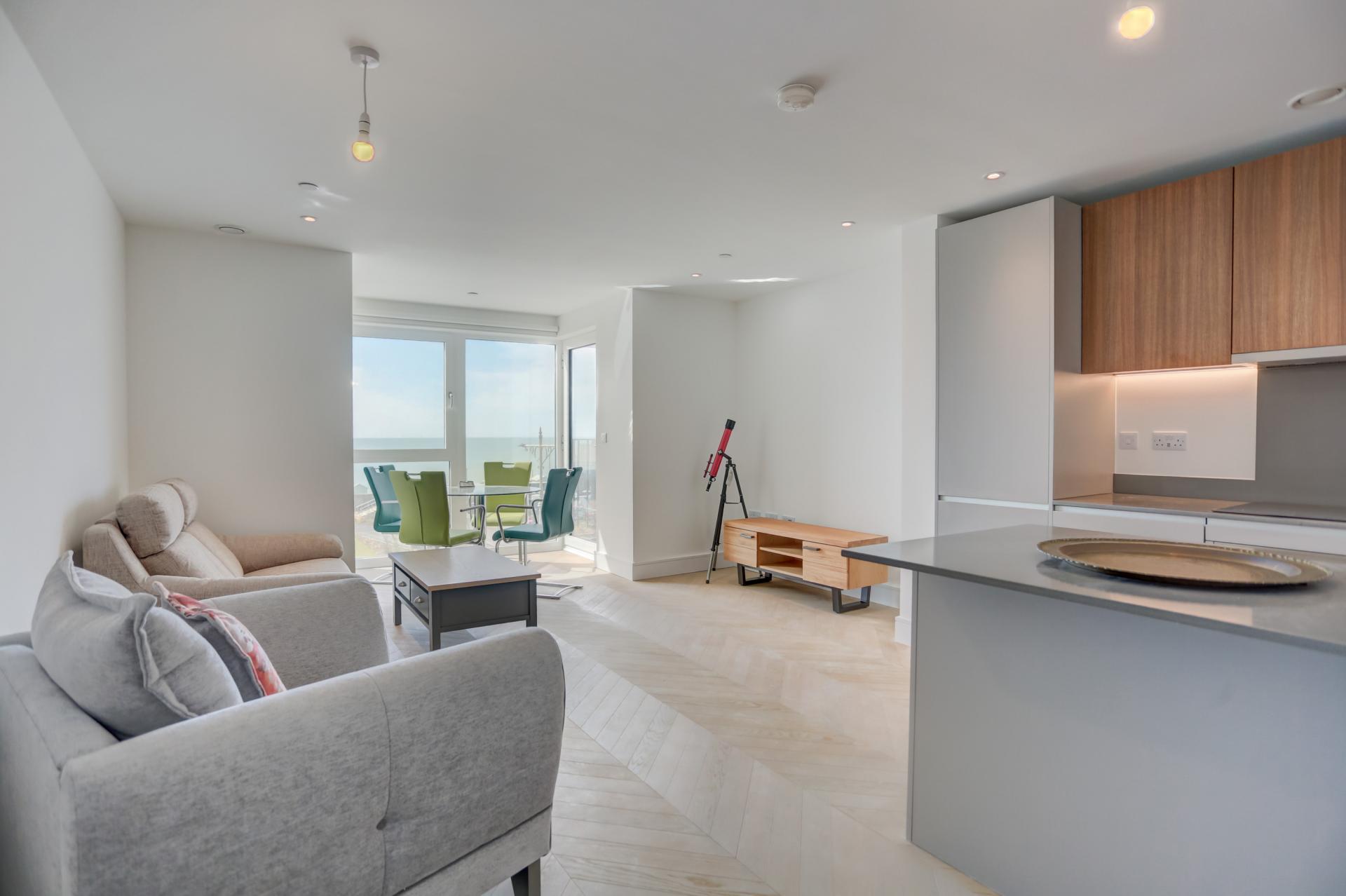A beautifully presented two-bedroom apartment offering stunning direct sea views. The property features a spacious lounge with hardwood flooring that opens onto an open-plan modern kitchen, fully fitted with an electric oven and hob, fridge/freezer, washer/dryer and slimline dishwasher. The master bedroom is generously sized and benefits from fitted wardrobes and an en-suite shower room. There is also a second good-sized double bedroom with sea views and access to a balcony, as well as a separate modern bathroom with both a bath and shower. Additional benefits include underfloor heating throughout and an underground parking space (25). In the basement you will find recycling bins, bike storage and electric charging points.