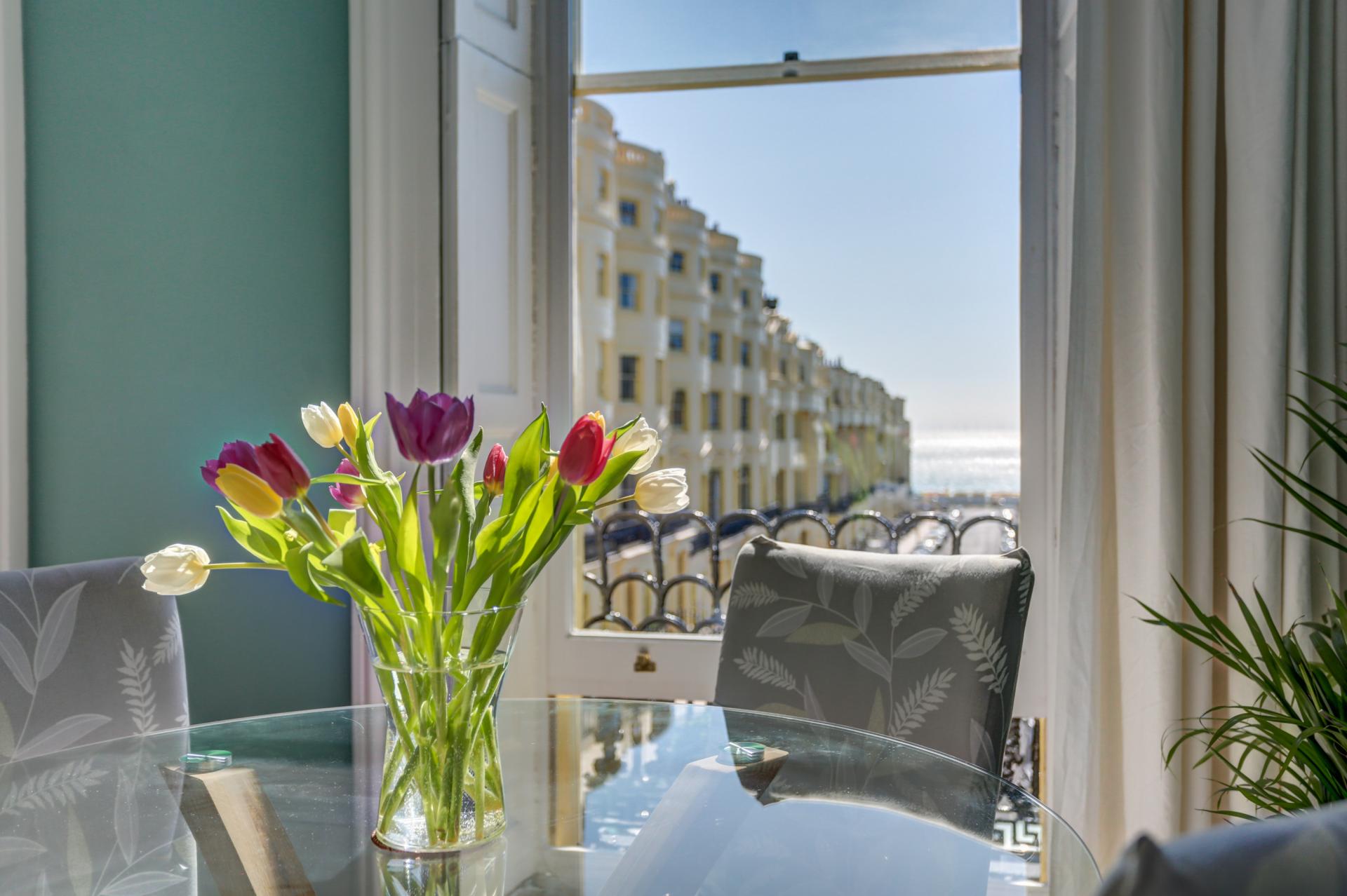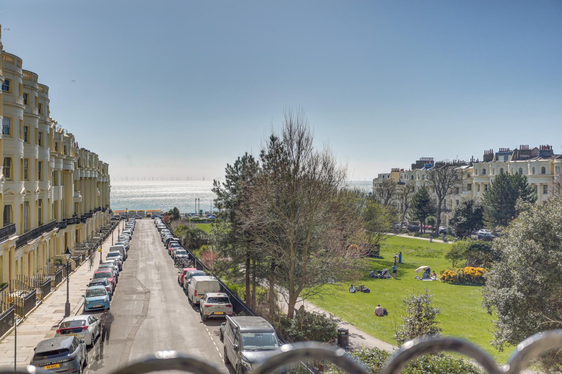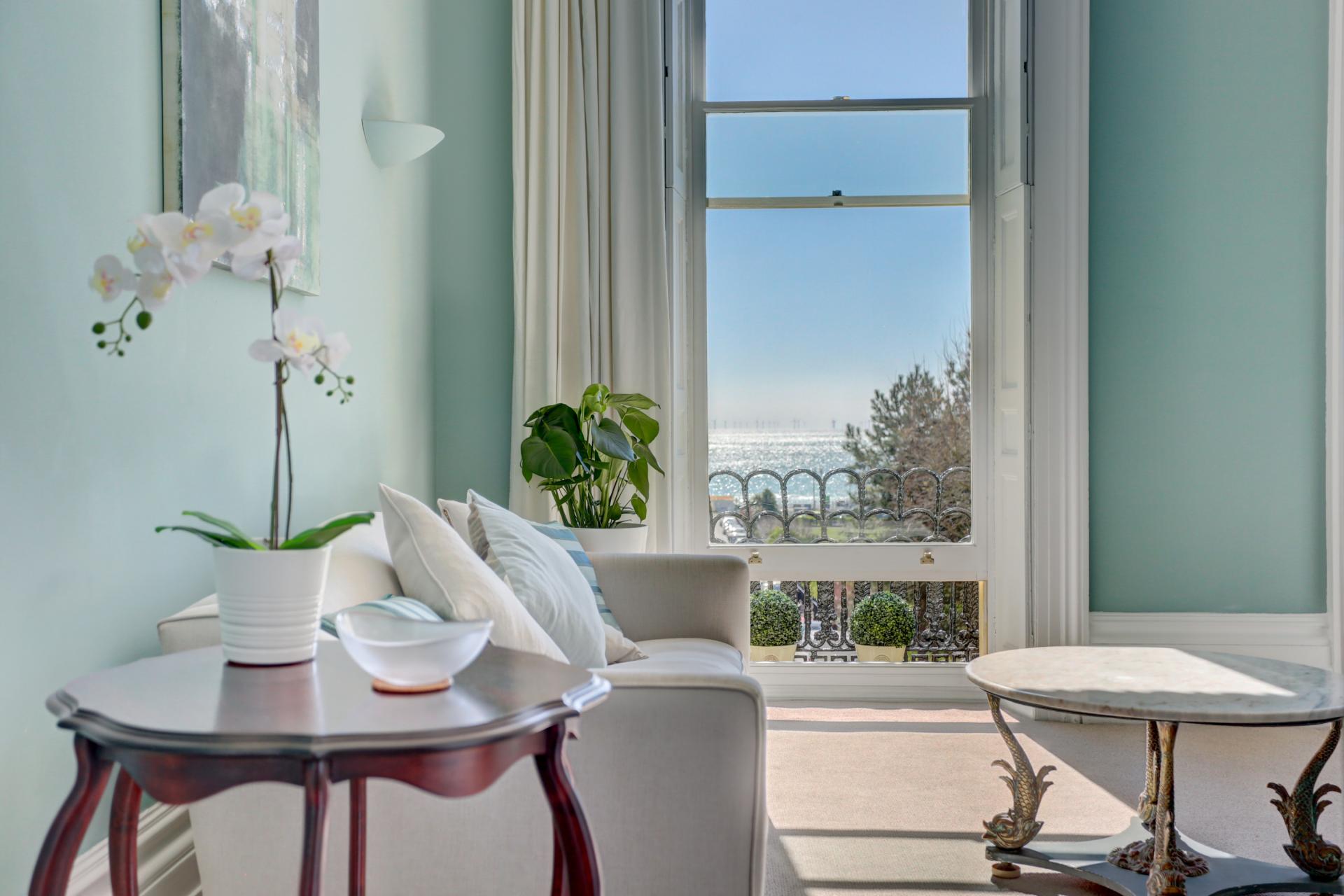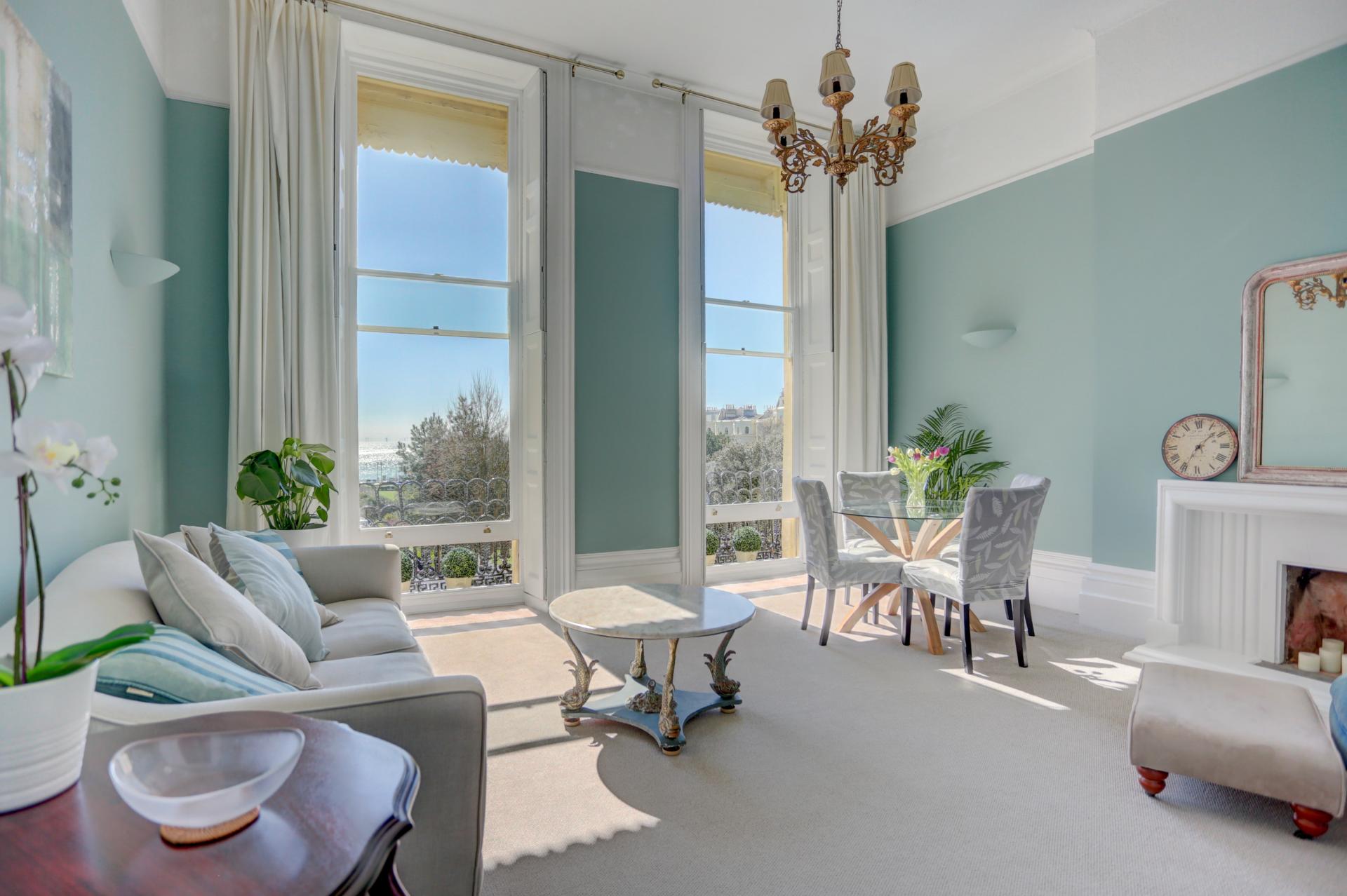 Floor to ceiling sash windows of the grand living room connects the apartment to the sea views and exceptional architecture of the uniformly painted cream Stucco-fronted, elegant properties of historic Brunswick Square. Detailed wrought iron balconettes allow for decorative flowerpots. sympathetic tones of soft eggshell and crip white décor highlight the exemplary tall ceilings.