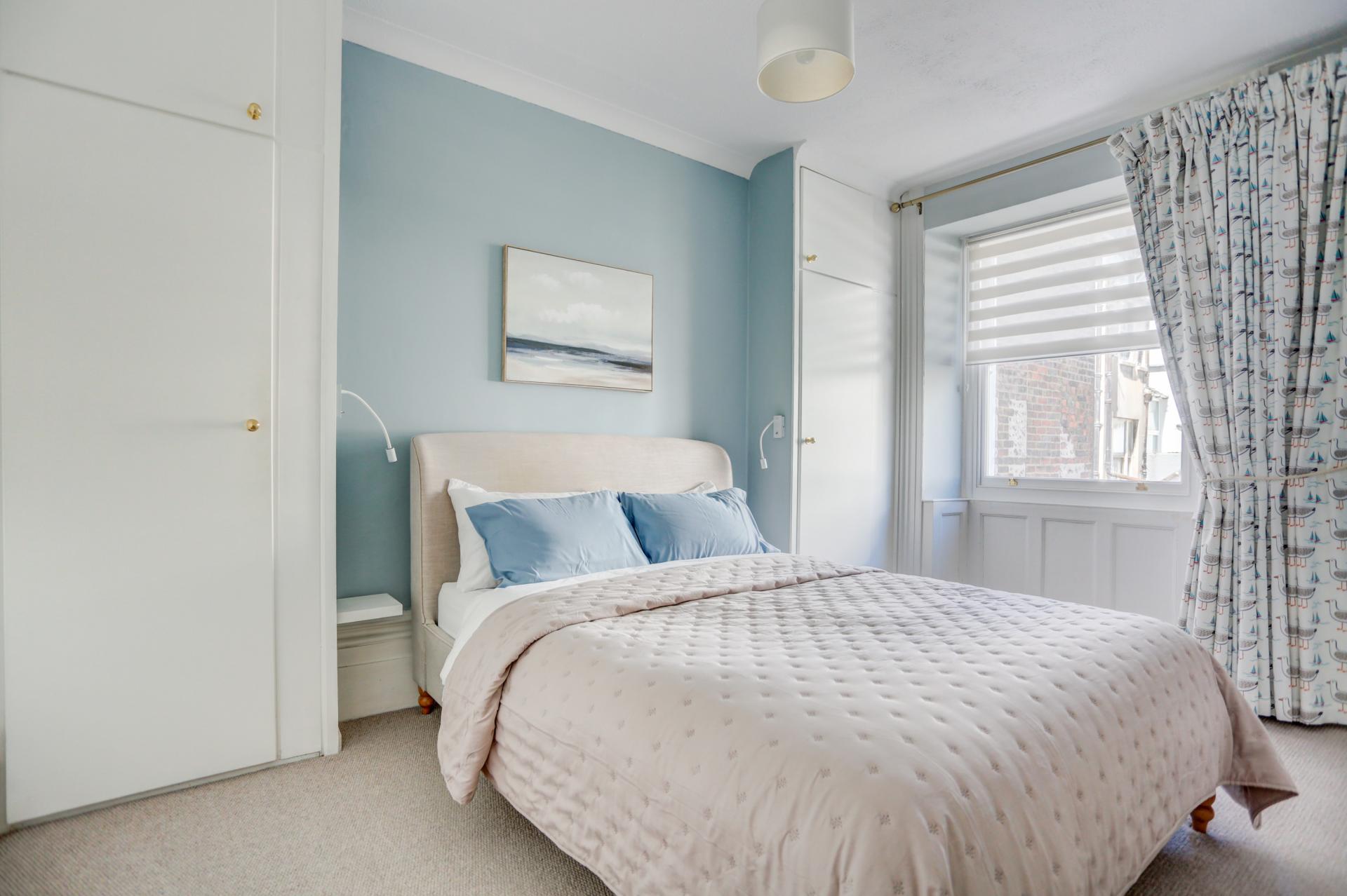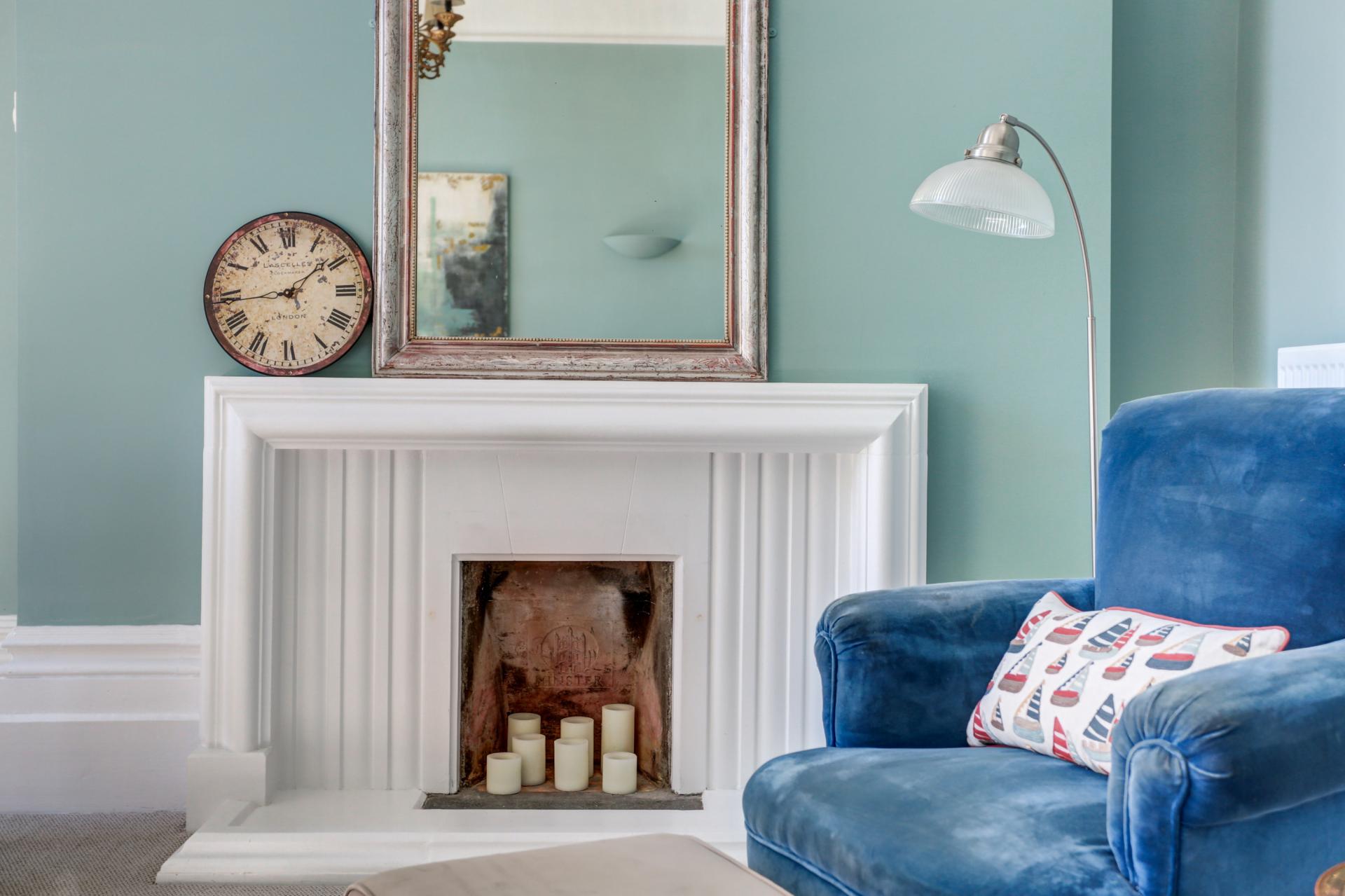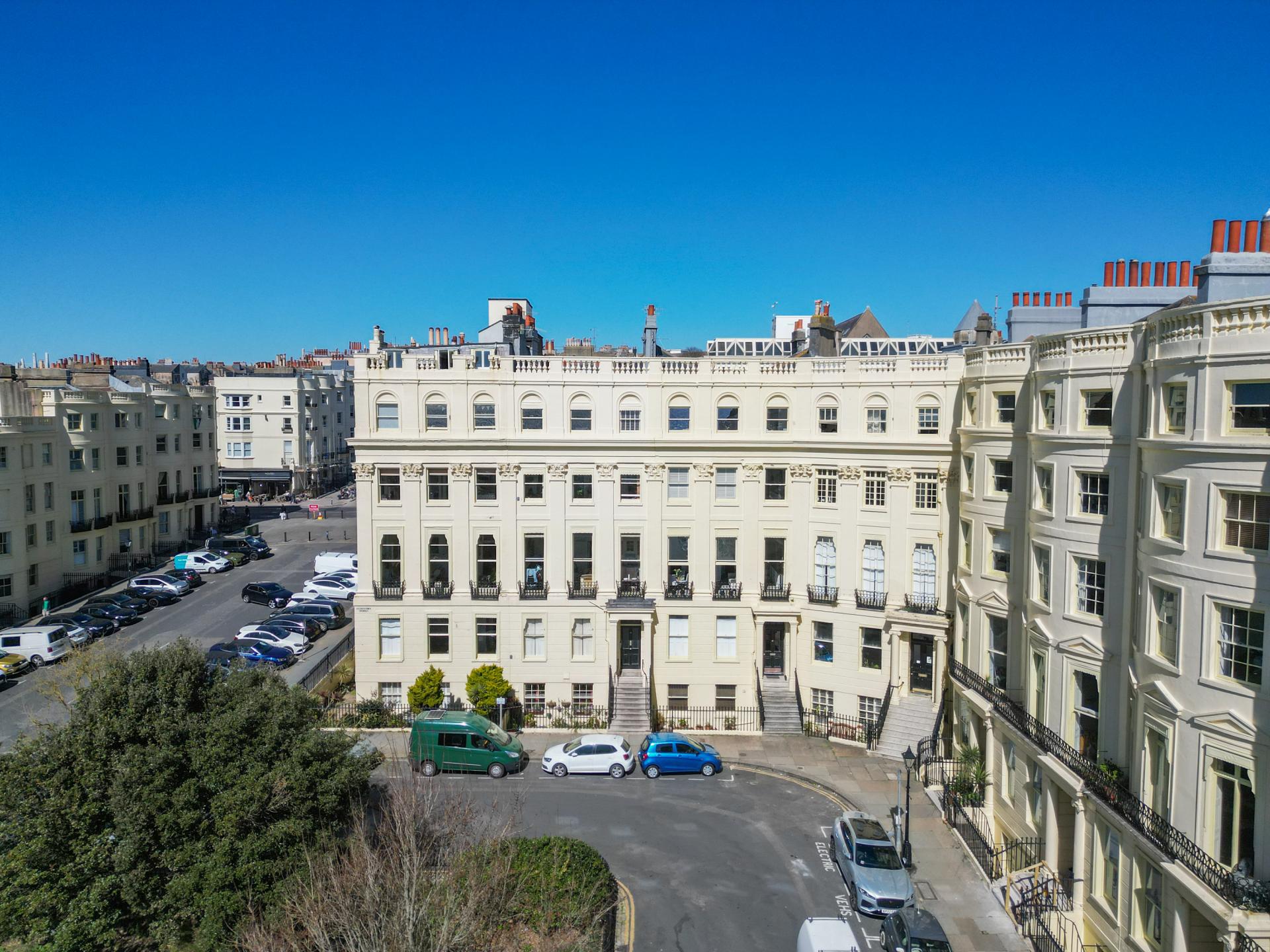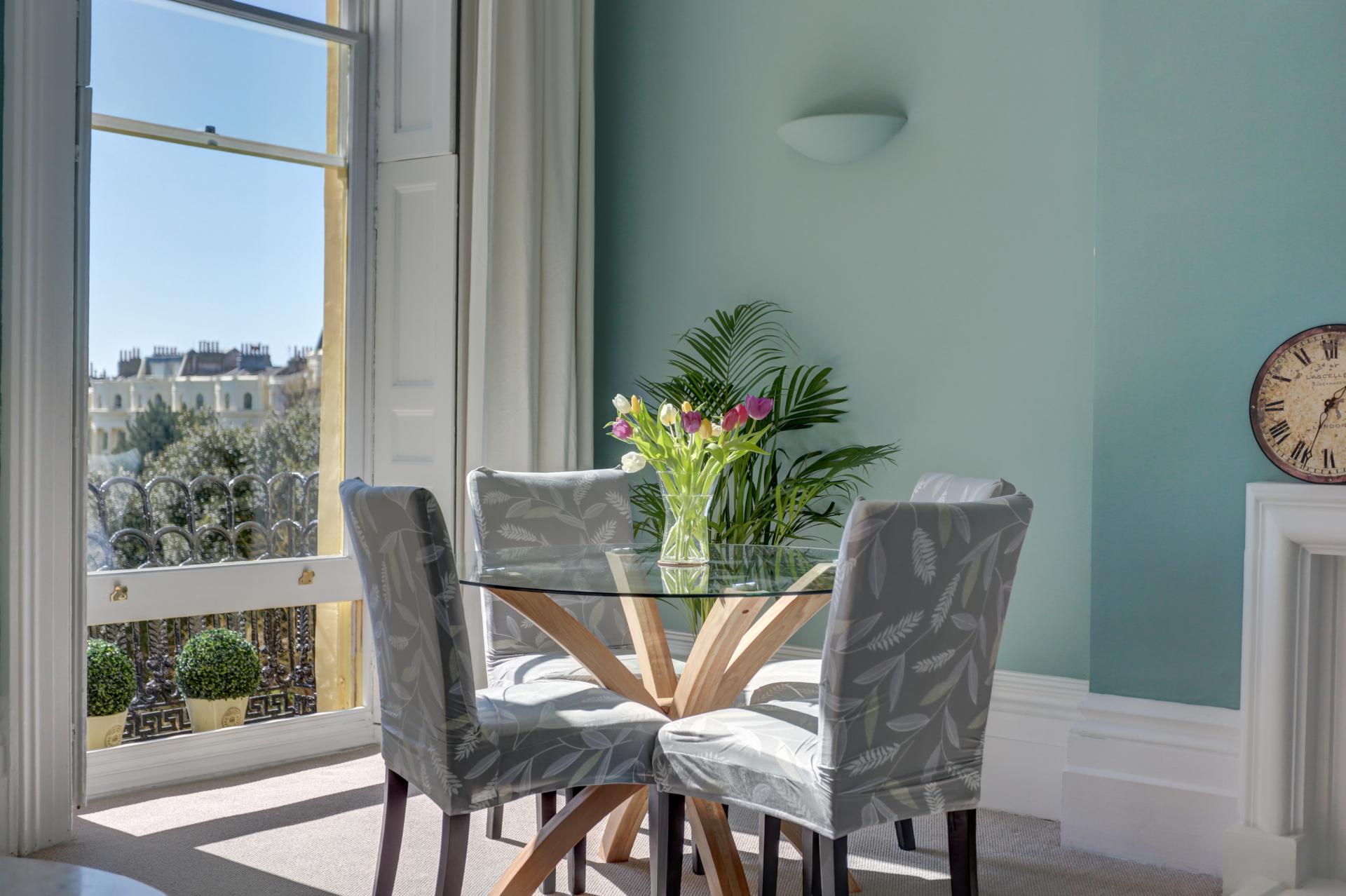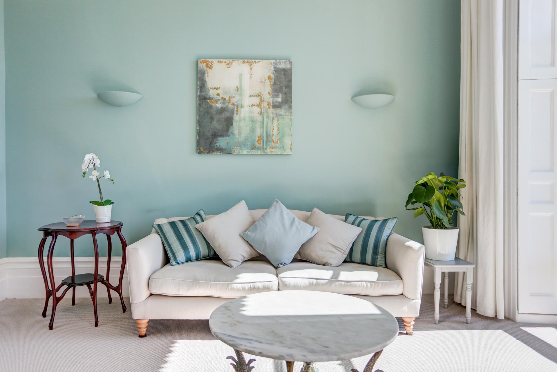 Floor to ceiling sash windows of the grand living room connects the apartment to the sea views and exceptional architecture of the uniformly painted cream Stucco-fronted, elegant properties of historic Brunswick Square. Detailed wrought iron balconettes allow for decorative flowerpots. sympathetic tones of soft eggshell and crip white décor highlight the exemplary tall ceilings.