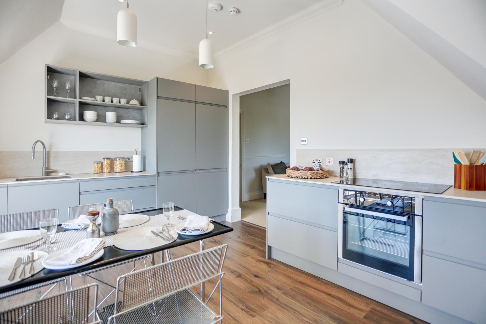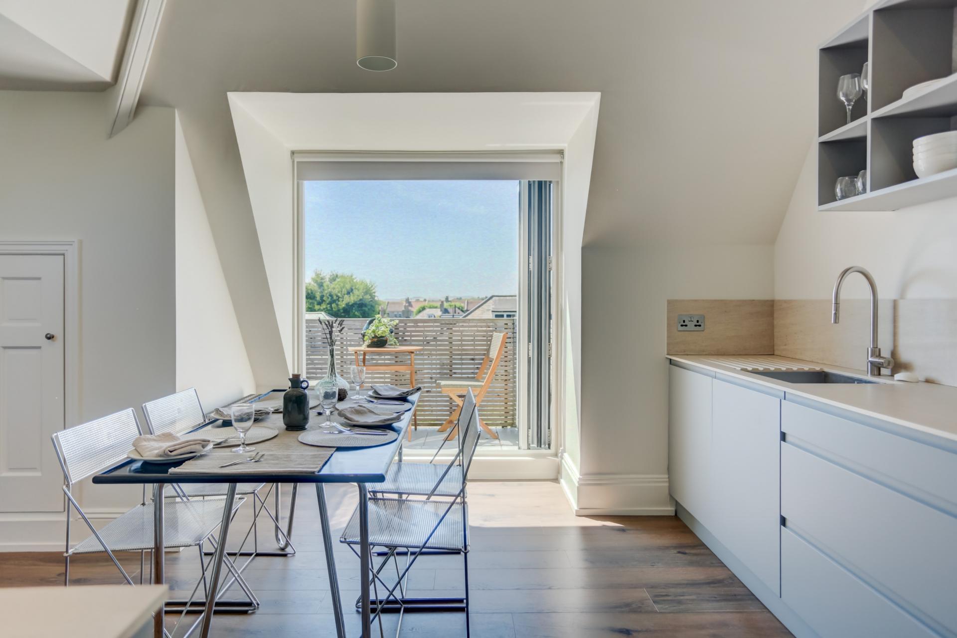 The double-aspect lounge features an East-facing balcony accessed through characterful arched doors, while the kitchen and dining area boast sleek contemporary cabinetry in a matte grey finish and are fully equipped with integrated appliances. From here, the West-facing balcony offers captivating sea views, perfect for taking in a stunning sunset.