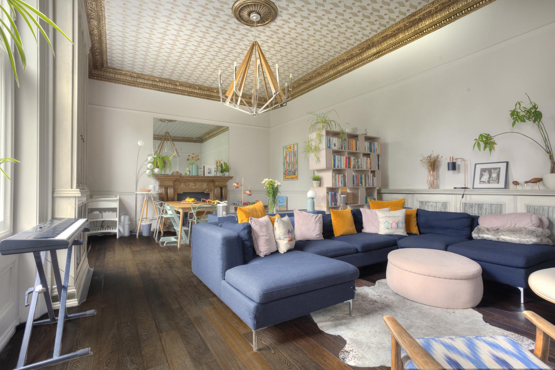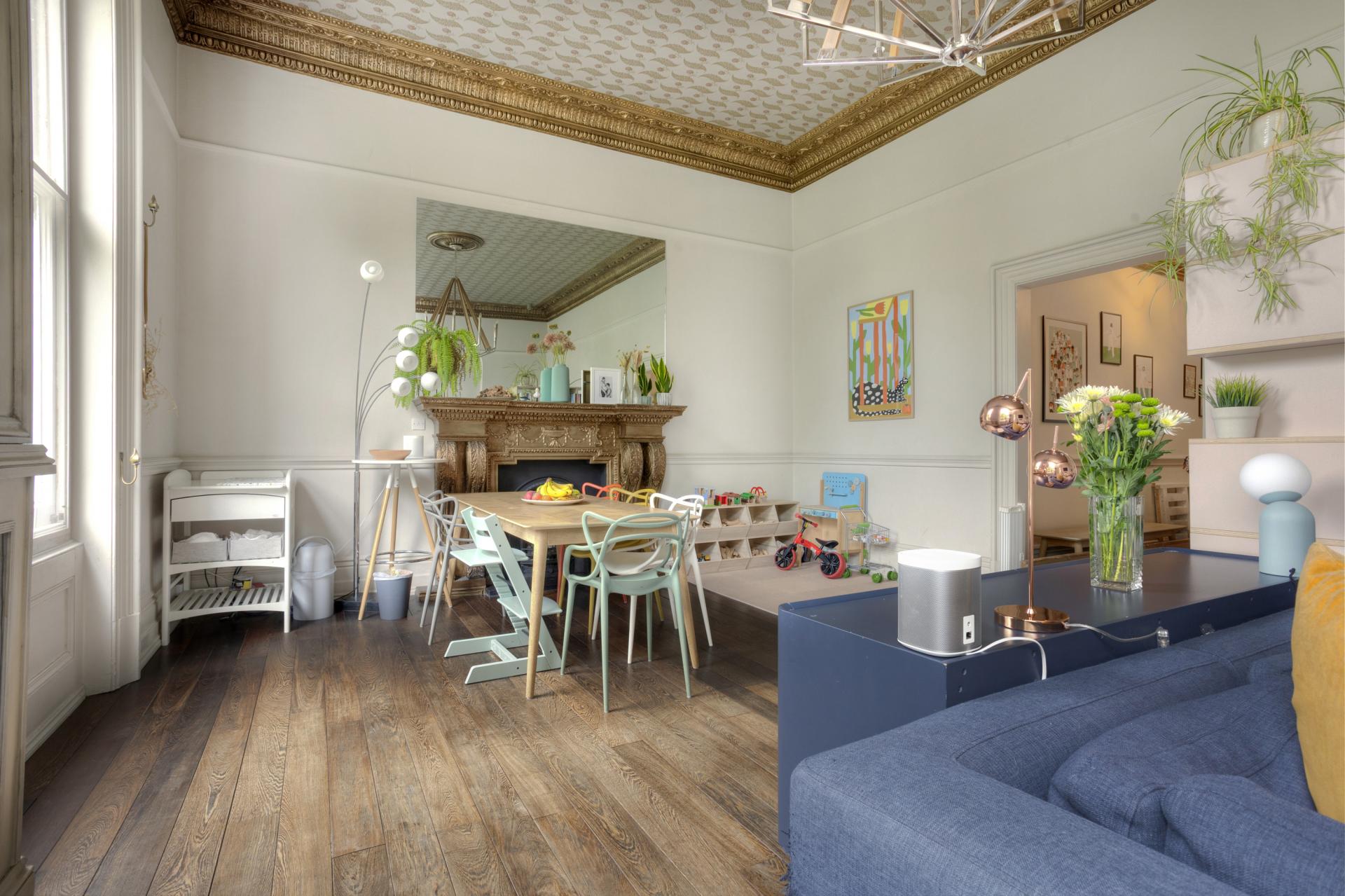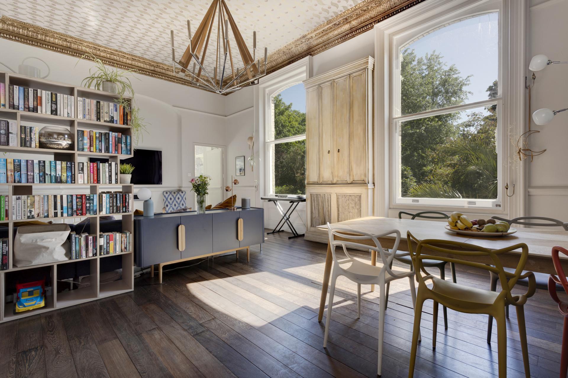 With generous proportions extending across the ground floor, the interior has been impeccably curated to marry modern aesthetics with timeless Victorian charm. Towering sash windows, ornate cornicing, and original fireplaces sit harmoniously alongside sleek contemporary finishes, while lofty ceilings amplify the sense of space and light. A beautifully maintained private walled garden provides a serene retreat, complemented by the rare convenience of an allocated off-street parking space.