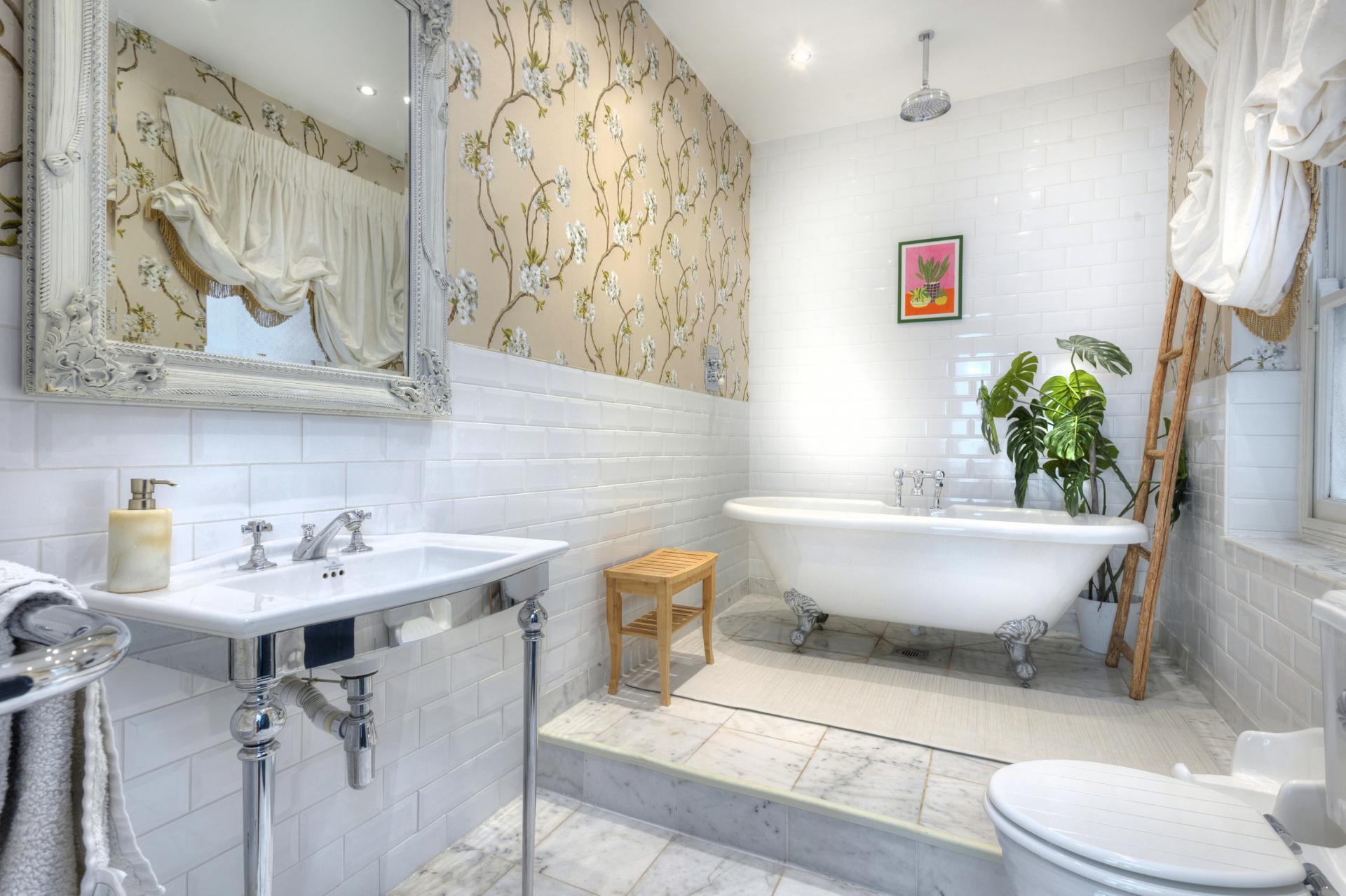 The second double bedroom, equally impressive in scale and finish, features another generous bay window overlooking the treetops beyond. Decorative architraves accentuate the ceiling height, the ensuite bathroom is finished with a freestanding roll-top bath, decorative wallpaper and marble flooring. This space is ideal for guest accommodation or as a sophisticated family bedroom.