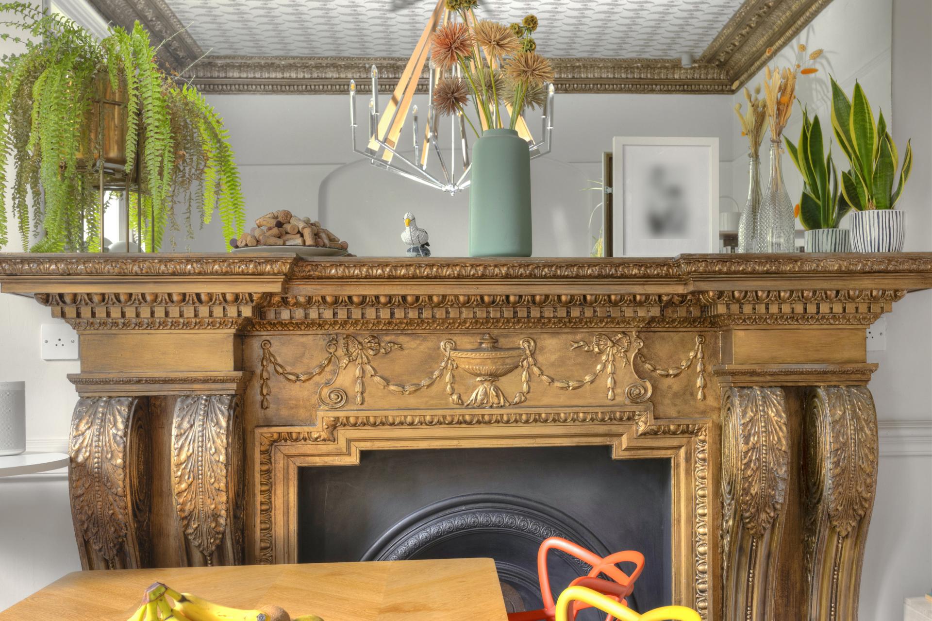 The expansive living/dining room is a showpiece in both scale and style, adorned with intricate gold-accented cornices and a magnificent fireplace. Twin sash windows frame leafy garden views, bathing the space in natural light and further enhancing its ambience. Traditional dado and picture rails add depth and dimension, while engineered wood flooring flows gracefully throughout much of the home, enriching the refined atmosphere.
