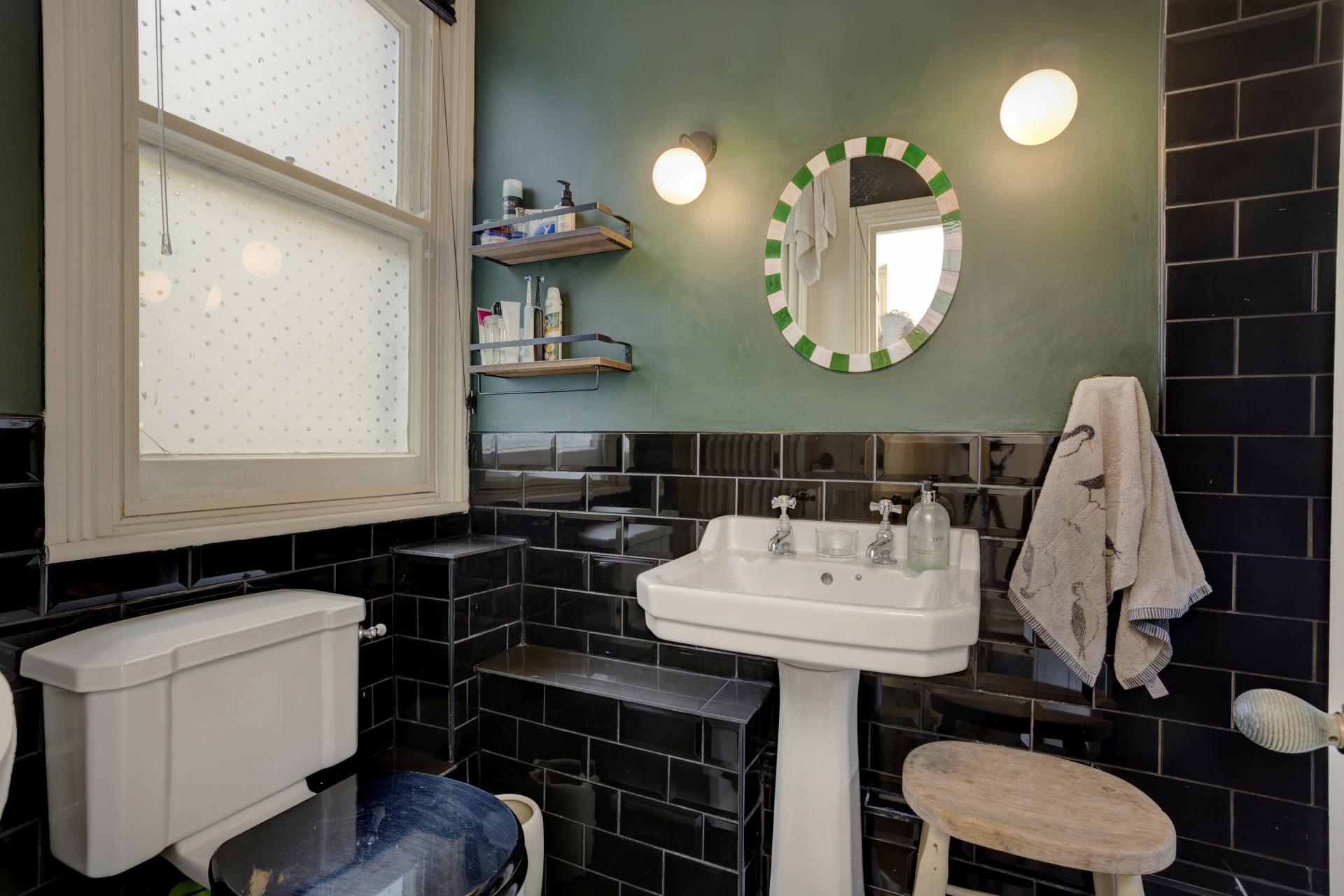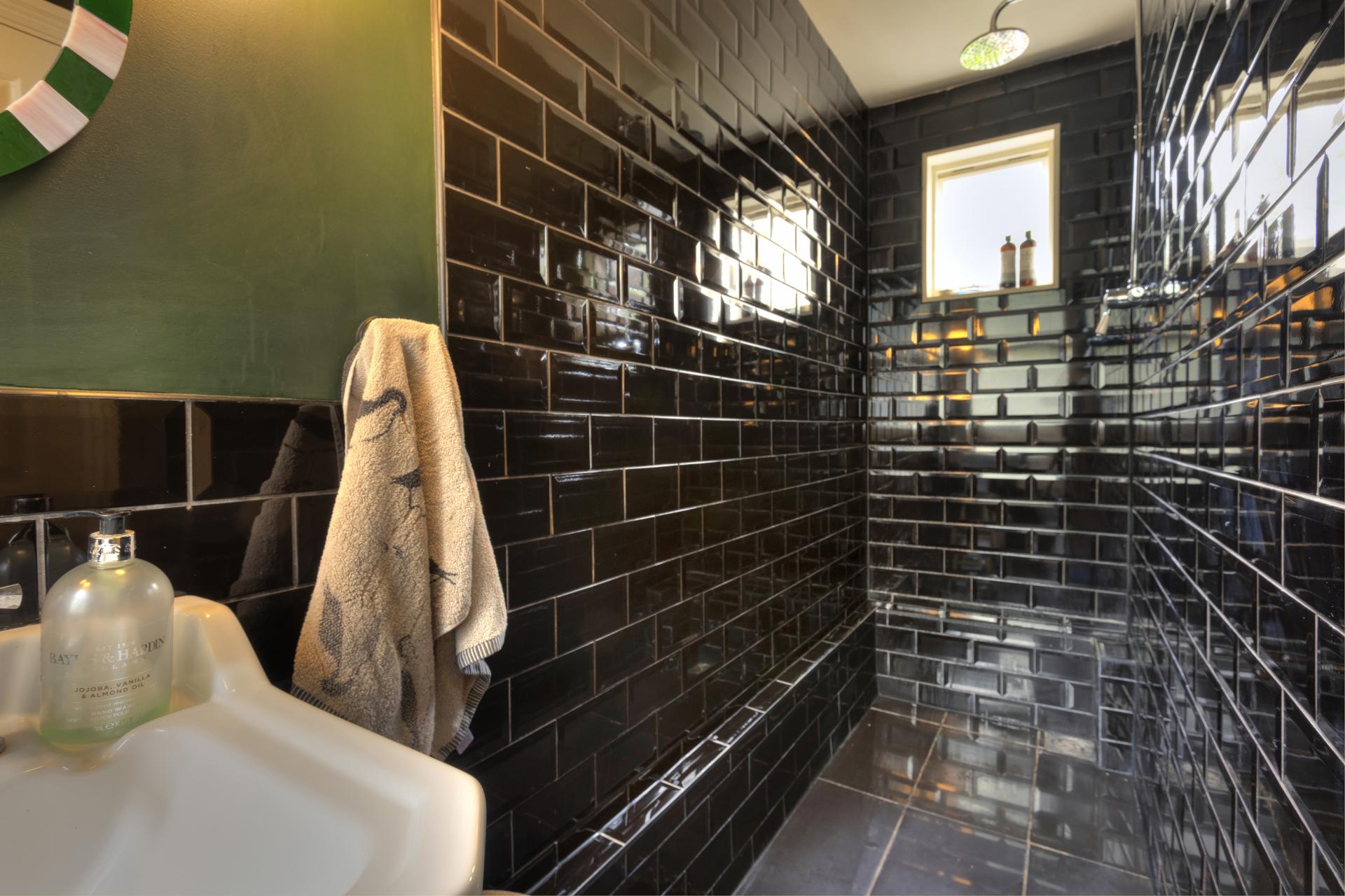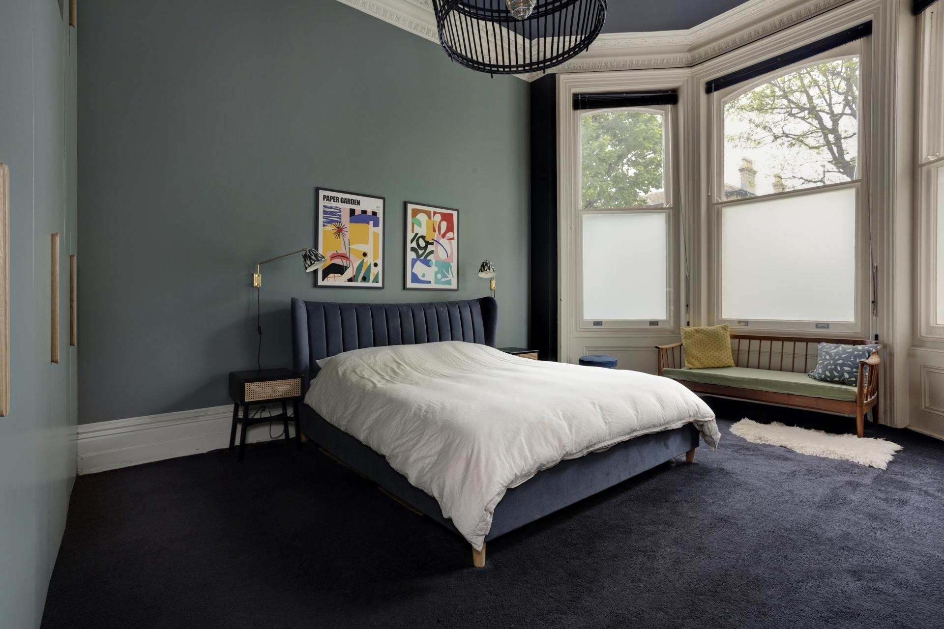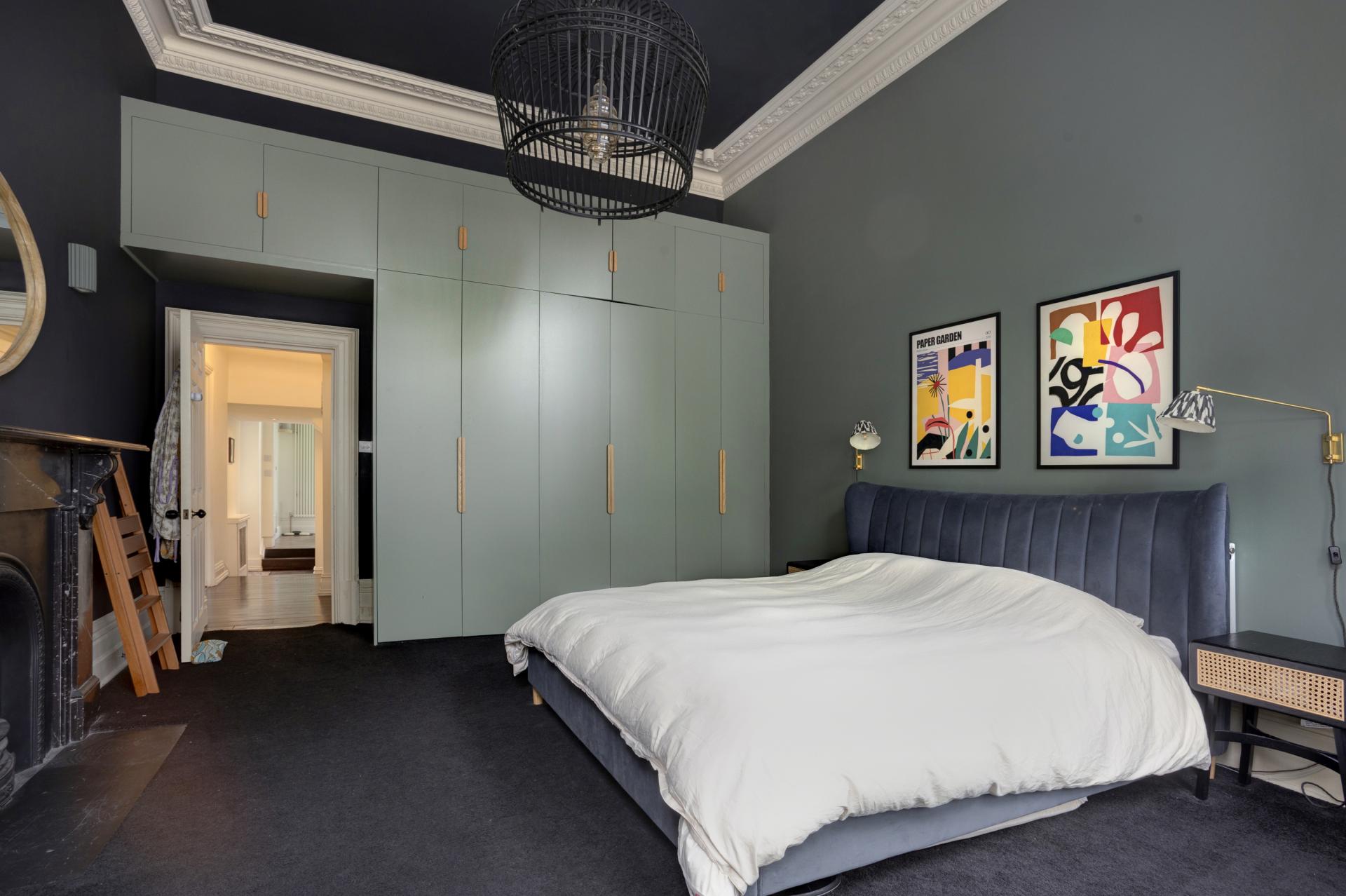 The principal bedroom exudes a sense of indulgence, with dark carpets underfoot, walls finished in rich Farrow & Ball tones and an exquisite marble fireplace as a focal point. A bay-fronted sash window invites abundant daylight, while bespoke wardrobes deliver extensive storage. A useful adjoining ensuite wet room is fitted with jet-black metro tiles and a rainfall shower for convenience.