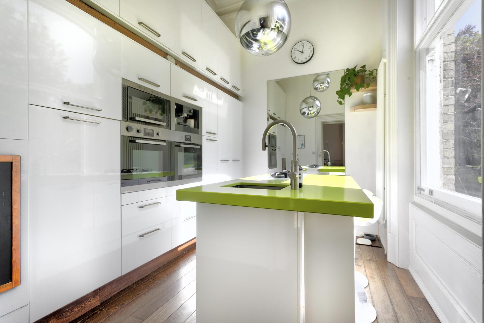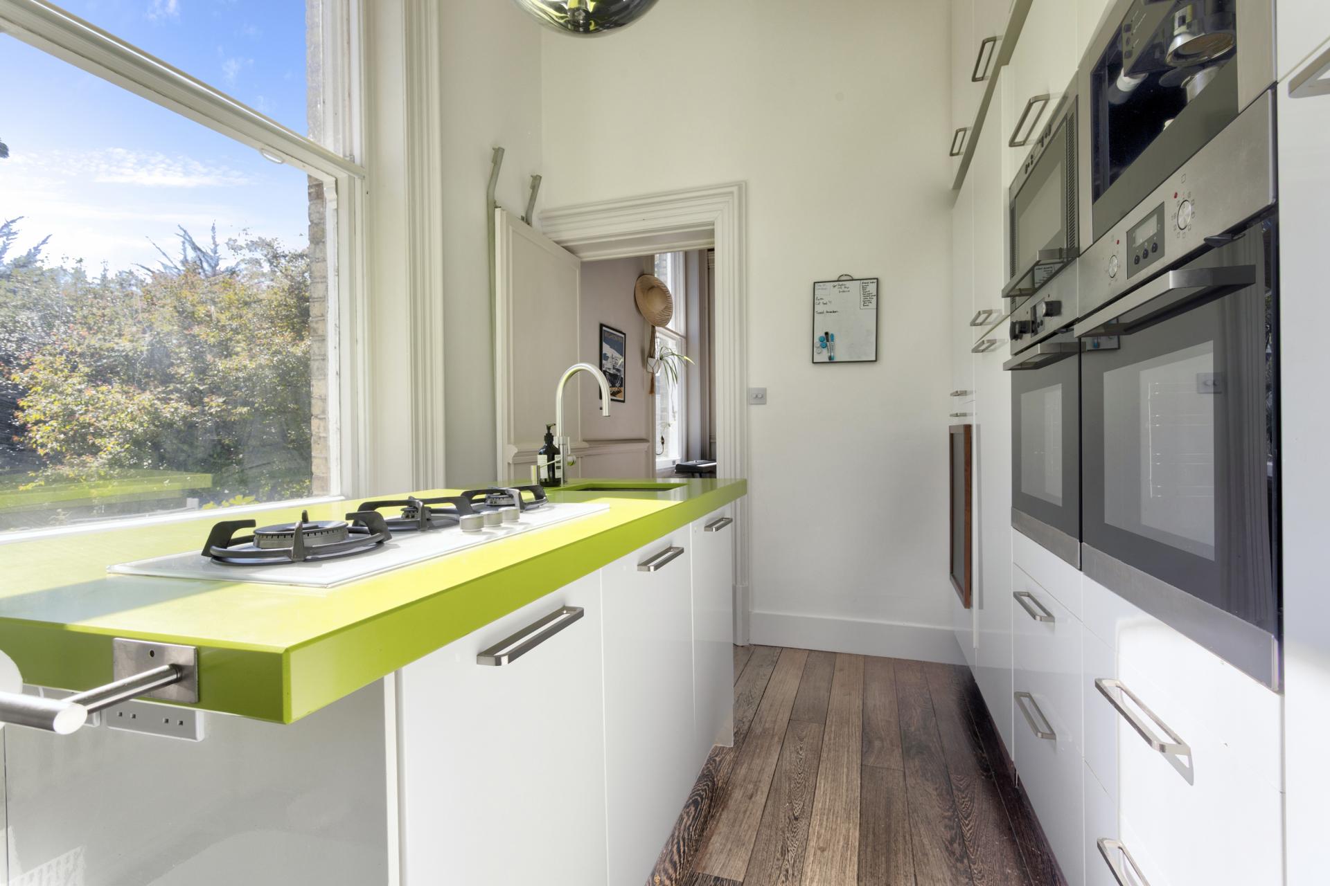 The living room connects with the adjoining kitchen, a where full-height cabinetry conceals a suite of integrated appliances. A lime-green countertop adds a bold flourish atop the central island, which doubles as a stylish breakfast bar, infusing the room with a touch of vibrancy. Connecting the kitchen to the second bedroom a hallway houses a utility cupboard with space for washing machine and household cleaning tools with ample storage.