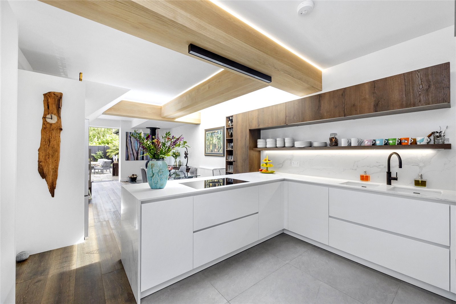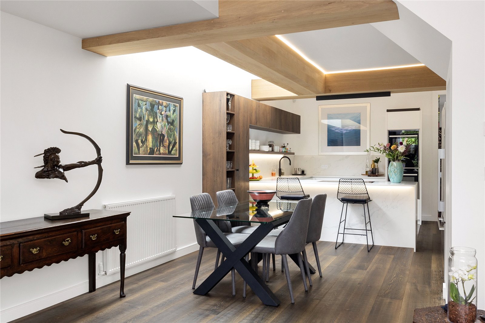 Upon entering the property via the entrance hall, an ingenious space saving pocket door leads directly into the considerable open plan kitchen, dining and sitting room. Fastidious attention to detail has been given to this entirely welcoming space.