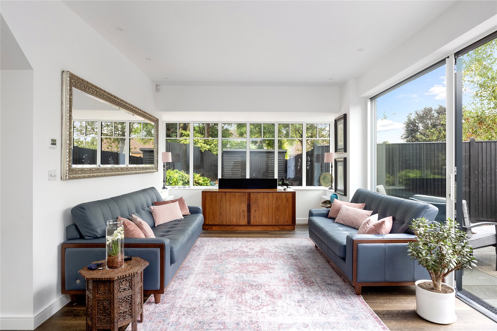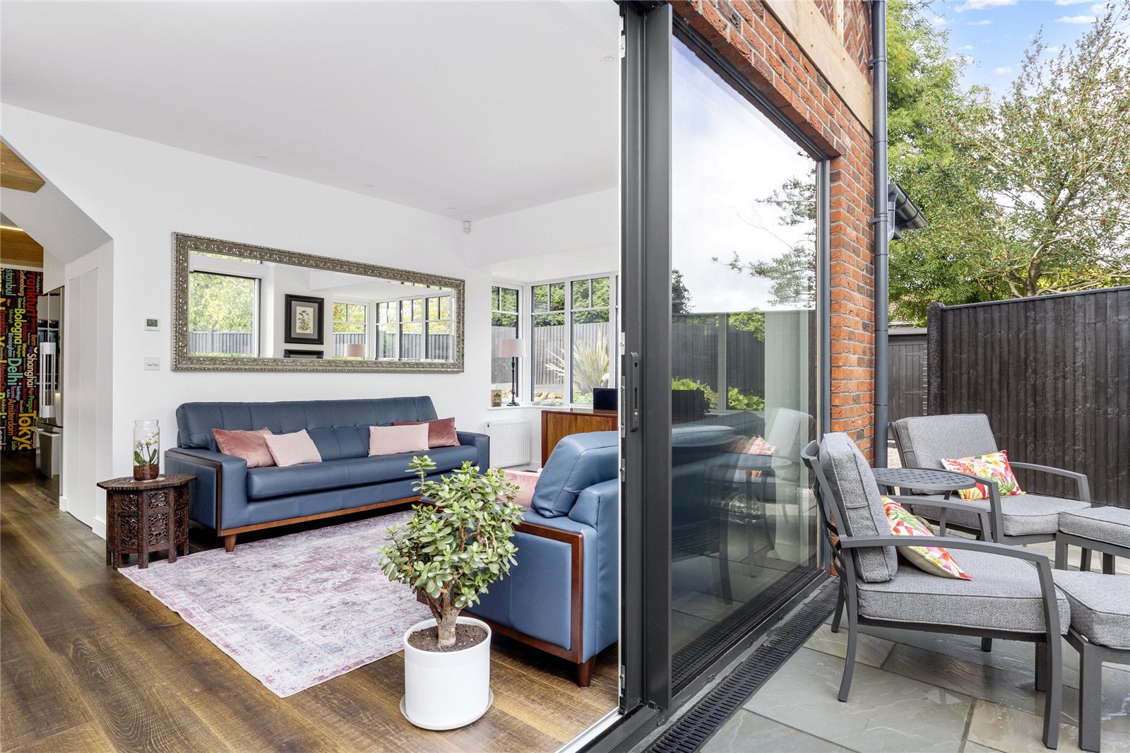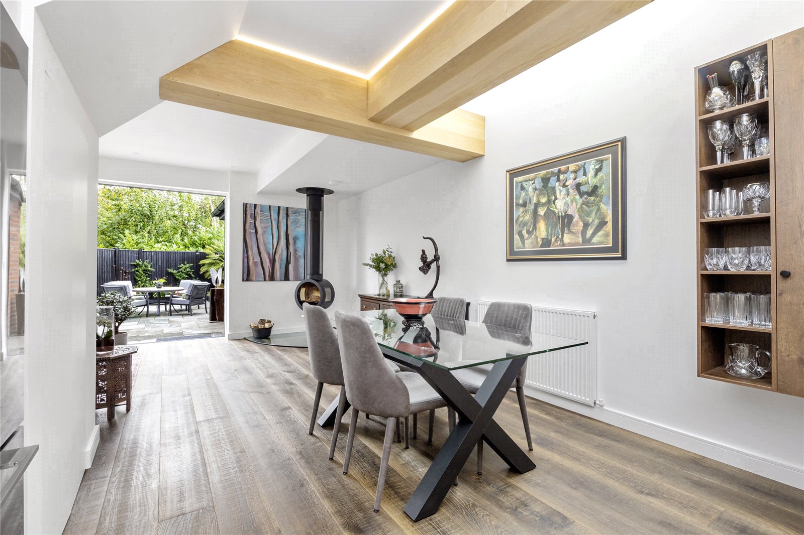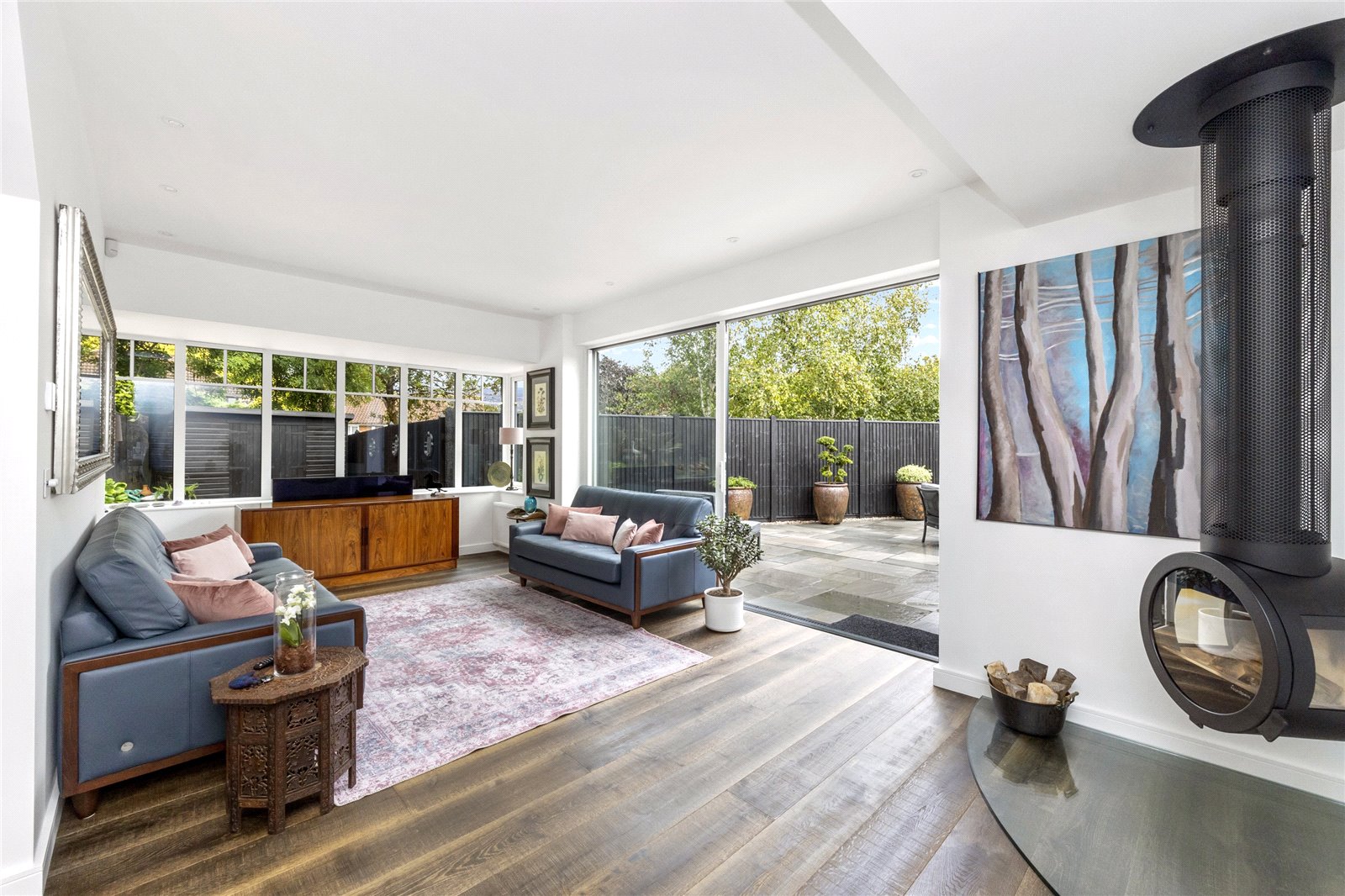 The room leads effortlessly on to the dining area, suitably placed near the gorgeous suspended log burning stove and patio doors which open out to the garden; the space is perfect for entertaining all year round. A relaxed sitting area is framed on one side by a large full width window and on the other sliding doors.