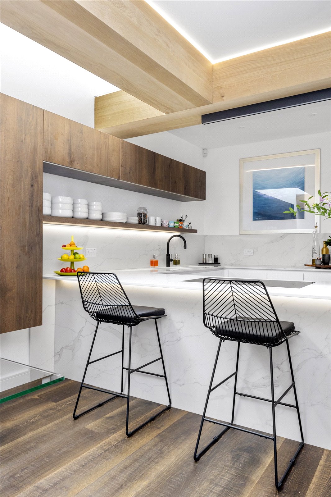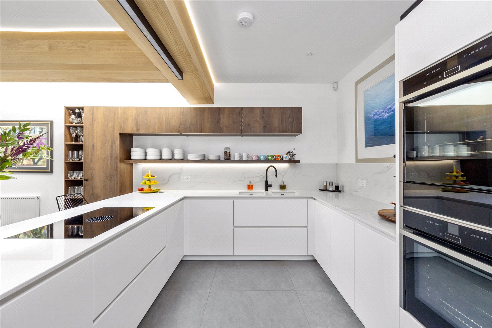 The state-of-the-art kitchen, features a handleless design of vogueish proportions and is fully fitted with all the opulence of smart living. A fantastic range of wall mounted and under counter cupboards wrap around this part of the room in a classic u-shape, achieving a flush finish providing discrete space for kitchenware and produce.