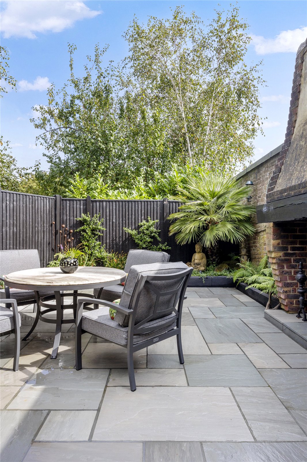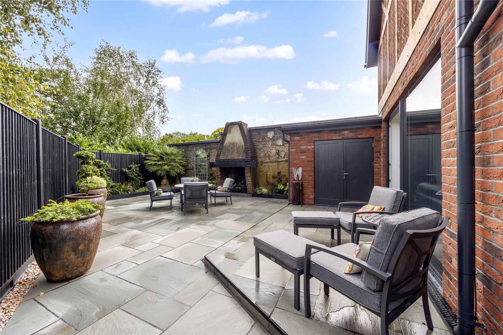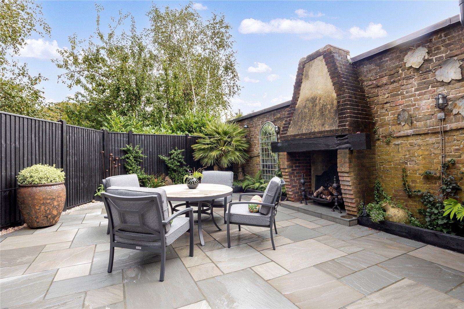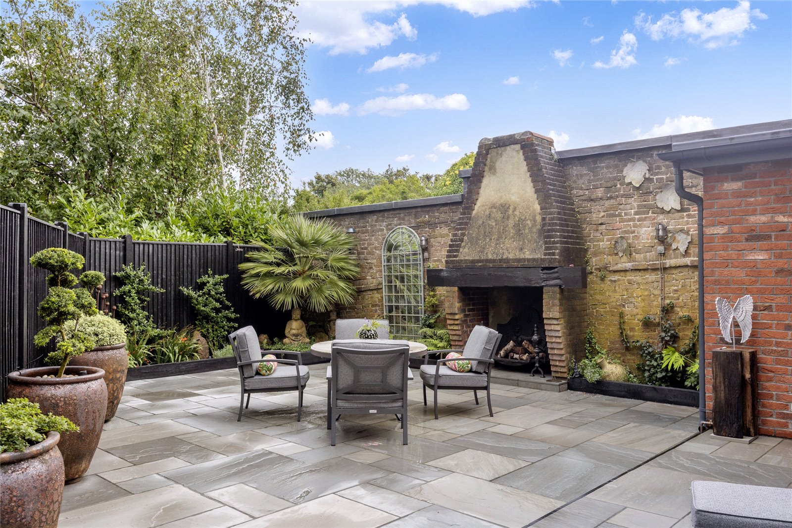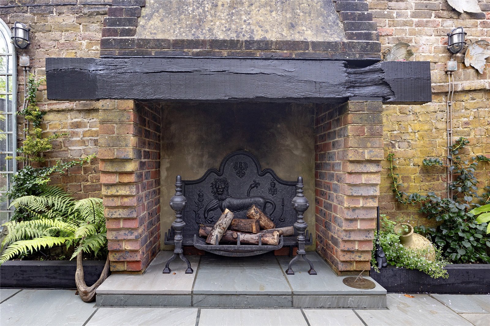 An elegant rear patio garden is beautifully set out in front of a remarkable period fireplace and chimney breast; in short, an idyllic spot for entertaining or relaxing no matter the season.