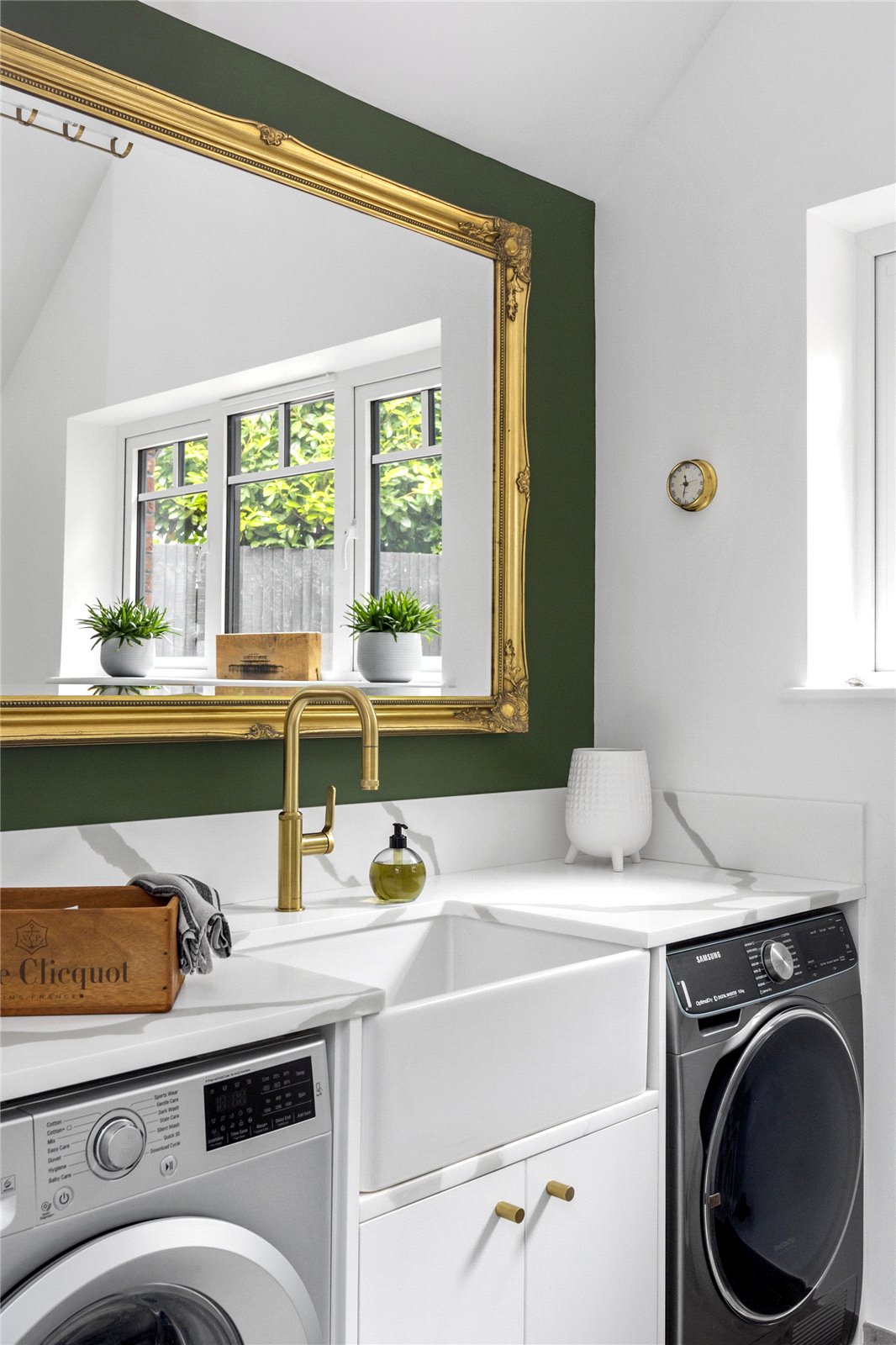 To the front is a second reception room, currently occupied as a snug but could equally be used as a third bedroom, is again decorated in an immaculate shade of white. Adjacent is an invaluable utility room and ground floor shower room with a full-sized Belfast sink, plumbing for a washing machine and separate dryer, ample countertop space, and a contemporary walk-in shower and w/c.
