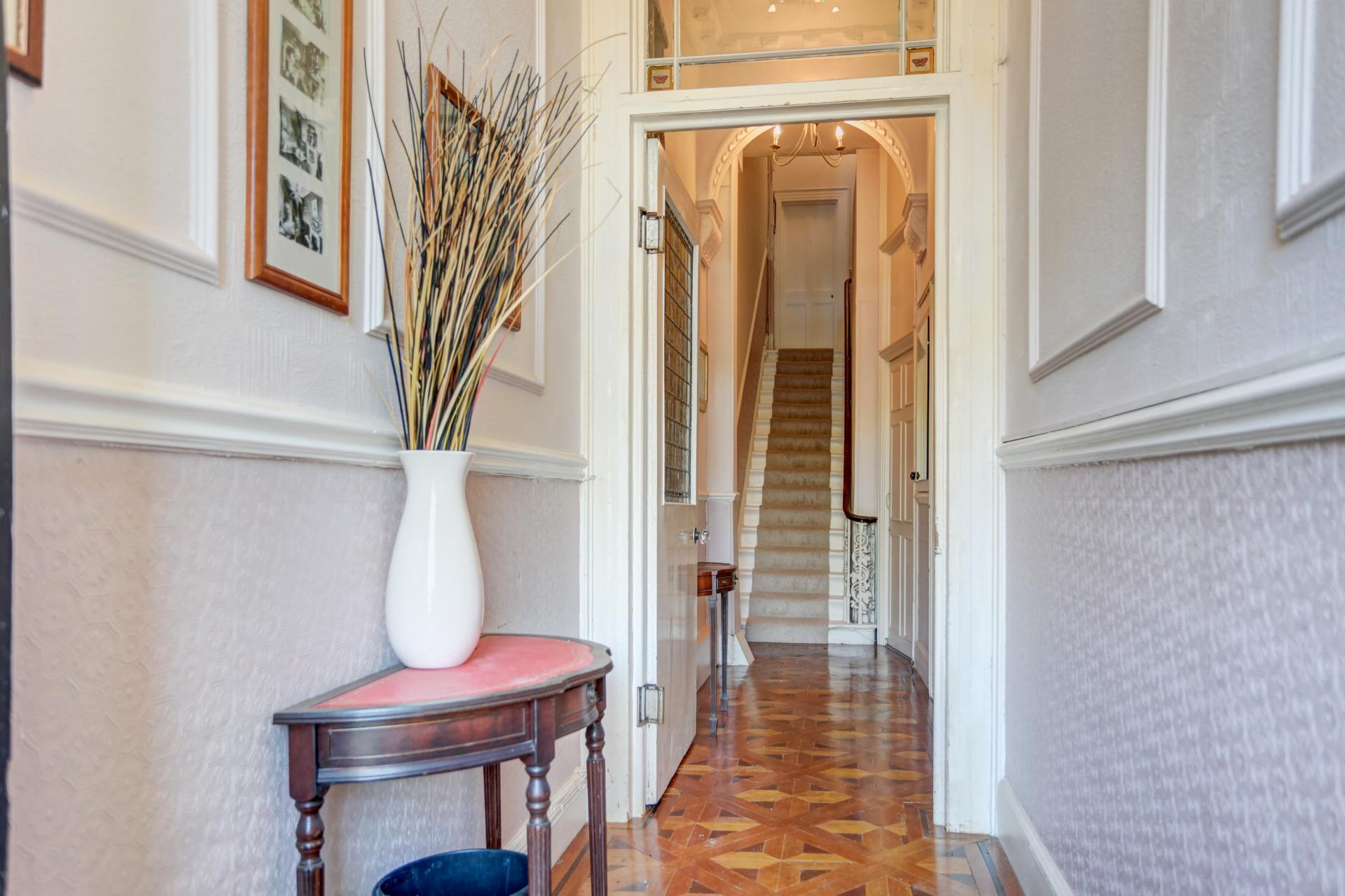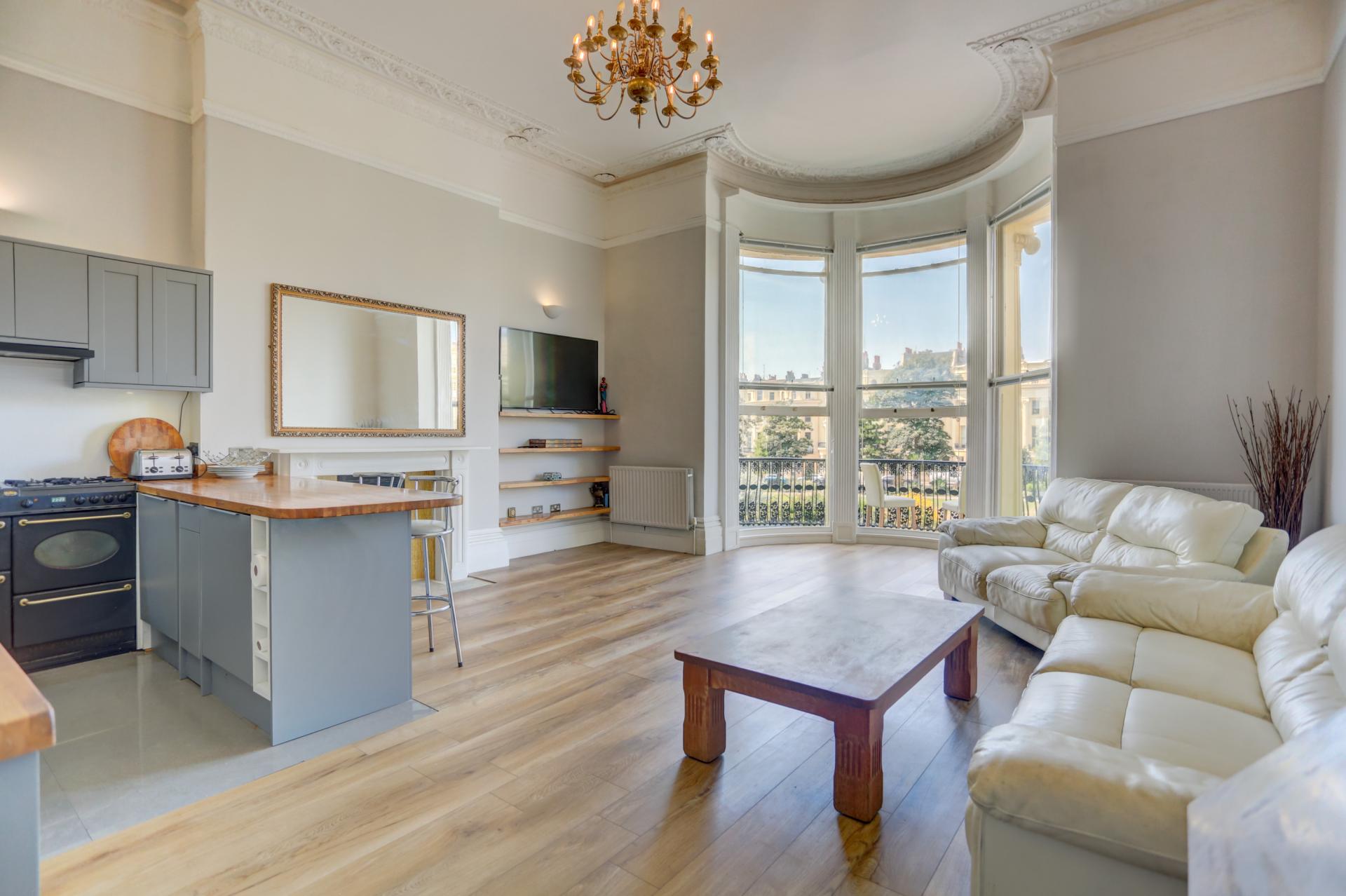 This is an elegant apartment with an abundance of original features, subtly updated to accommodate contemporary living. Neutral interior decor sits well with the period detailing of high, intricately corniced ceilings, traditional fireplace surround and striking floor-to-ceiling, sash bay windows leading out to a curved balcony.