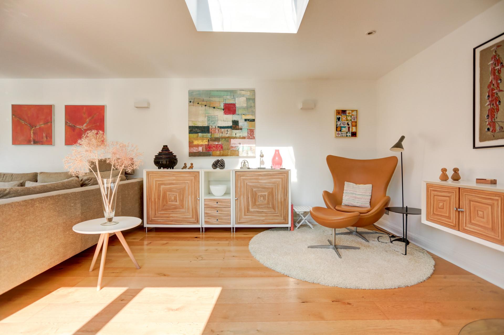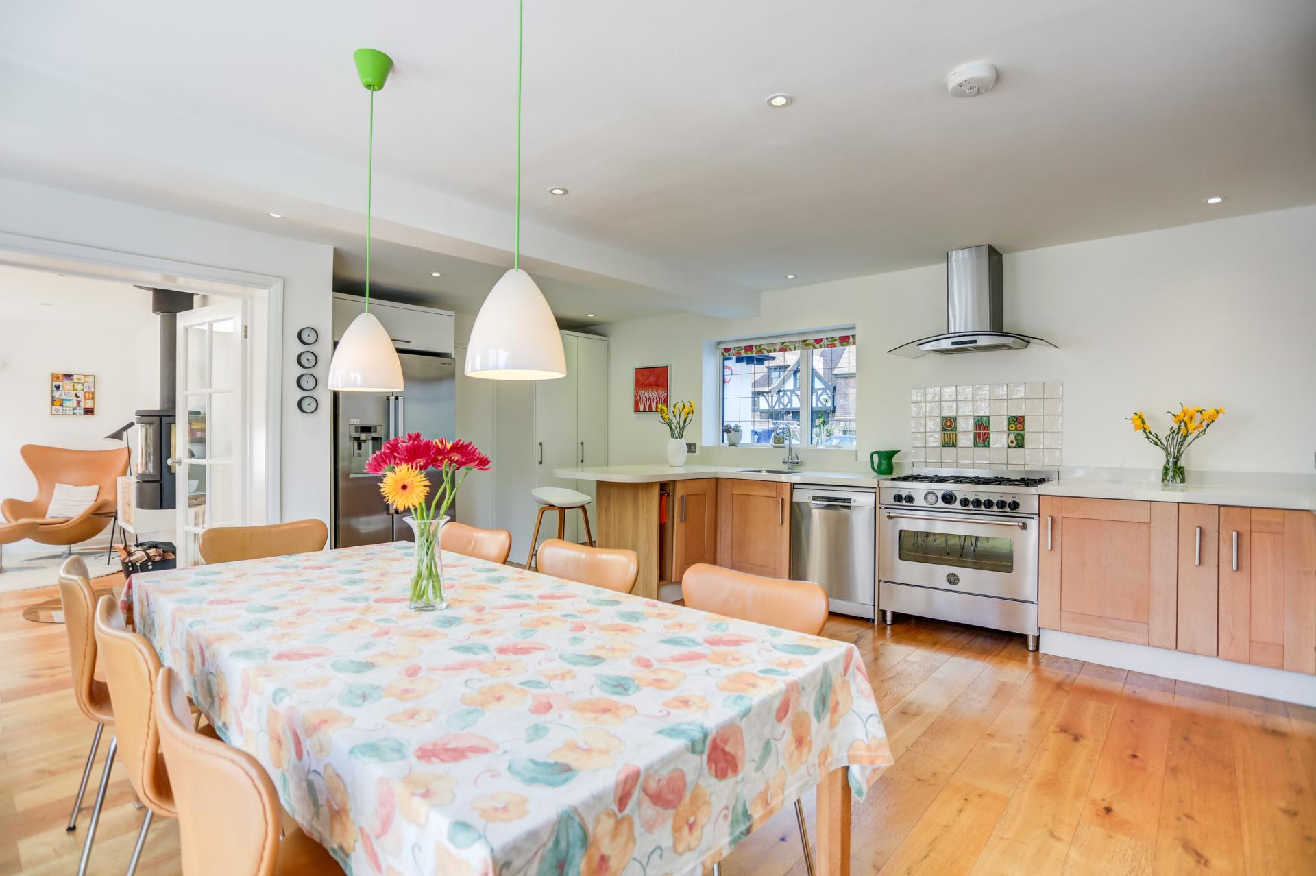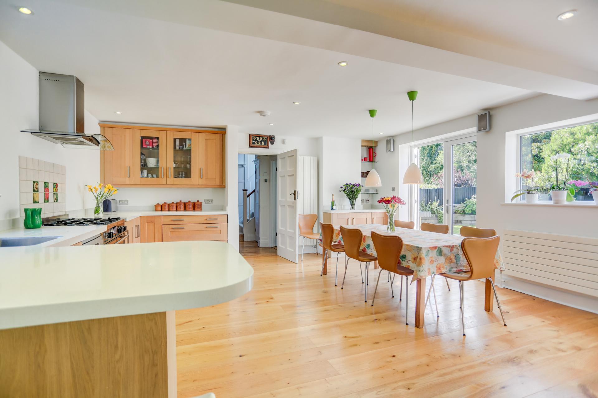 The kitchen is light-filled and contemporary, styled with a clean Scandinavian influence. White stone wrap-around surfaces are complemented by wooden cabinetry, while natural floorboards unify the ground floor. A dining area sits at the heart of the space, perfect for informal family meals. From here, French doors lead to a bright rear sitting room, ideal for entertaining with garden views in summer or transforming into a cosy snug with a log-burning fire in the cooler months.