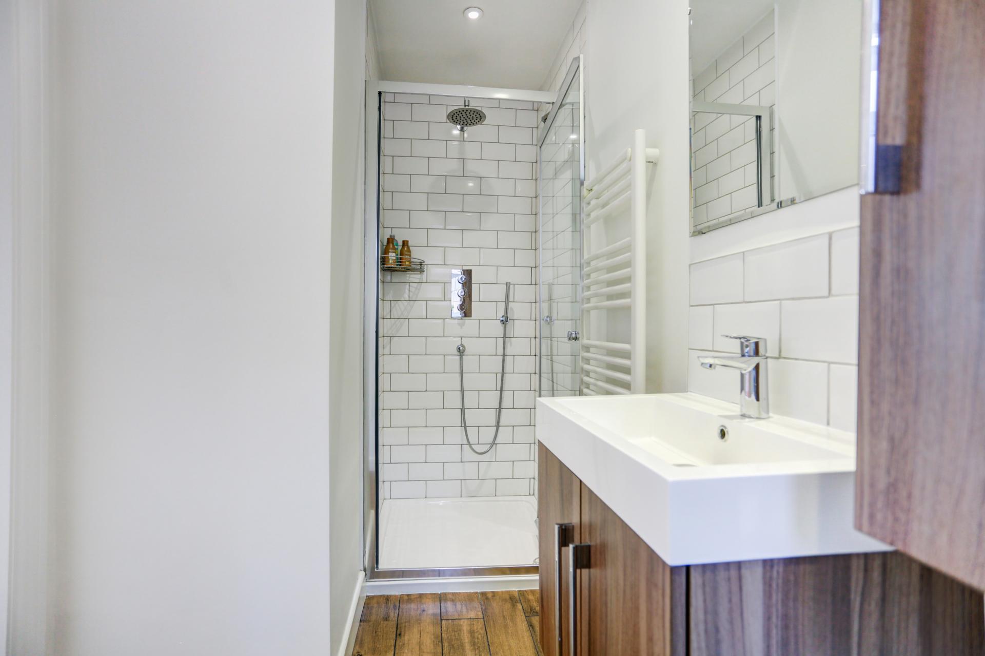 A striking staircase, illuminated by a double-height wrought iron Art Deco window, leads to the first floor. Here, four generously sized double bedrooms await, three with built-in wardrobes. The primary suite enjoys ample storage and a private ensuite with walk-in shower, while the family bathroom is finished in calming, earthy tones and fitted with both bath and overhead shower. There is also a useful spacious loft storage for luggage and seasonal decorations accessed from this level.