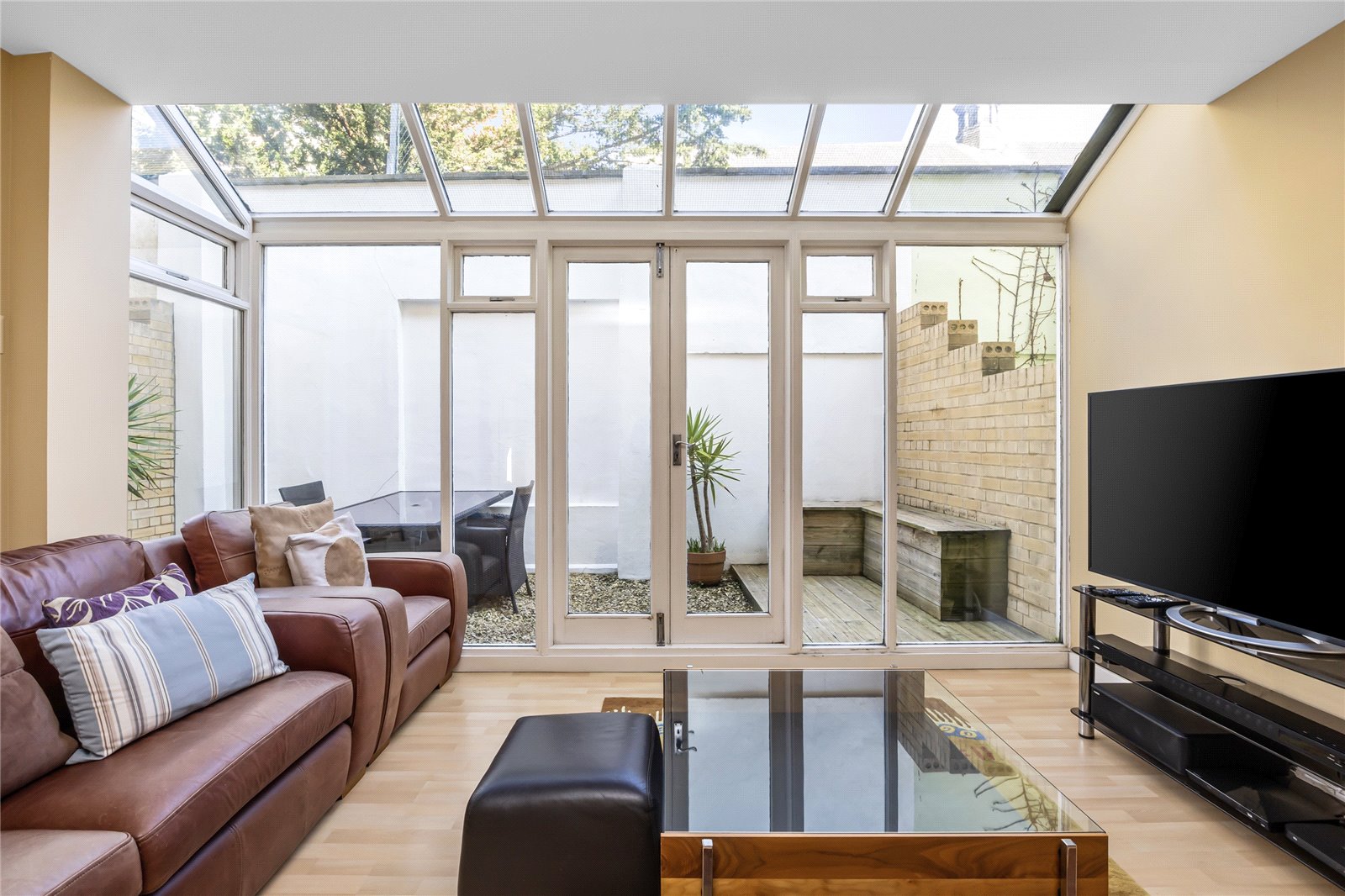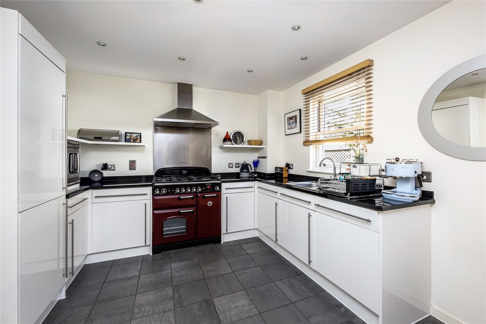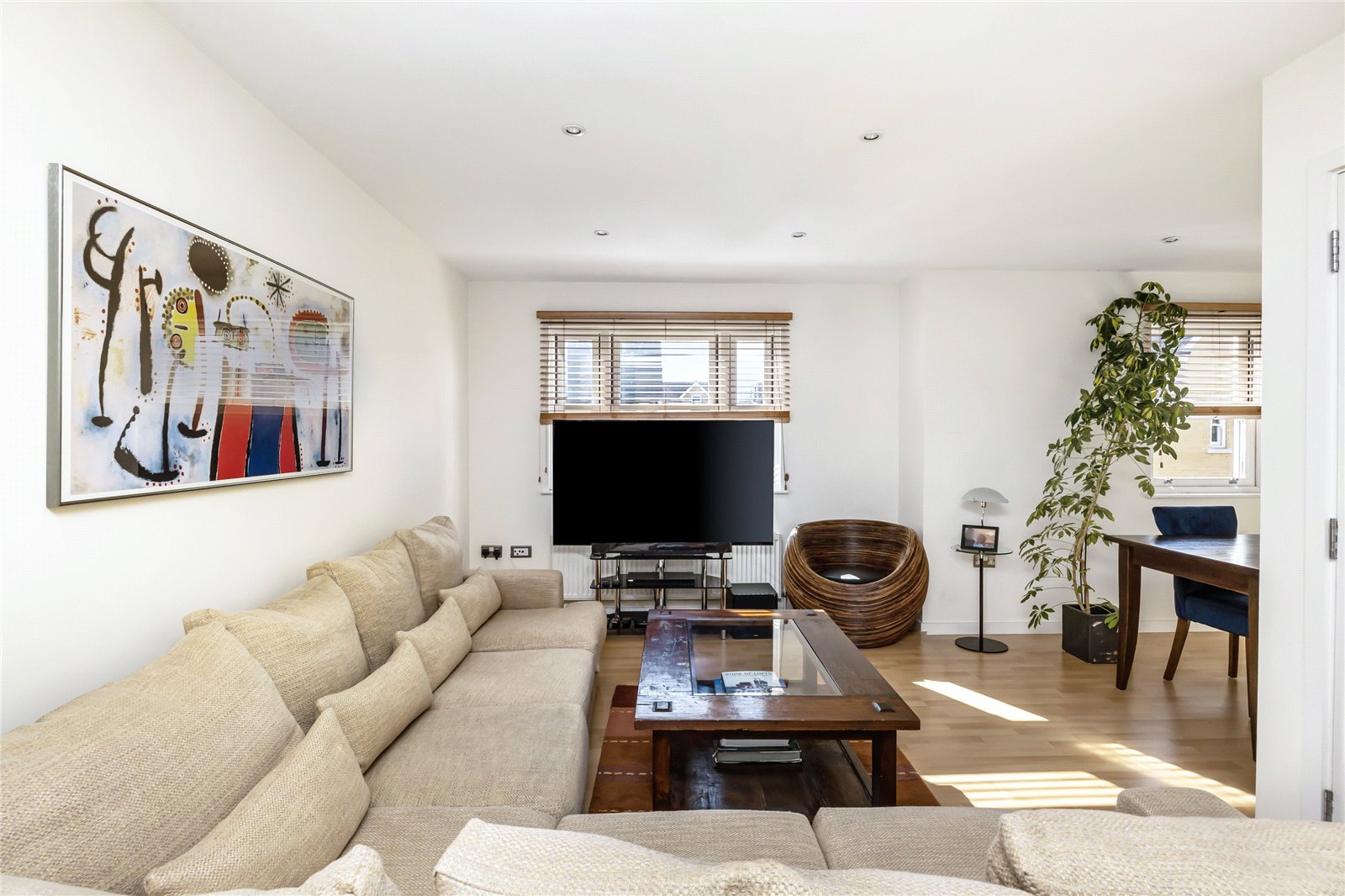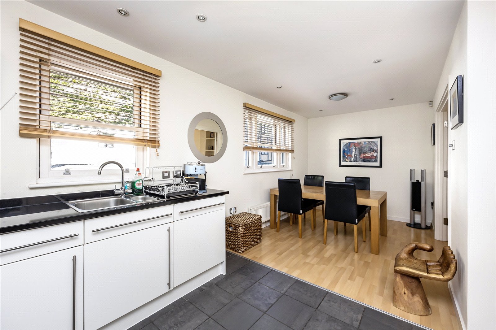 Upstairs, a spacious wrap around living room flows through French doors into the dining and kitchen areas, creating an open yet subtly divided space thatÂ’s perfect for relaxing after meals. From the first floor lounge, enjoy pleasant views down the mews. The kitchen is fitted with modern white gloss cabinetry with chrome handles, offering ample storage both above and below counter level.