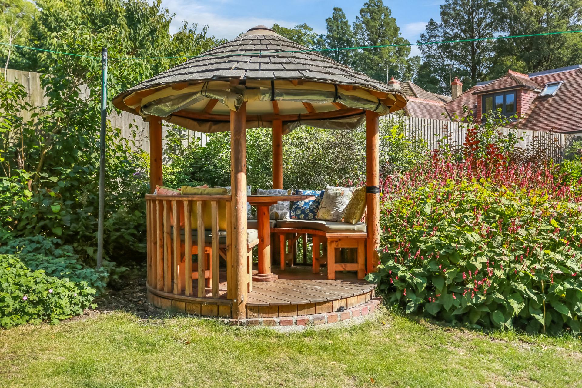 The rear garden has been thoughtfully landscaped to create an elegant and secluded outdoor oasis. A paved patio flows onto a large expanse of lawn framed by mature trees and planting, while a charming summer house is tucked away at the side. This tranquil setting offers the perfect backdrop for both entertaining and family life.