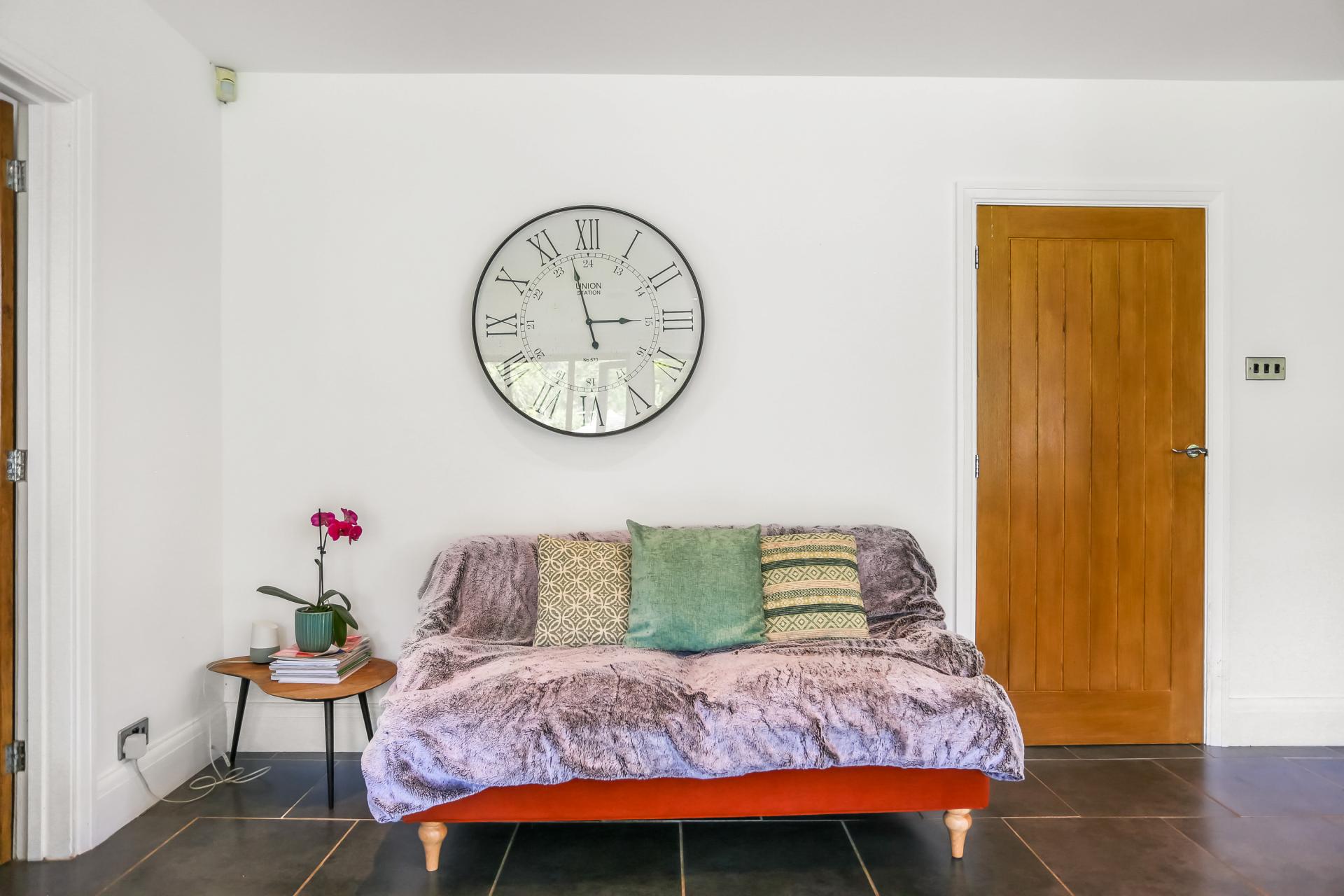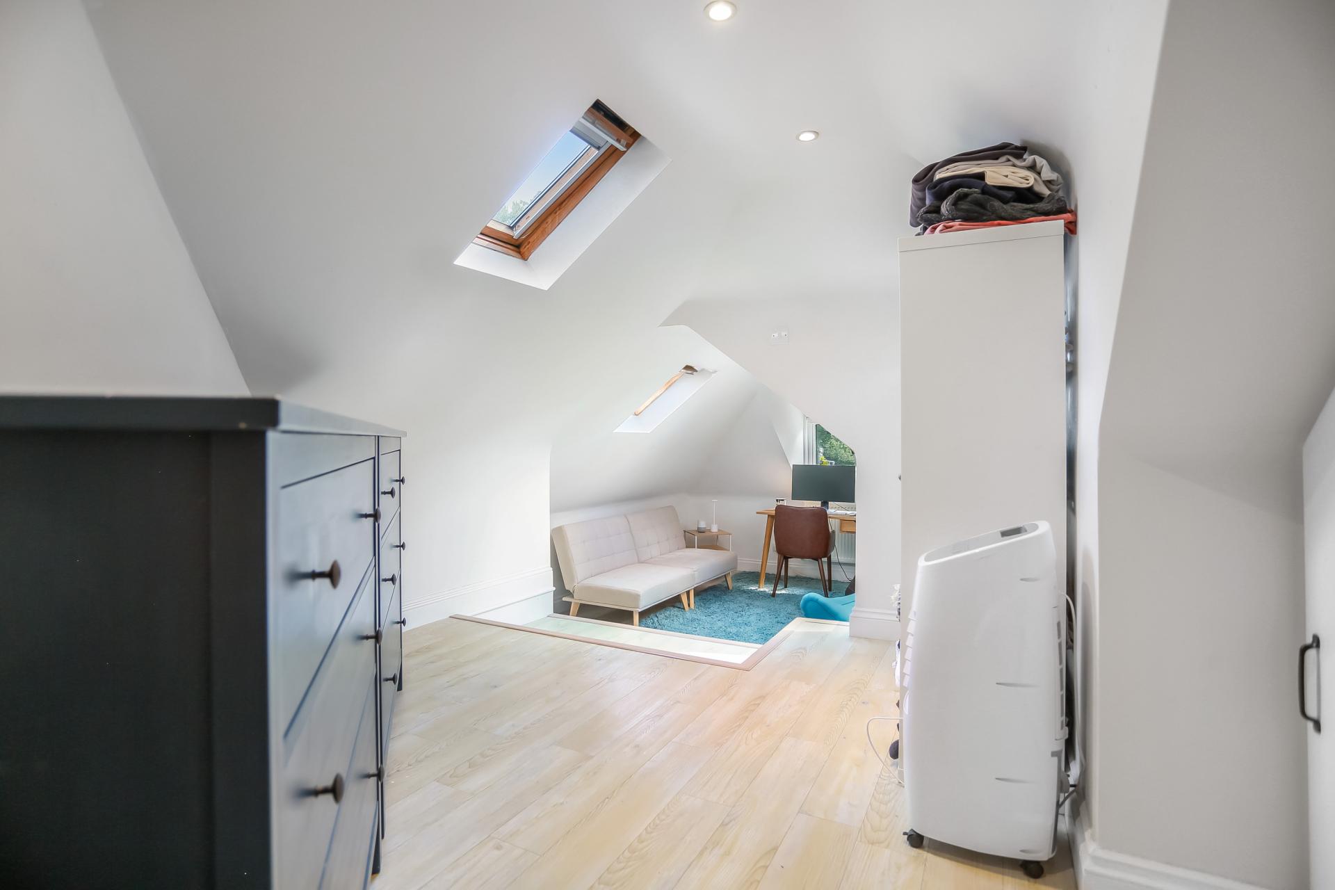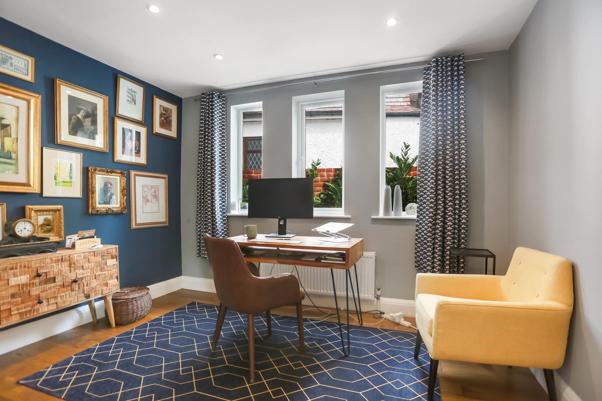 On the ground floor, a cloakroom, a large utility room with bespoke cabinetry, and a versatile office/playroom (which could also serve as an additional bedroom) further enhance the home’s flexibility. Two double bedrooms are also situated on this level, one enjoying a private en-suite bathroom.