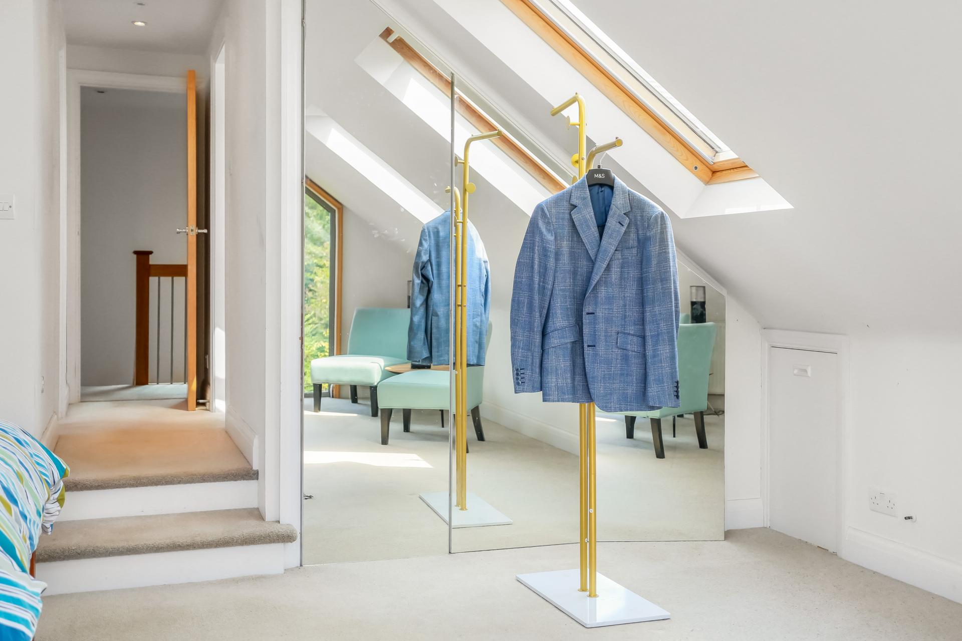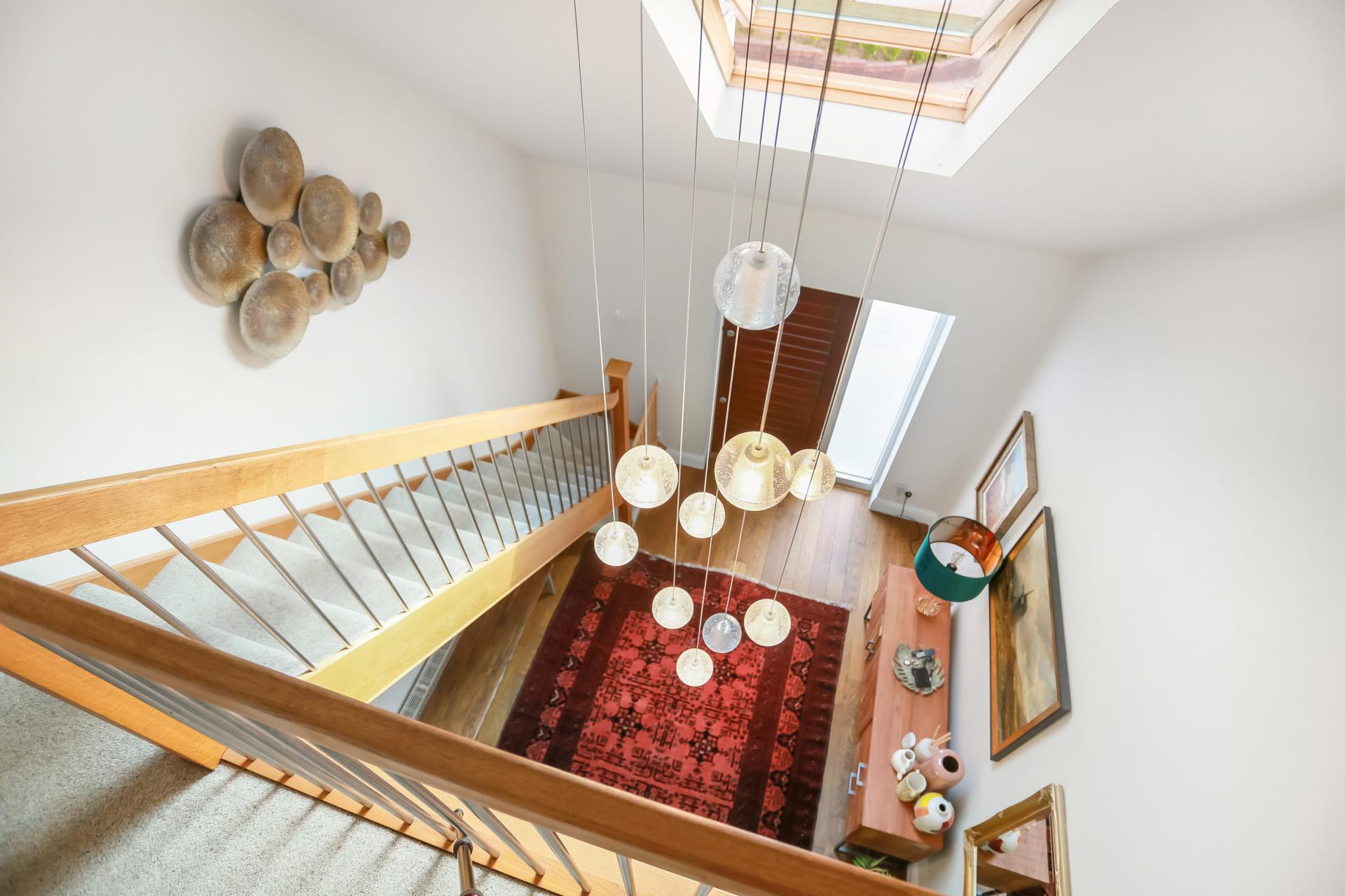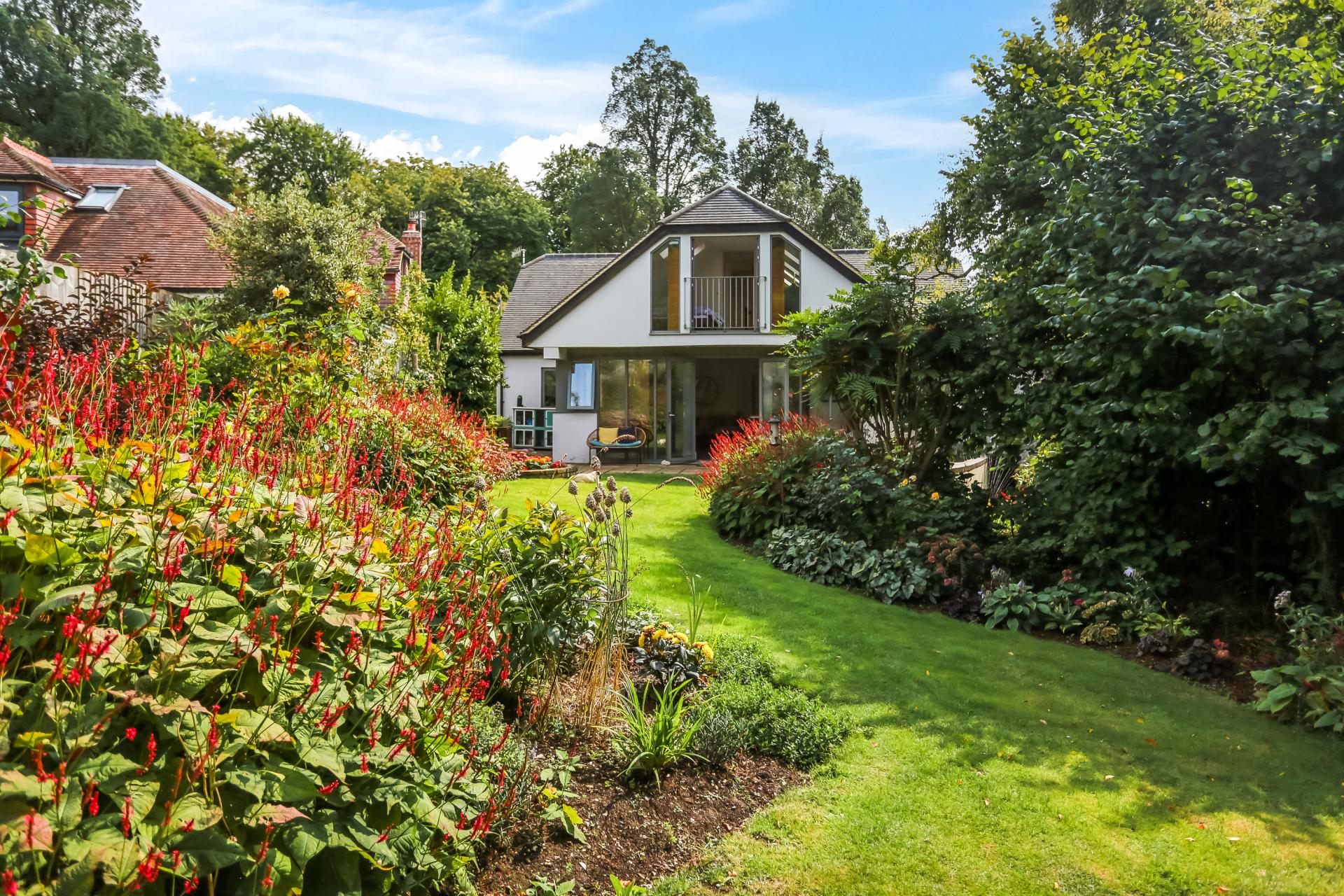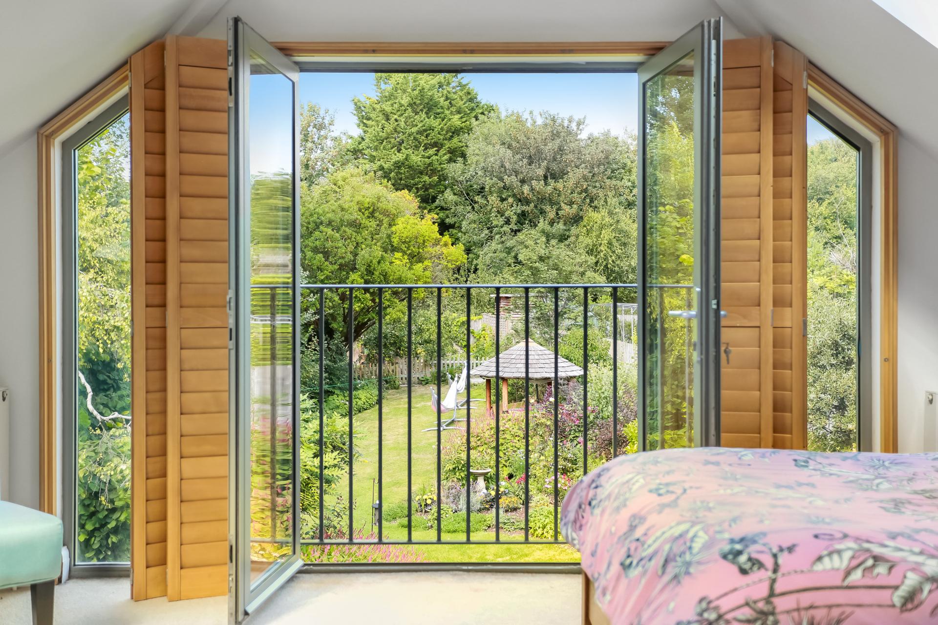 The first-floor hosts three further double bedrooms. The principal suite is a serene retreat, complete with a contemporary en-suite shower room, separate WC, ample eaves storage and a Juliet balcony with far-reaching views across the garden. The family bathroom is beautifully designed, with a freestanding bathtub providing a touch of luxury.
