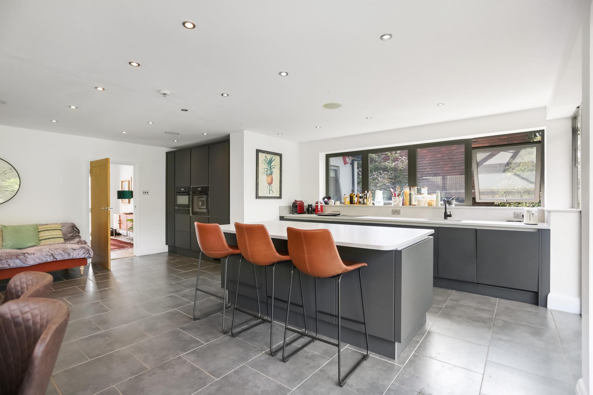The welcoming double-height entrance hall is flooded with natural light from a skylight, a south-facing frosted window and an entire wall of glass opening onto the rear garden. At the front of the house, the lounge is beautifully bright with a dual-aspect outlook, while the showpiece kitchen/dining/family room to the rear boasts a sleek contemporary finish with anthracite cabinetry, integrated appliances, underfloor heating and a striking central island. This superb space seamlessly flows through patio doors to the landscaped garden, ideal for al fresco dining and summer gatherings. From here, direct access leads to the garage, which easily accommodates two cars as well as additional storage.