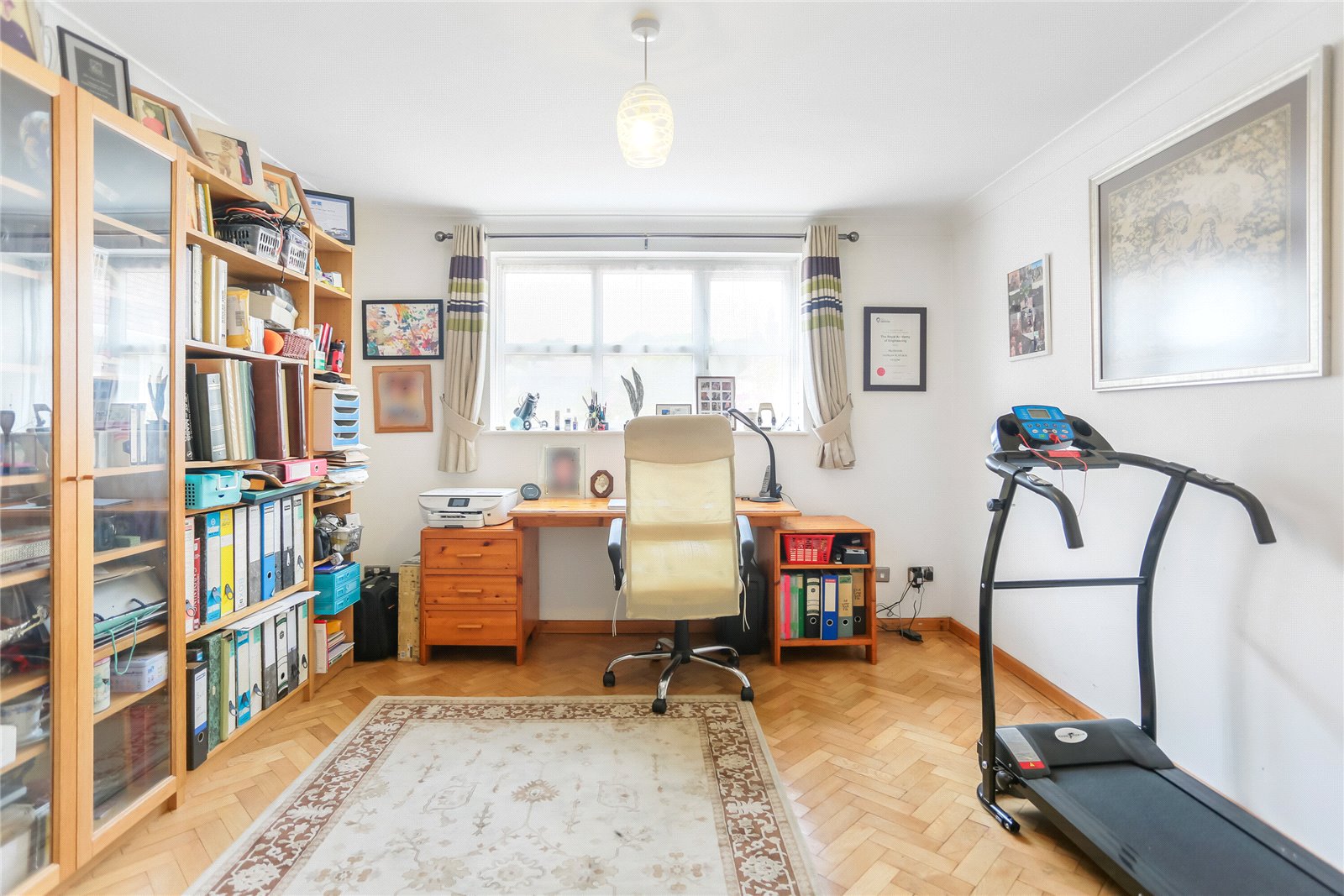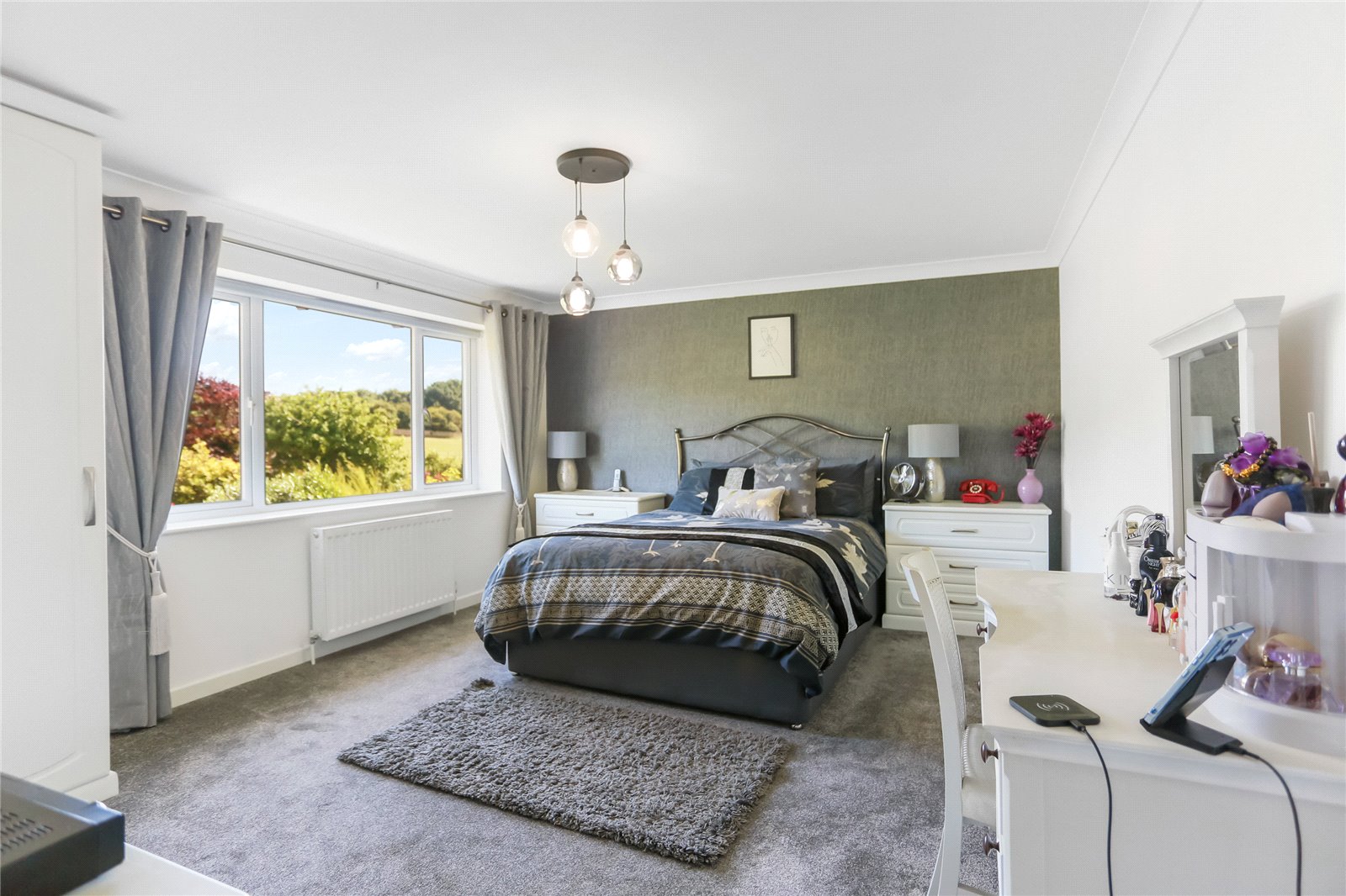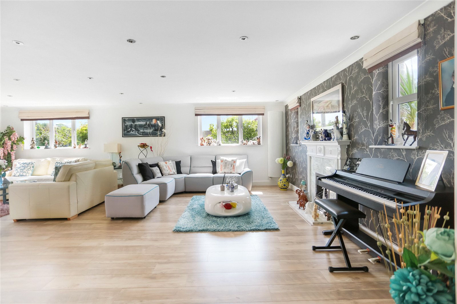 The ground floor living area takes you seamlessly from foyer through to living room, dining room, kitchen then back through to hallway for great flow all brought together with hard wooden style flooring. The large hallway also has a guest cloakroom to the side. With amply sized rooms this is impressively designed, contemporary style living space connects to the outside with split bi-fold doors, for a year-round connection to the garden and paddocks beyond. The kitchen is well designed for family living, with its large central island that doubles as nifty extra storage space as well as a breakfast bar for stools. Black granite style composite worktops surround cream gloss cabinetry with integrated oven, microwave and gas hob. Tucked back from the hallway, an office/guest bedroom is a versatile part of the home contributing to the overall practicality of the home.