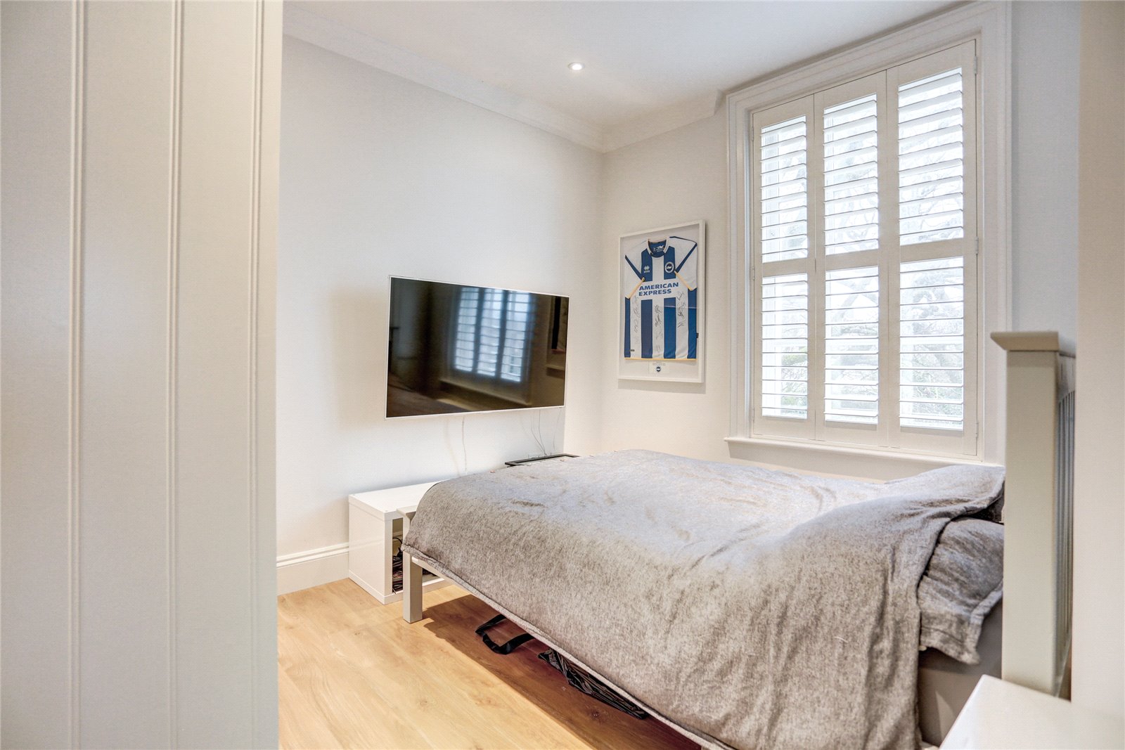 The majestic master bedroom occupies the whole third floor. The idyllic nature of this room is accentuated by long, panelled dormer windows that span across the front of the room, offering stunning South facing views across the communal gardens, down to the sea. This room has the best of both worlds; the windows create a sense of openness, that immerses you in the surroundings of Clifton Terrace & Gardens, whilst the eaves at either side create a cosier setting. The master bedroom also benefits from an ensuite with a walk-in shower and free-standing bath, as well as a dressing room with a generous array of built in wardrobes.