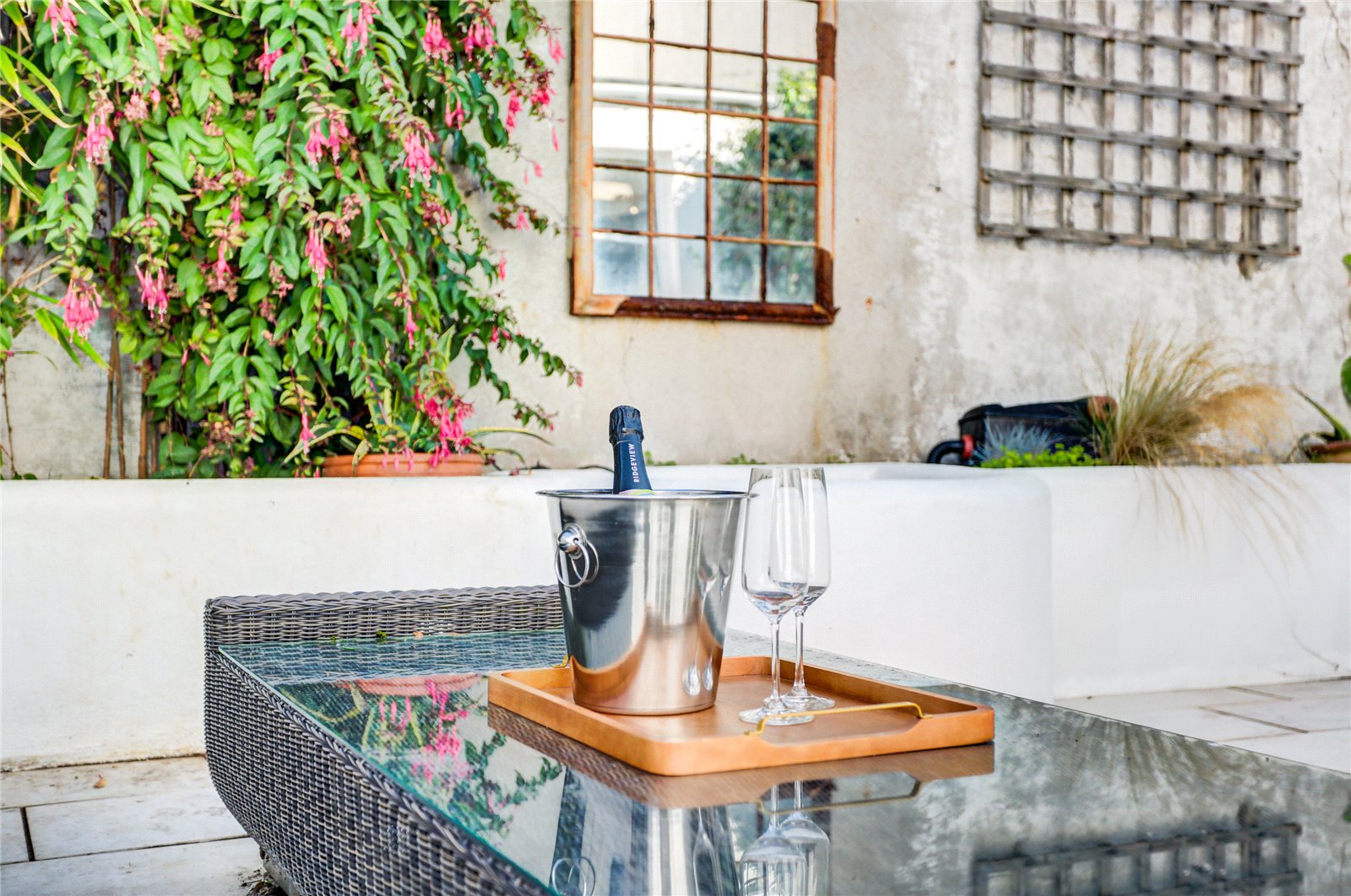 Further down the hall, the expansive open-plan kitchen and dining room, bathed in natural light from a ceiling lantern, invites both everyday living and entertaining. French doors open onto a beautifully landscaped patio garden, reminiscent of Mediterranean terraces. The kitchen is thoughtfully designed with grey shaker cabinets, a central island, and granite countertops, blending period charm with modern functionality. The garden continues the kitchen's theme, offering an outdoor haven with climbing roses and lush greenery, perfect for al fresco dining.