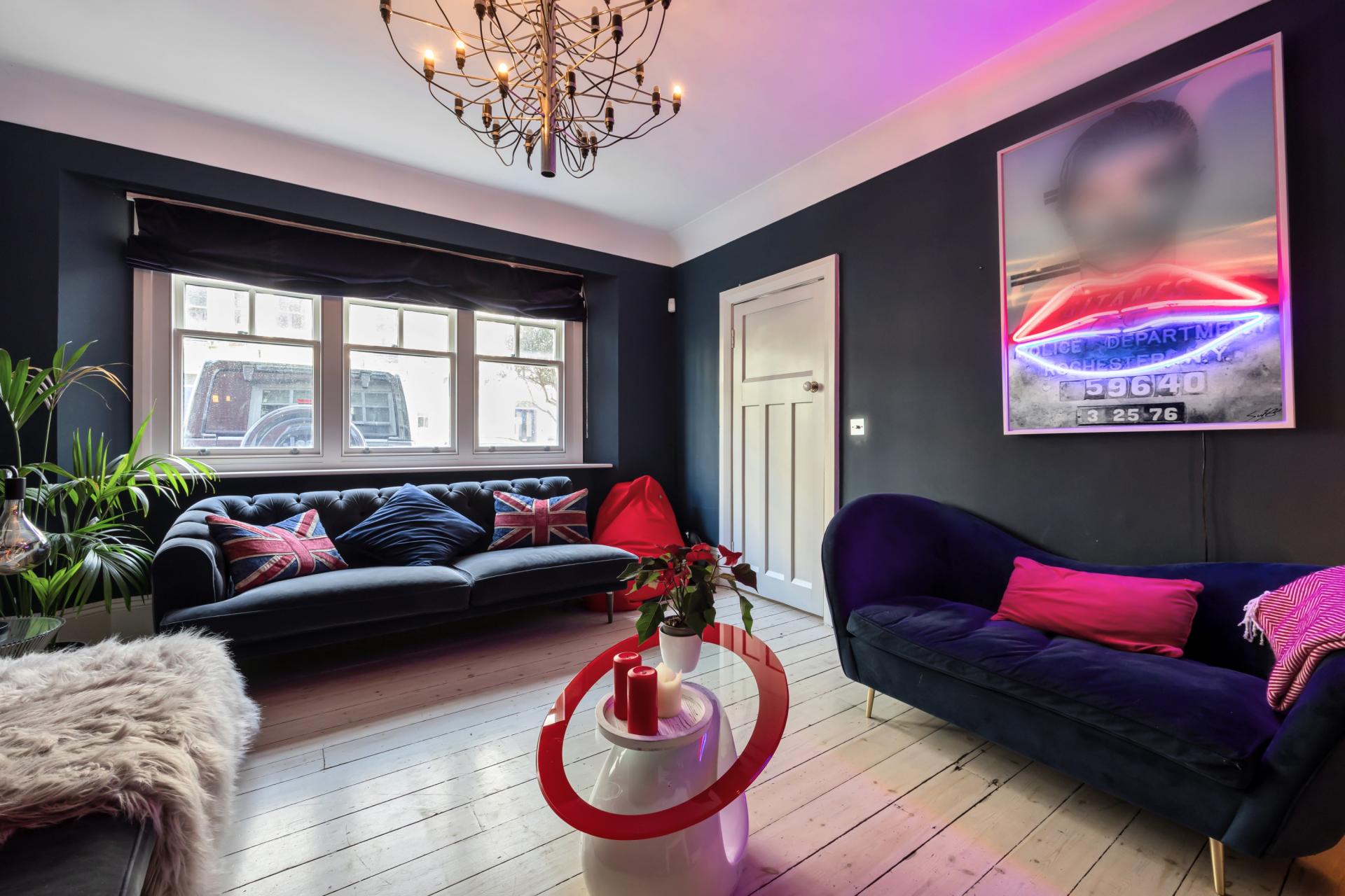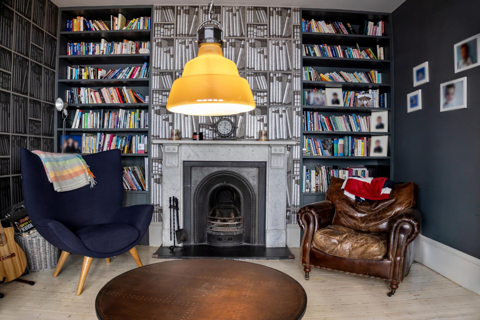 To the left and right of the entrance hall are two spacious and symmetrical reception rooms. One features a large bay window, while the other boasts triple sash windows—each replaced with high-quality timber-framed double glazing. The first room, painted in Farrow & Ball's Stiffkey Blue, is a warm and inviting space perfect for cozy movie nights, complete with a marble fireplace and wall-mounted TV. Opposite, the formal sitting room is more refined, adorned with Cole & Son’s Ex Libris wallpaper, built-in bookshelves, and another stunning marble fireplace. A statement industrial pendant light adds contemporary flair.
