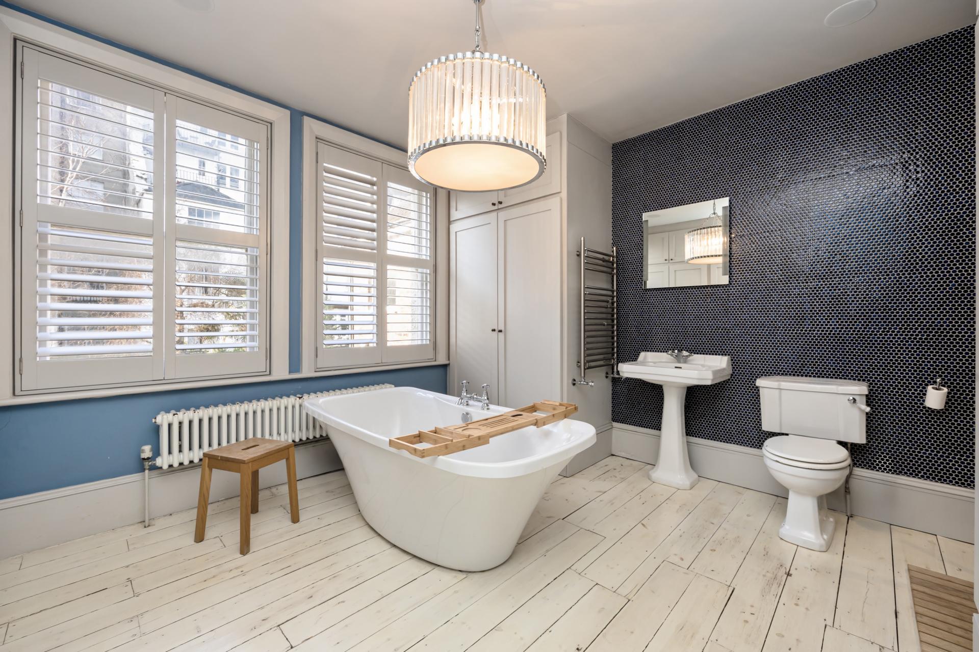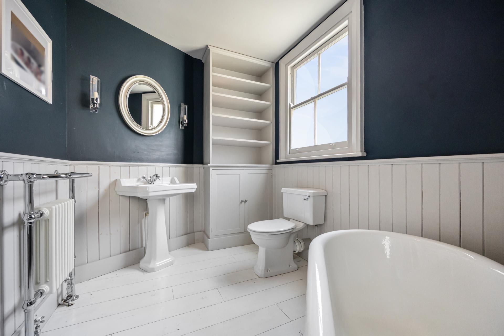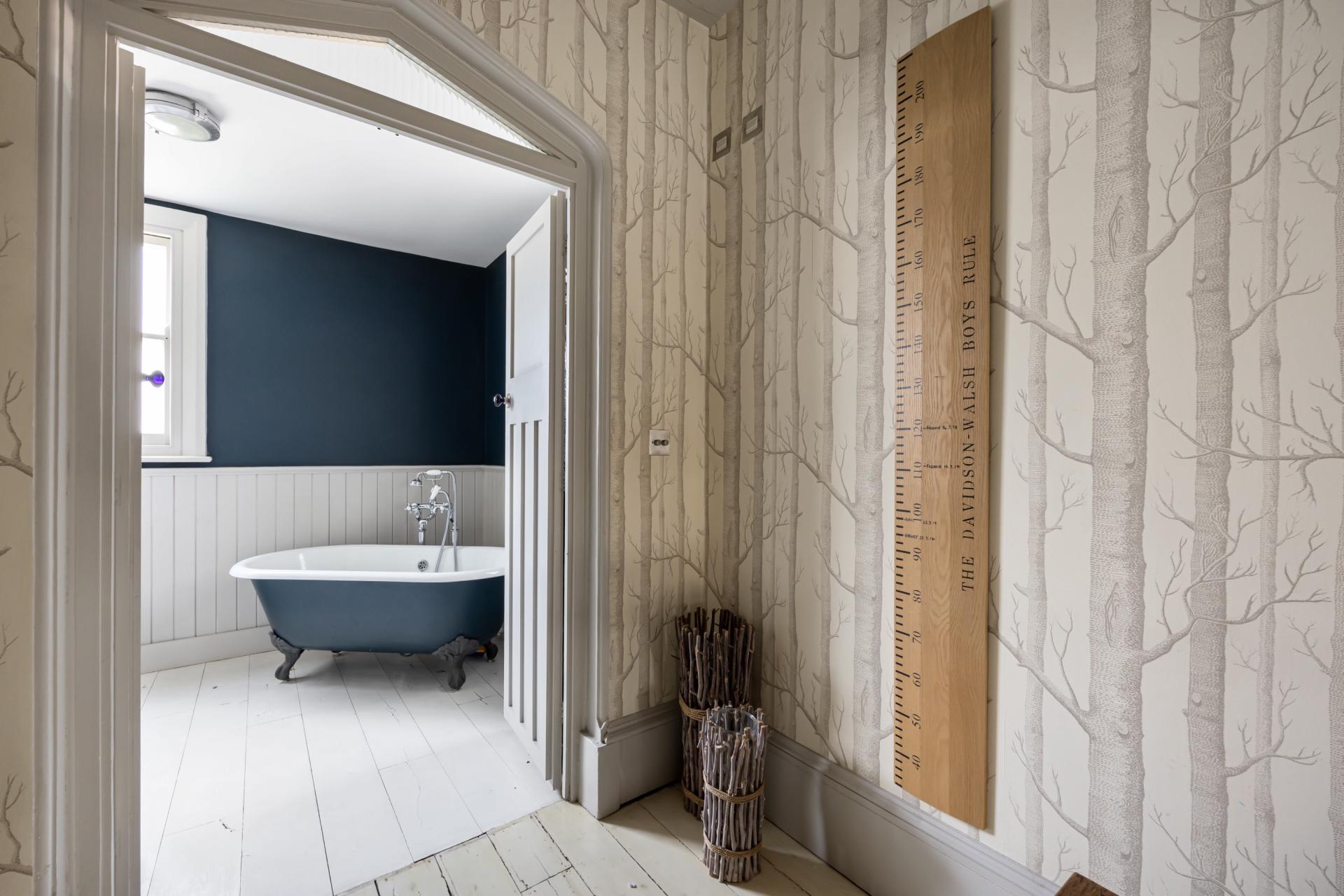Continuing the home’s period theme, the first-floor landing leads to a large family bathroom featuring a freestanding claw-foot tub, panelled walls, traditional fixtures, and a linen cupboard. Two spacious double bedrooms sit on the south side—one facing east, the other west with balcony access. Currently children’s rooms, both offer flexibility in purpose and style, with wooden floors and double-glazed timber sash windows ensuring comfort and charm.