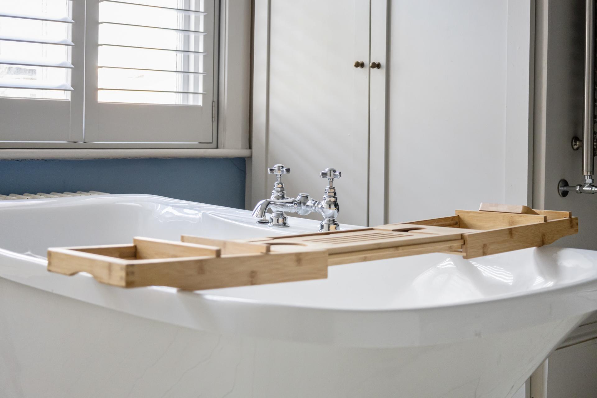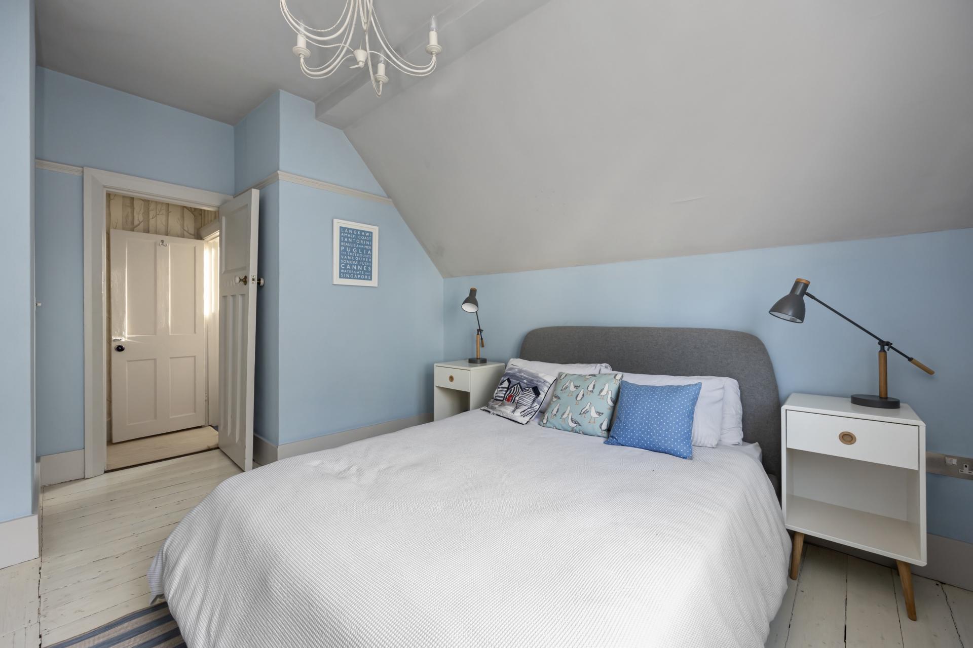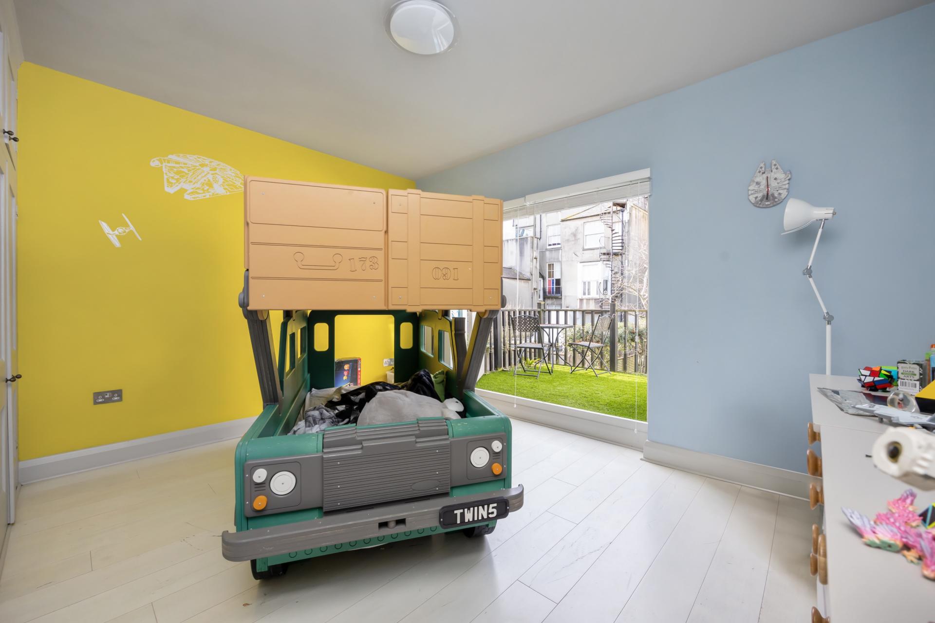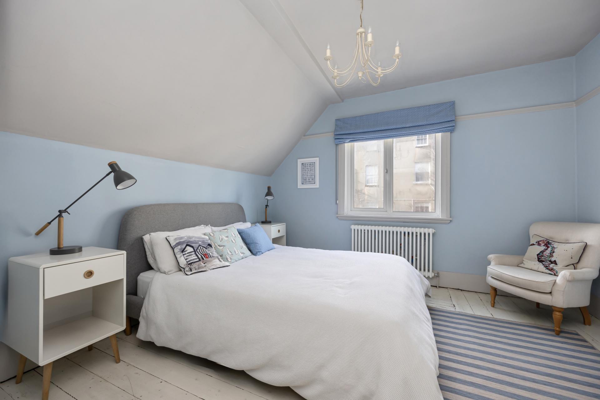 Continuing the home’s period theme, the first-floor landing leads to a large family bathroom featuring a freestanding claw-foot tub, panelled walls, traditional fixtures, and a linen cupboard. Two spacious double bedrooms sit on the south side—one facing east, the other west with balcony access. Currently children’s rooms, both offer flexibility in purpose and style, with wooden floors and double-glazed timber sash windows ensuring comfort and charm.