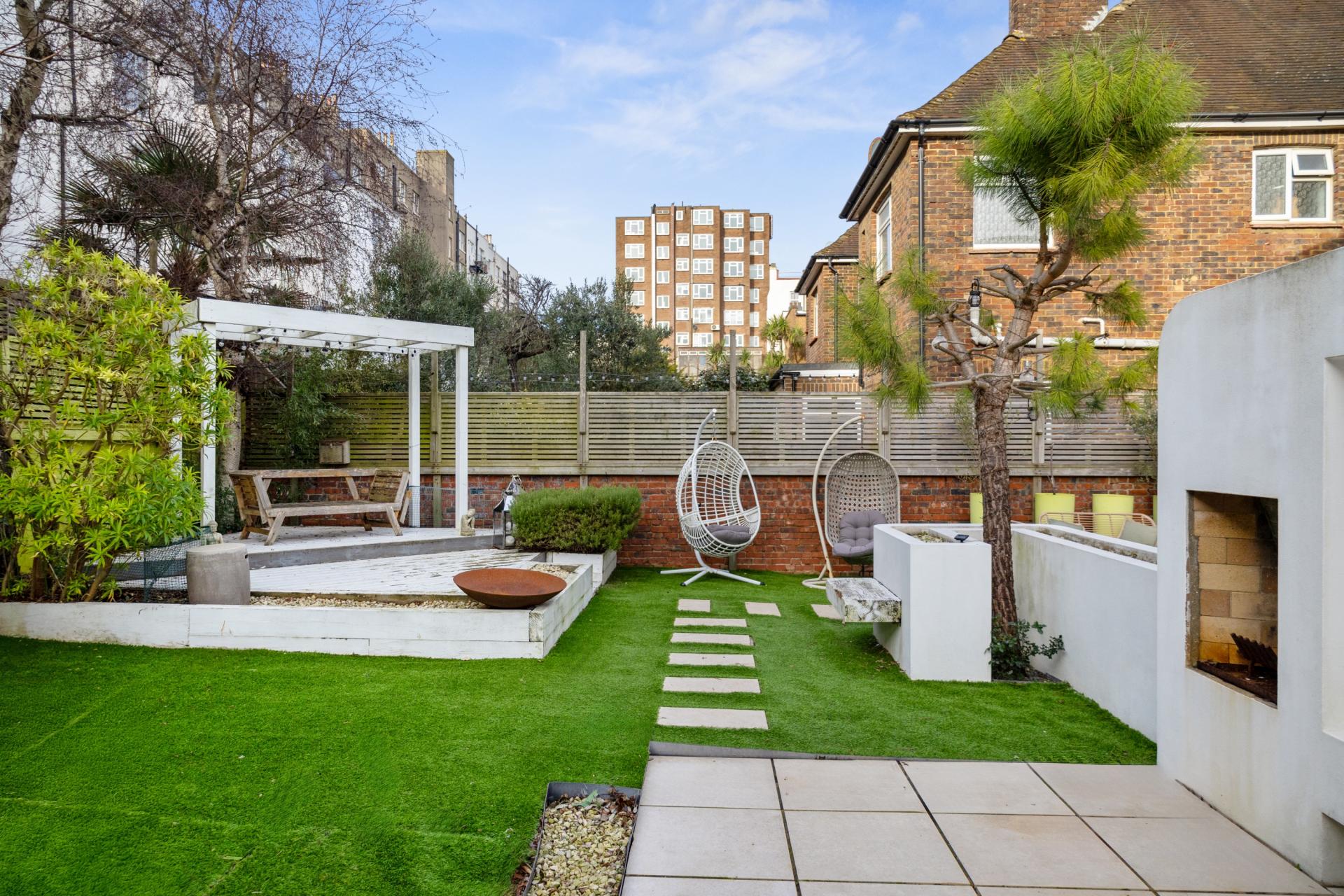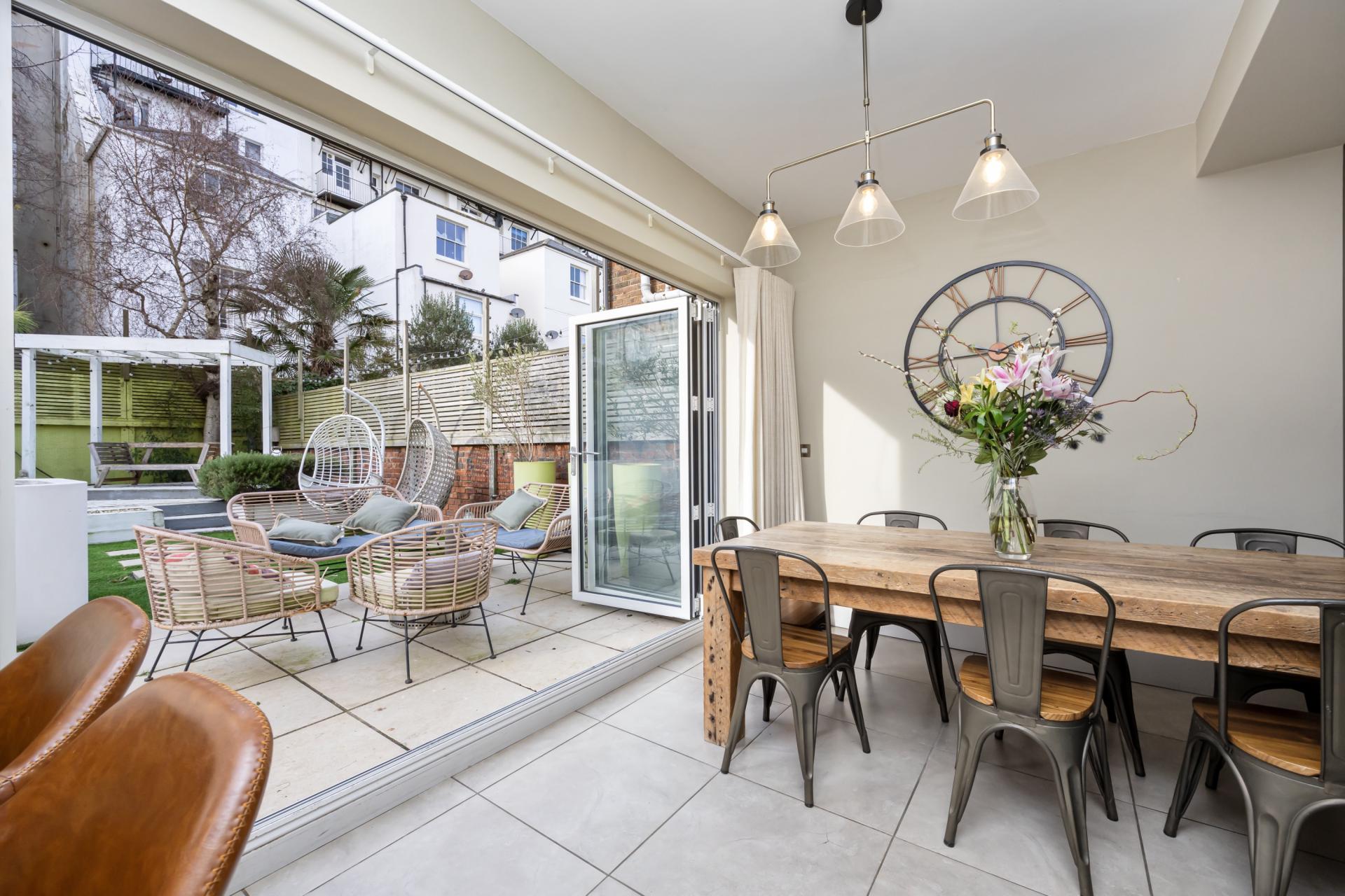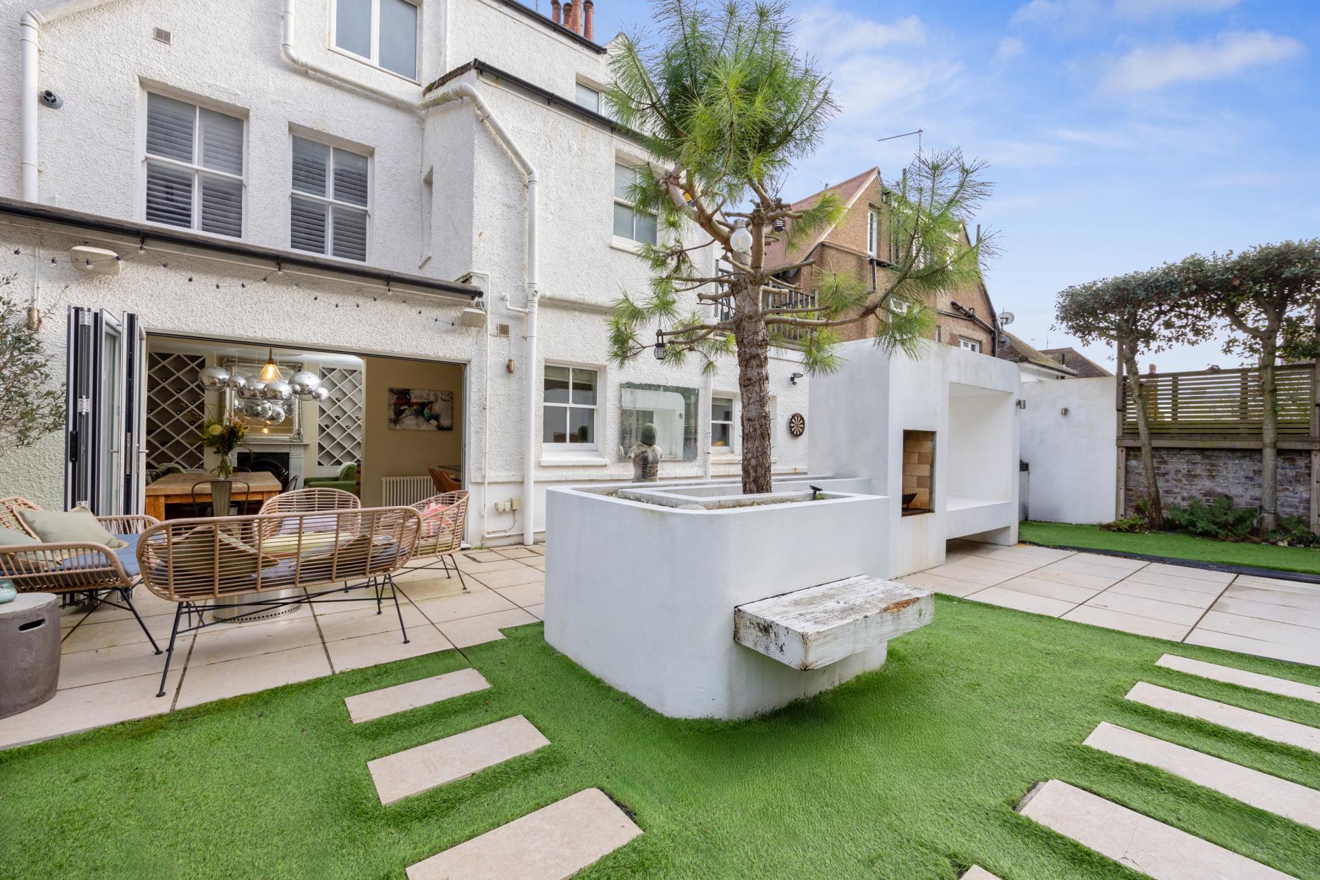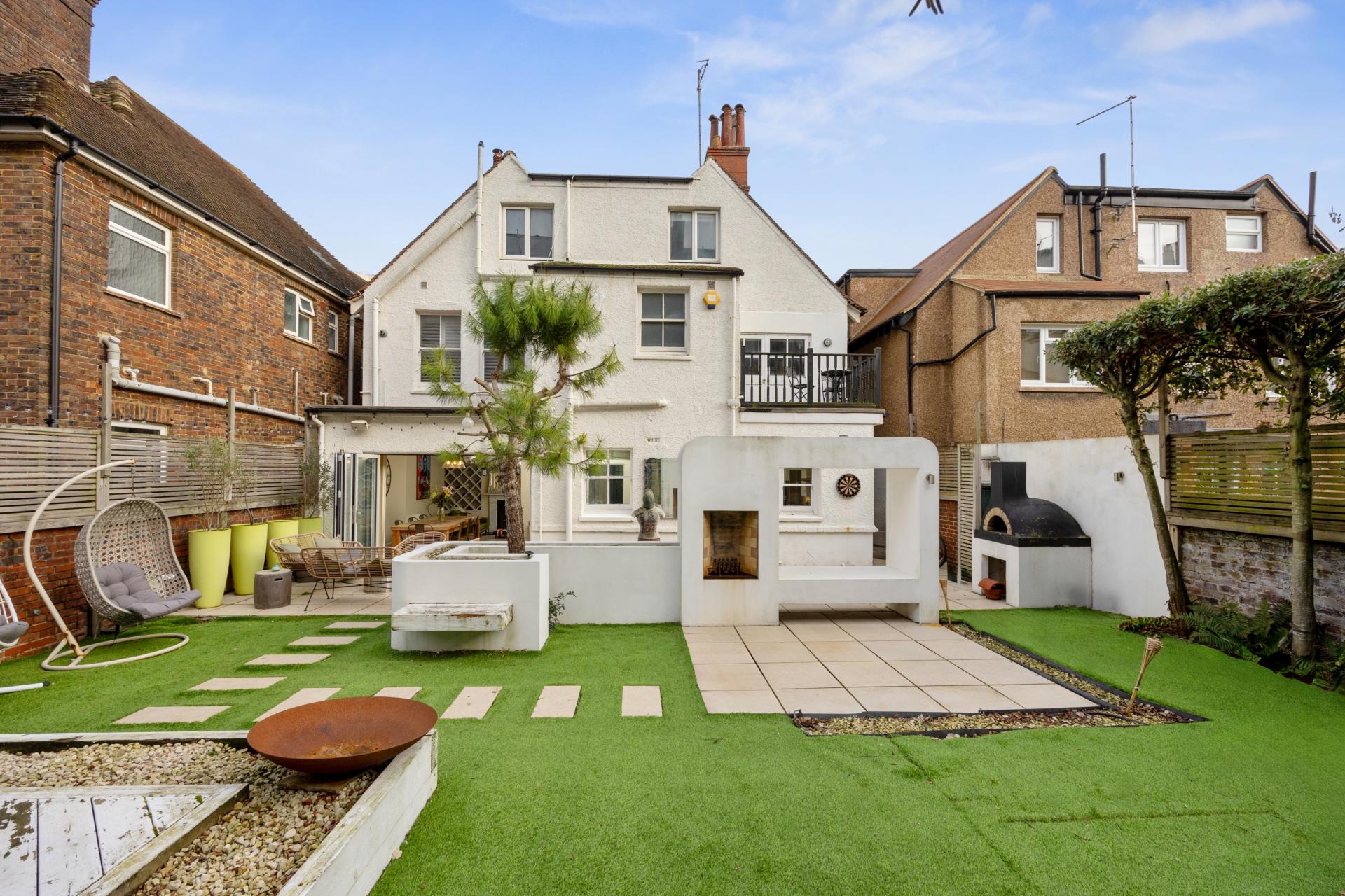 The west-facing rear garden is a tranquil sanctuary in warmer months, thoughtfully landscaped with mature borders, tall shade trees, and a stunning dual open fireplace. Multiple zones invite al fresco dining and socialising. Sunlight floods the space year-round thanks to its open southern aspect, complemented by balconies on both east and west sides of the home. Inside, the ground floor features three luxurious reception rooms, all elegantly decorated with Farrow & Ball tones and Cole & Son wallpapers, and each boasting a working open fire. With rare off-street parking for two vehicles, and within close proximity to top-rated schools and excellent transport connections, this property offers the pinnacle of coastal family living.