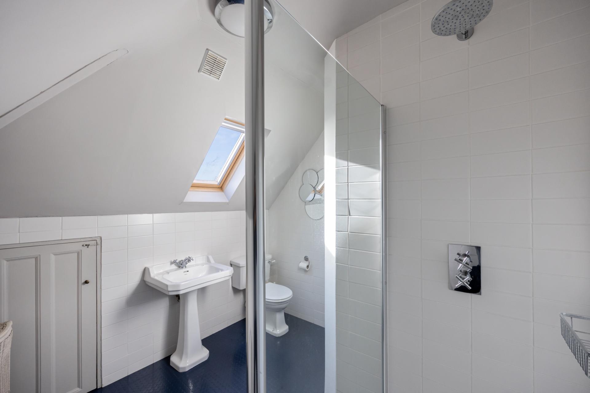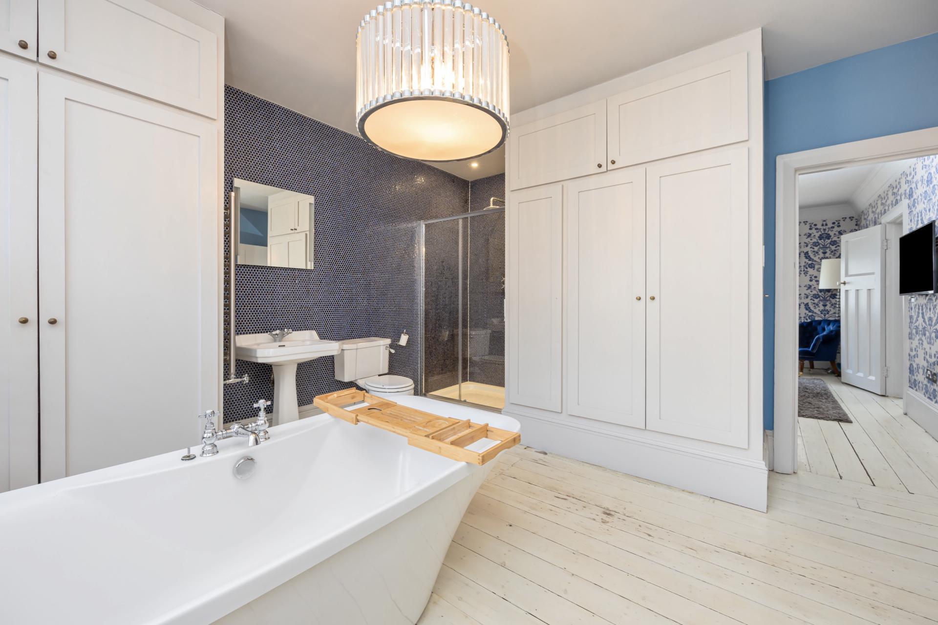 Stretching the full width of the first floor, the principal bedroom is a calm and sophisticated retreat. Its Regency-style wallpaper and blue-ivory colour scheme flow seamlessly into the luxurious en suite and dressing room. The bathroom includes a freestanding bath, separate rainfall shower, and shuttered windows for privacy. Built-in wardrobes provide excellent storage.