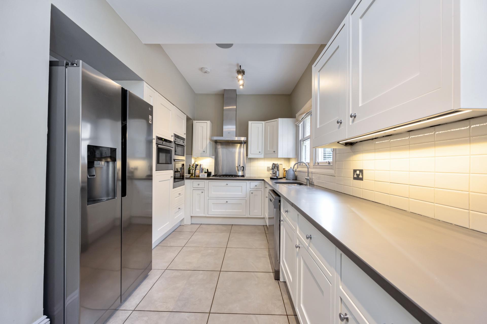 The kitchen runs along the rear wall, overlooking the garden. Solid timber Shaker-style cabinets are paired with grey quartz worktops and a sociable breakfast bar. The kitchen includes premium integrated appliances: gas hob, triple ovens, dishwasher, American-style fridge-freezer, and a sink—all included in the sale.