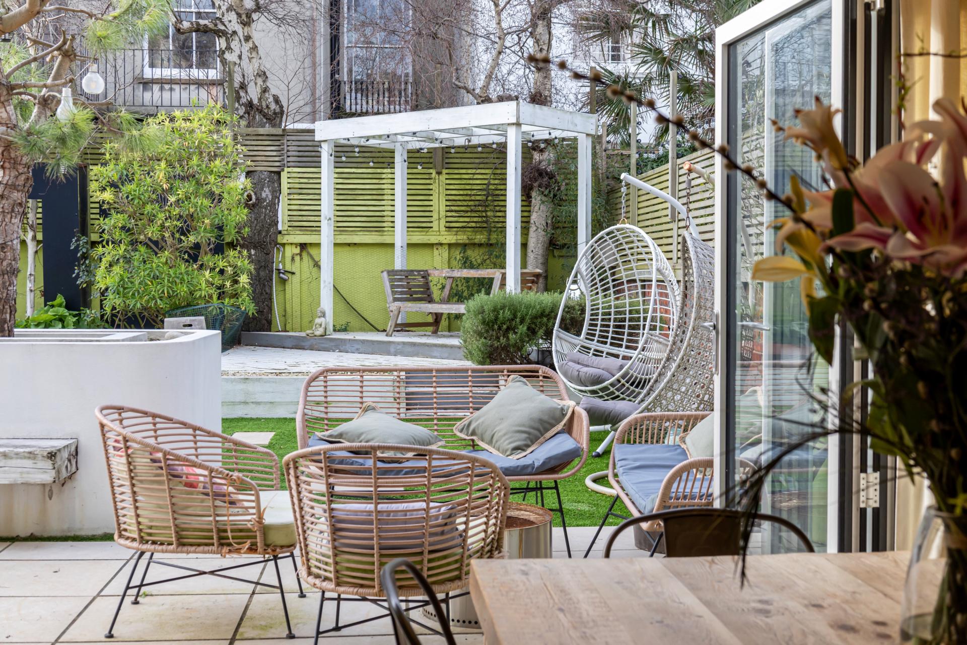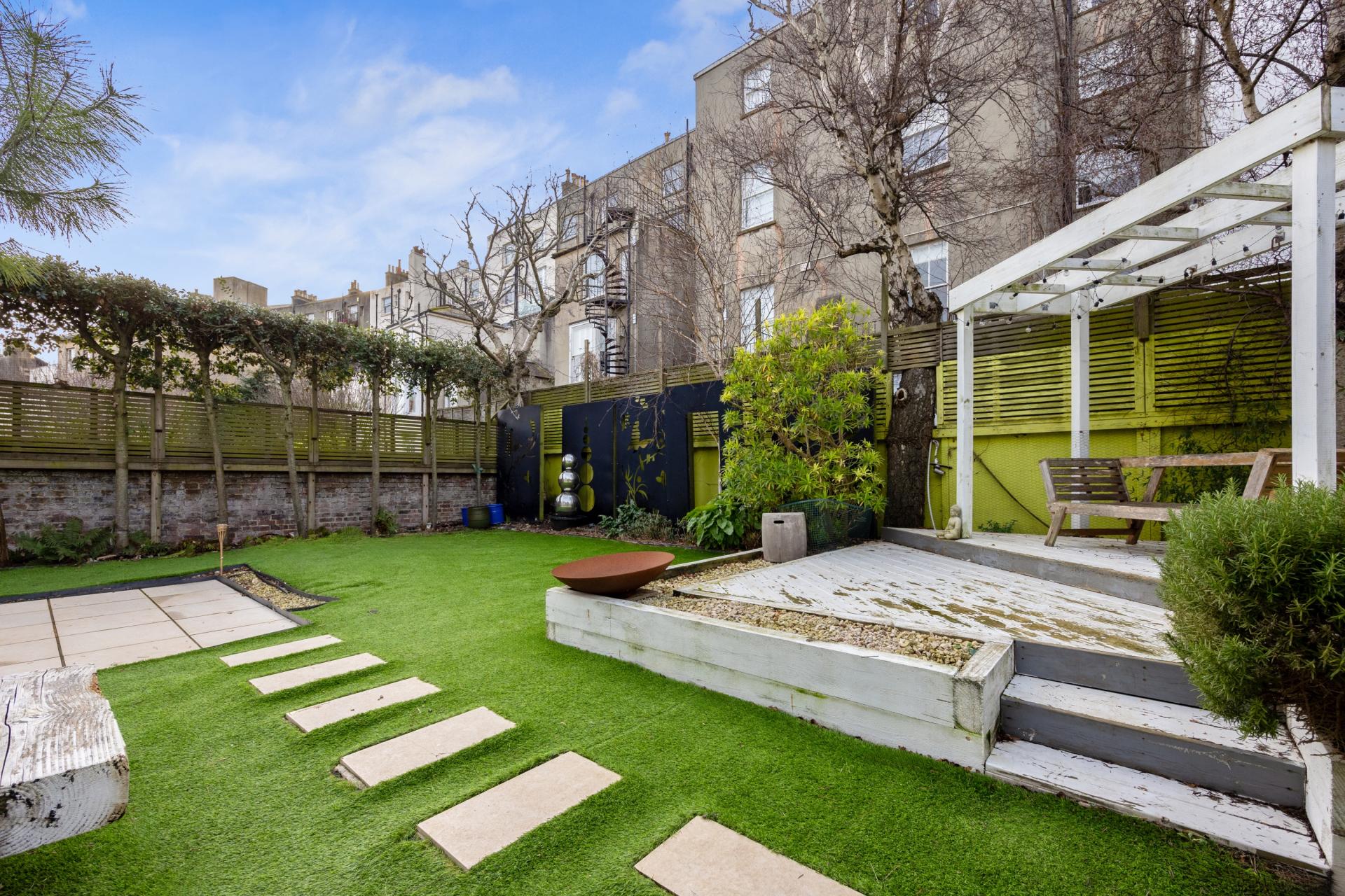 Spacious, sunny, and low-maintenance, this city garden is ideal for entertaining and family fun. Its mid-century design features a statement double fireplace separating the faux lawn from the patio. A pizza oven and smart lighting add year-round function and ambiance. Multiple seating areas take advantage of the sun's path, while clever landscaping offers colour, fragrance, and privacy. With its south-westerly orientation, it’s a serene haven where you can often hear the sea in the distance.