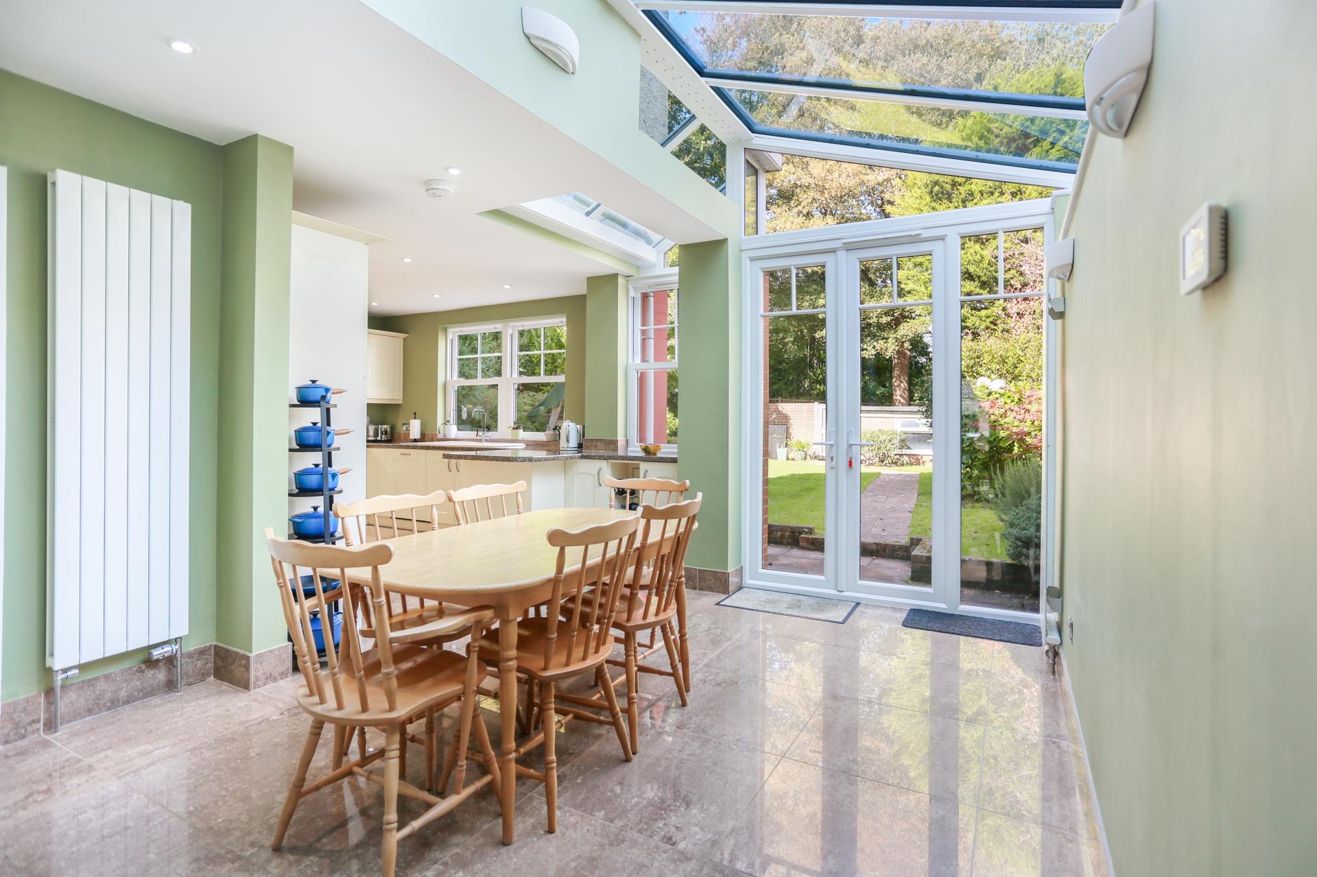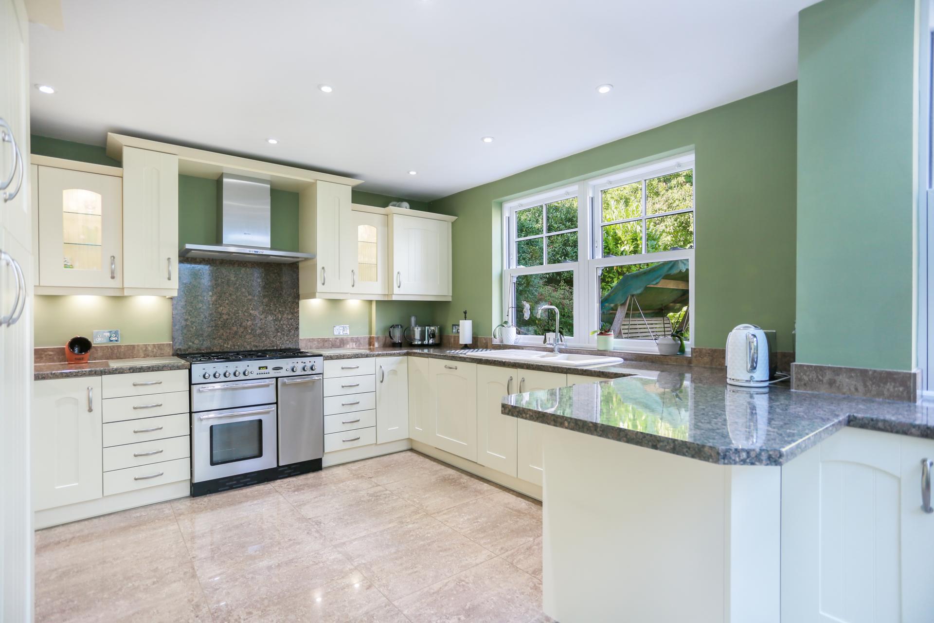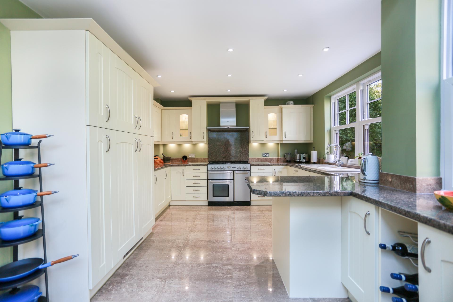 Abundant light fills the interior, particularly in the kitchen where a glass extension dining space overlooks the garden, creating a seamless connection between indoor and outdoor living. The kitchen itself blends timeless design with functionality, featuring cream shaker cabinetry and granite worktops in warm, natural tones. Designed for family living, it also incorporates a utility room with independent hallway access, keeping the main living areas beautifully uncluttered. A cloakroom completes the ground floor.