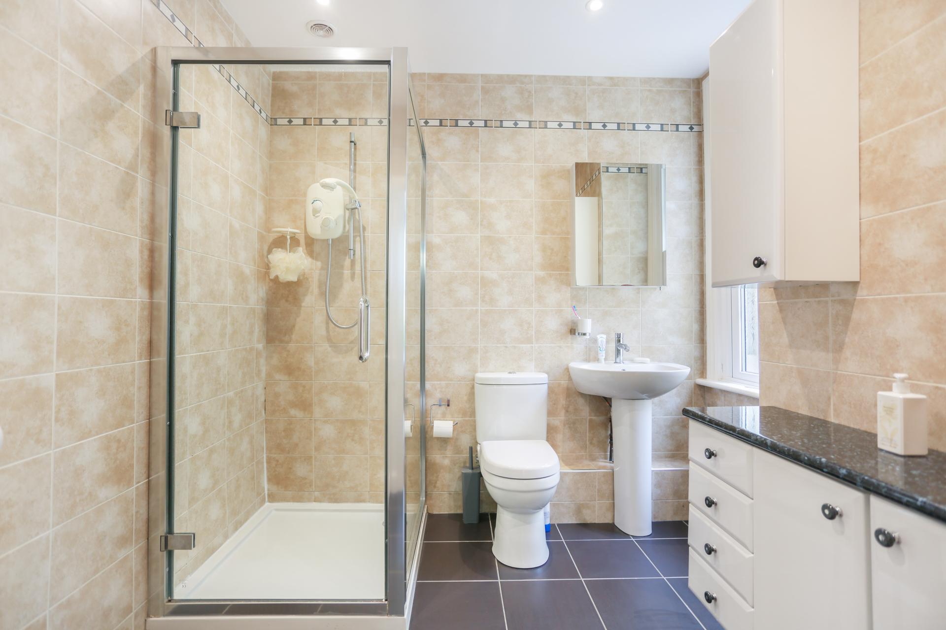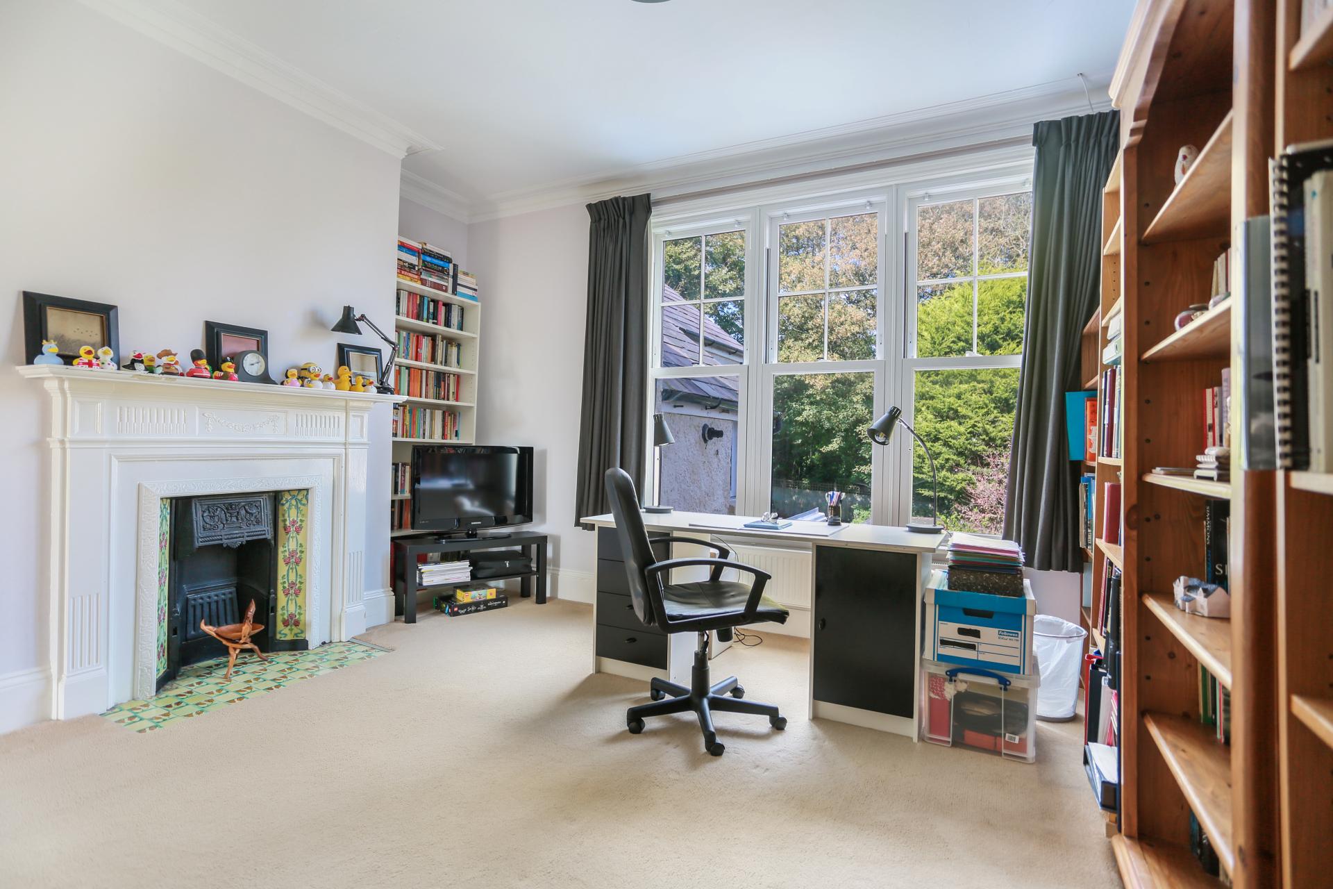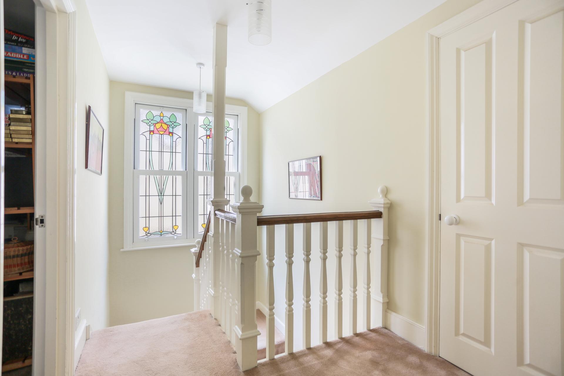 Ascending the wide Edwardian staircase, enhanced by an ornate balustrade and stained-glass window, the first floor opens onto a broad landing where four spacious bedrooms are found. At the front of the property, two refined bedrooms highlight charming period fireplaces. The larger room is enhanced by a generous bay window, while the smaller benefits from the practicality of fitted wardrobes. To the rear, two further doubles include one with an ensuite. Deep storage/airing cupboards provide exceptional practicality on the landing. A stylish family bathroom, complete with both bath and separate shower, serves this floor.