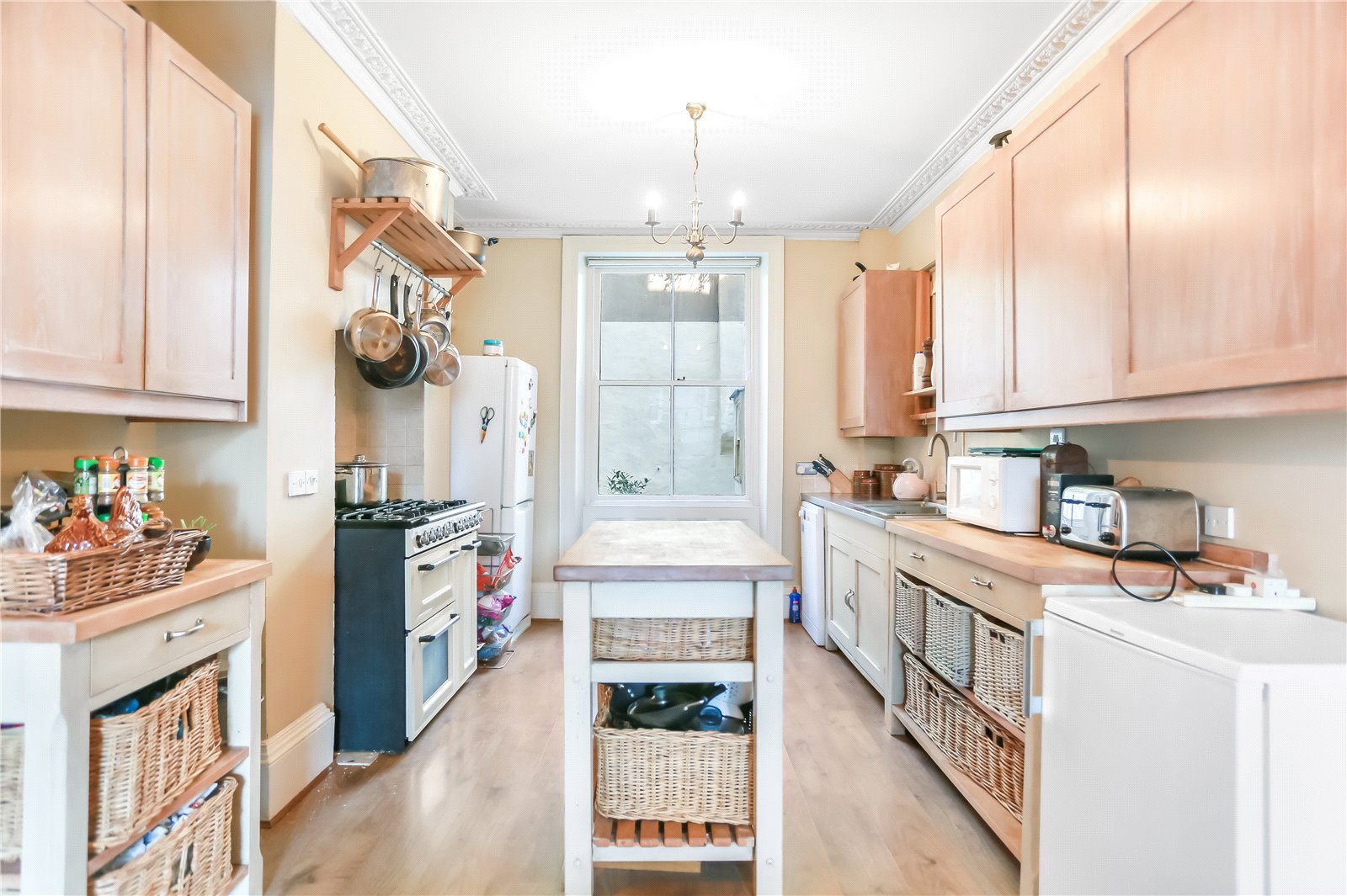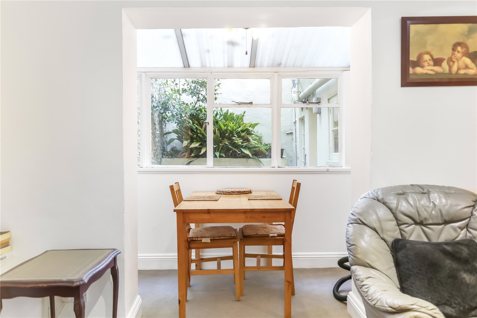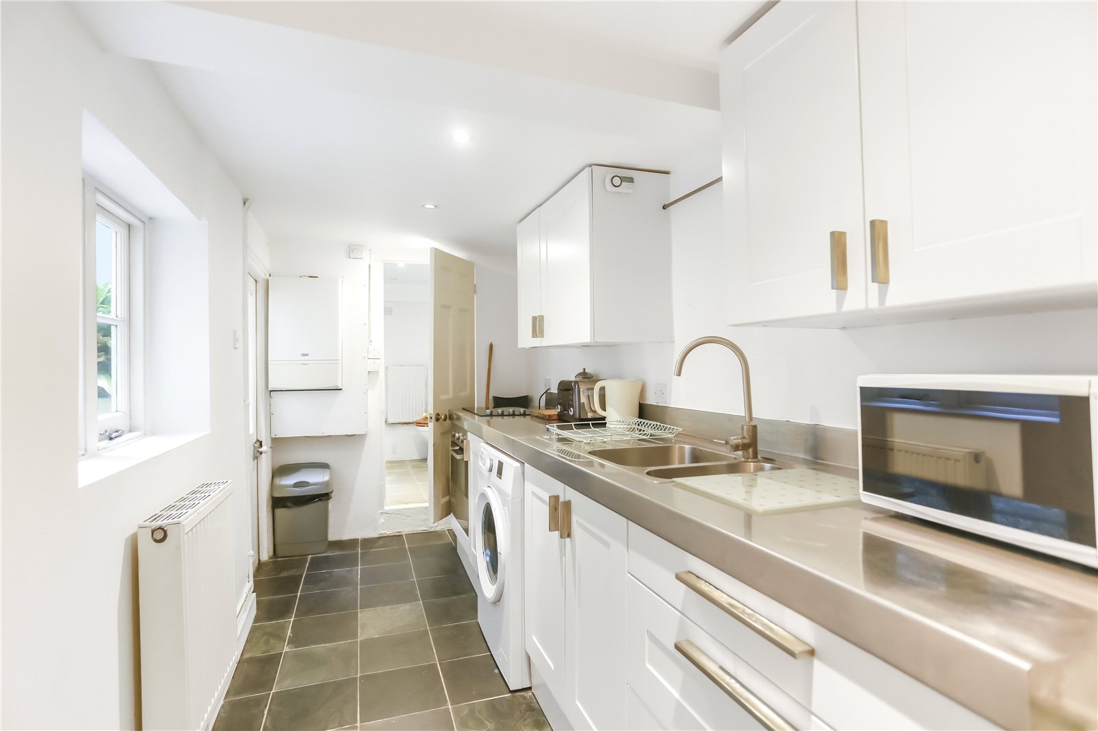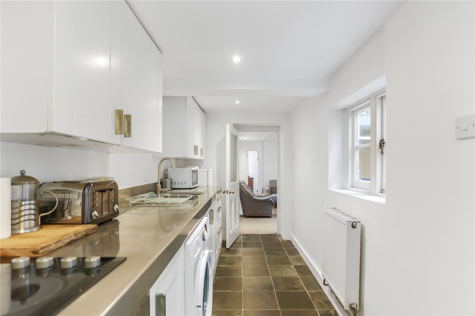 The ground floor boasts an open plan kitchen and dining room, overlooking the courtyard patio below. The bow fronted, south facing dining area ensures the space is bathed in light throughout the day. A practical utility room at the rear keeps daily household tasks separate from the living areas, maximising space. A staircase from this area leads to the lower ground floor apartment, which can be secured and made into an independent living space as and when the need arises.