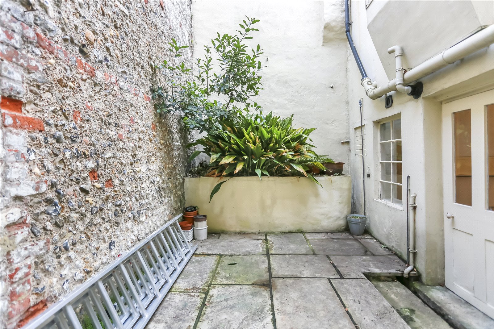 The spacious one-bedroom apartment on the lower ground floor opens onto a flint walled patio, adorned with a mix of evergreen and perennial shrubs and ferns in a tall planter.