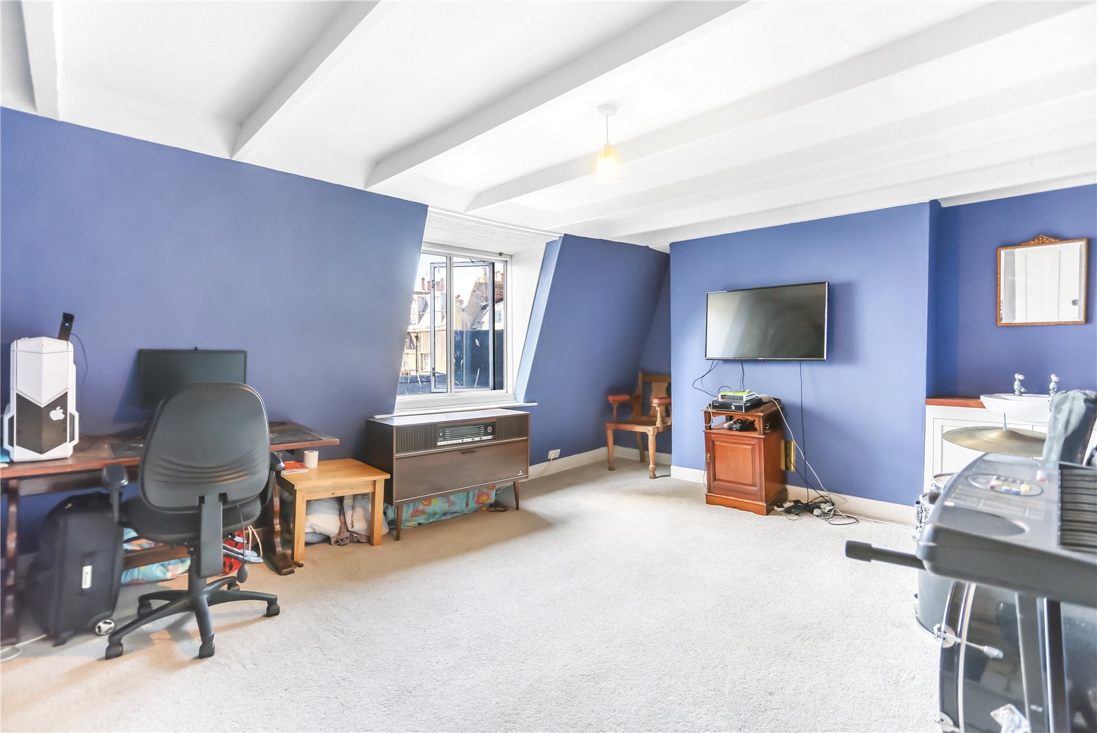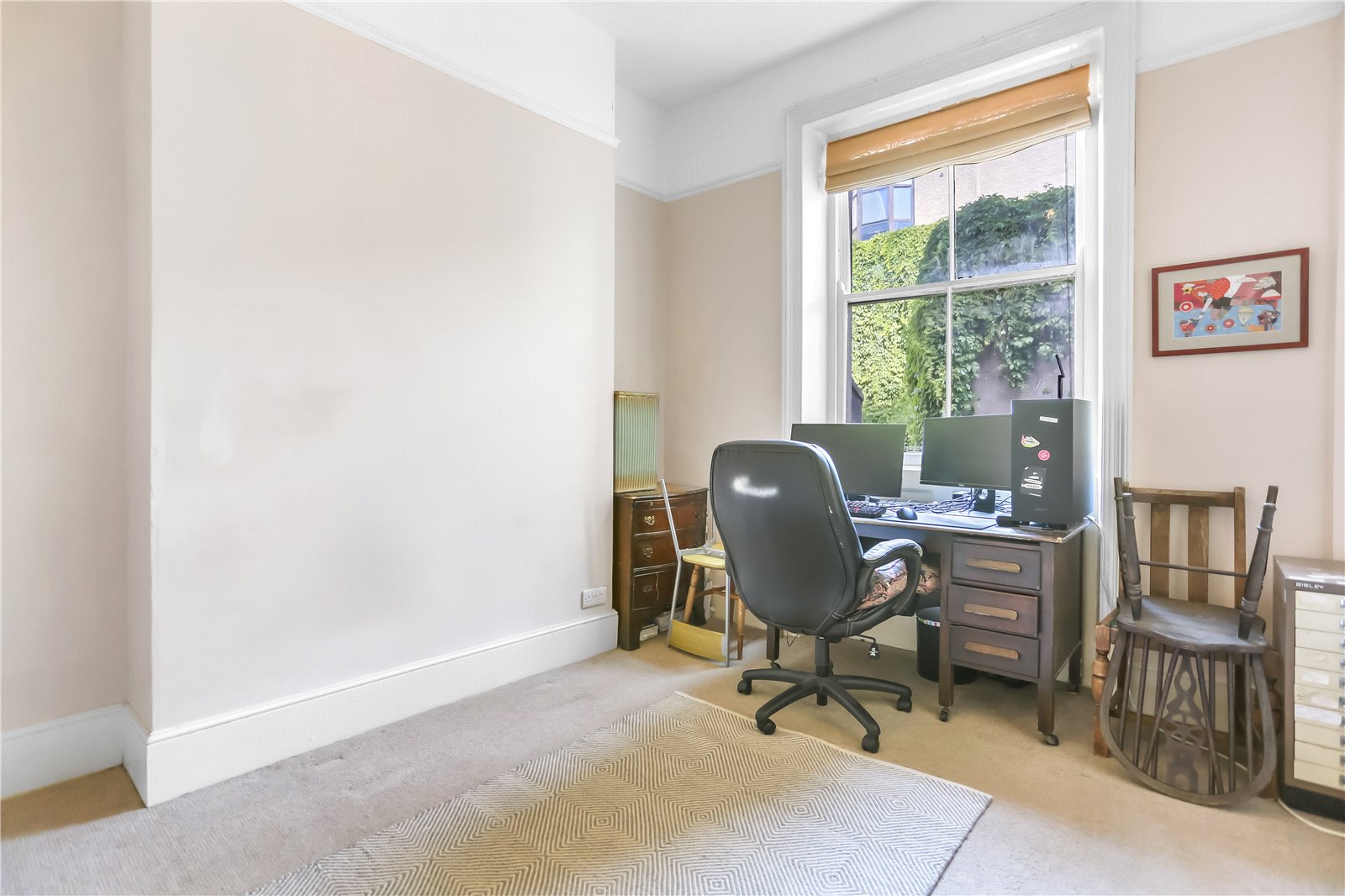 Upstairs, the south-facing living room provides a serene space, perfect for relaxation. Adjacent is a bedroom currently used as a study, with a bathroom to the rear. The second-floor houses two well-proportioned bedrooms and a shower room, while the third floor accommodates two additional bedrooms.