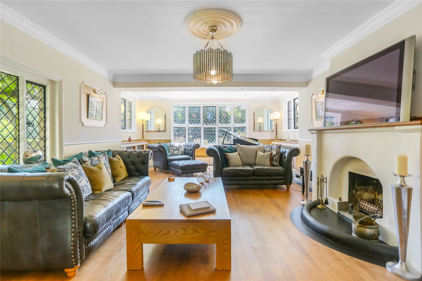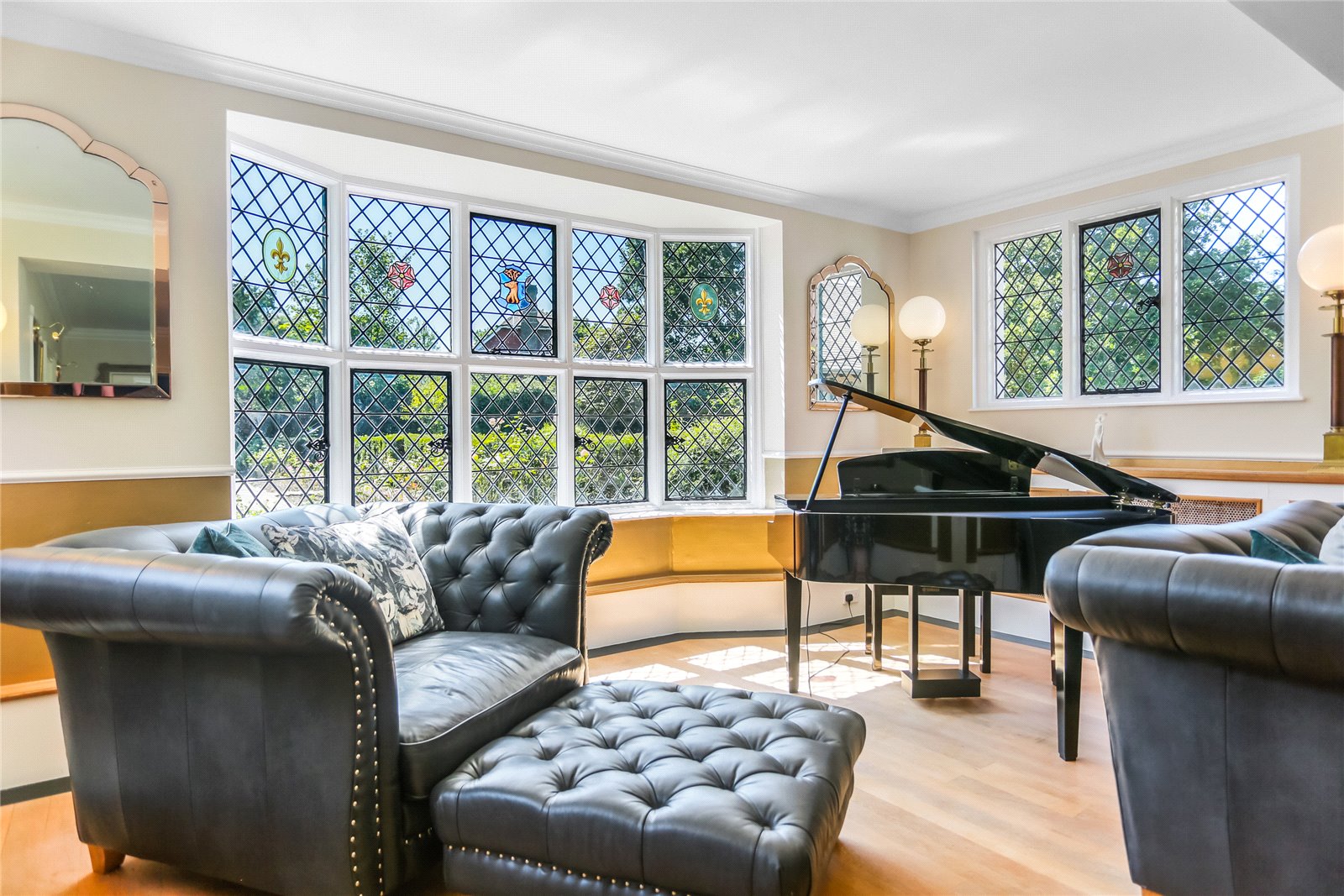Adjacent to the hall is the stunning drawing room, an expansive 27-foot space with a beautiful stained-glass bay window overlooking the rose garden. This room, filled with natural light, features another open fire, perfect for cozy winter evenings.