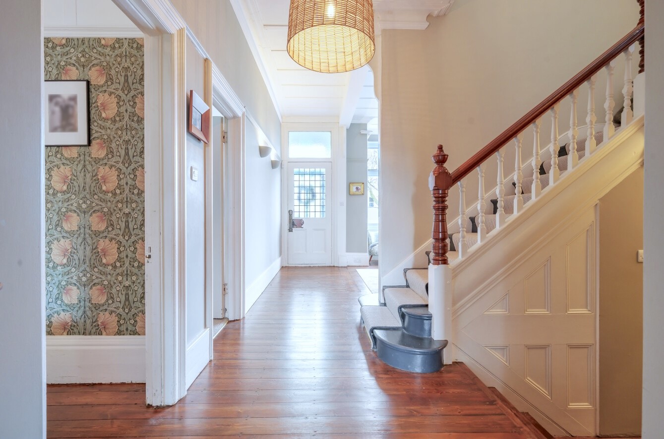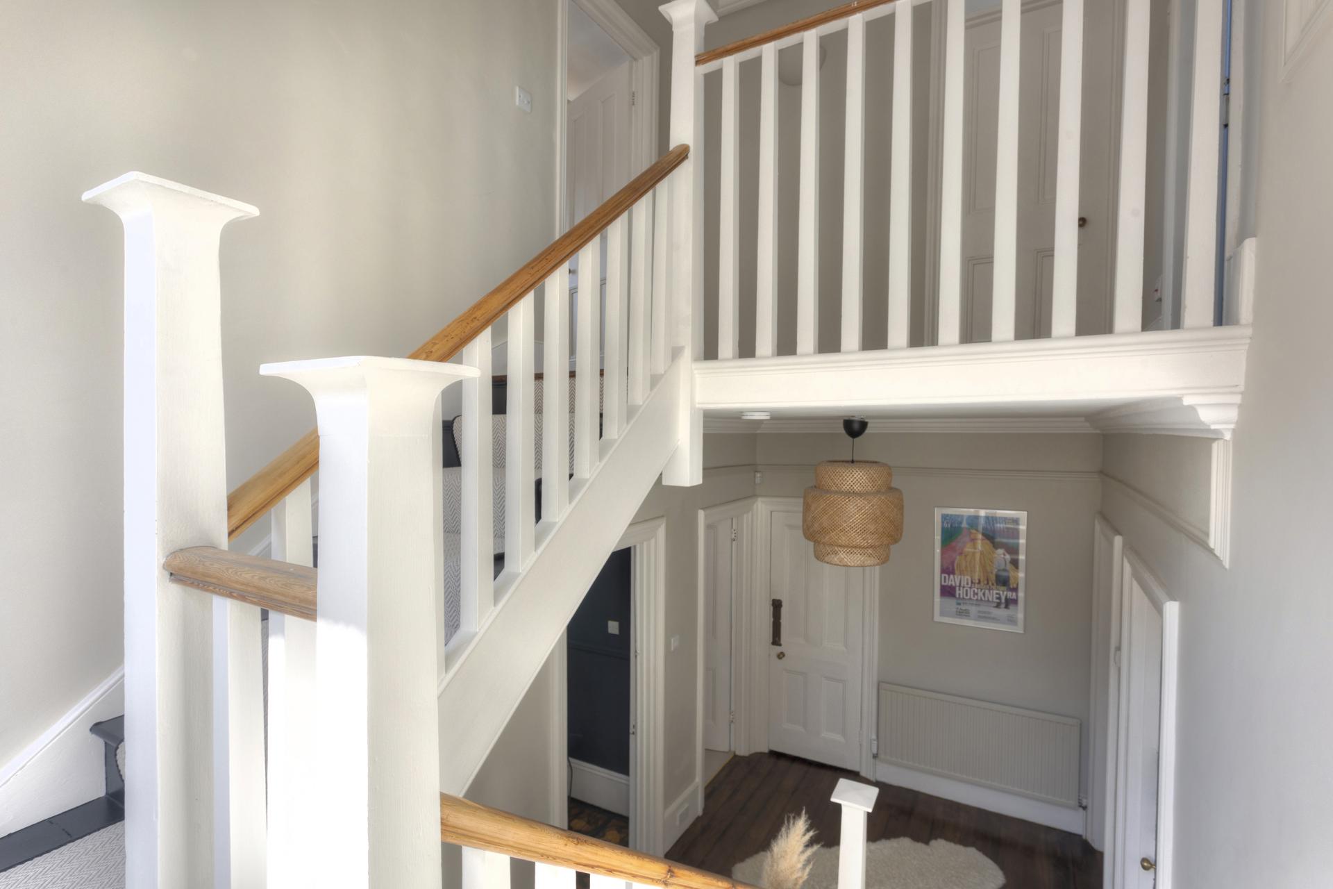 The staircase showcases a beautiful original oak balustrade, painted stairs and stylish herringbone runner. On the half landing is a stunning family bathroom.