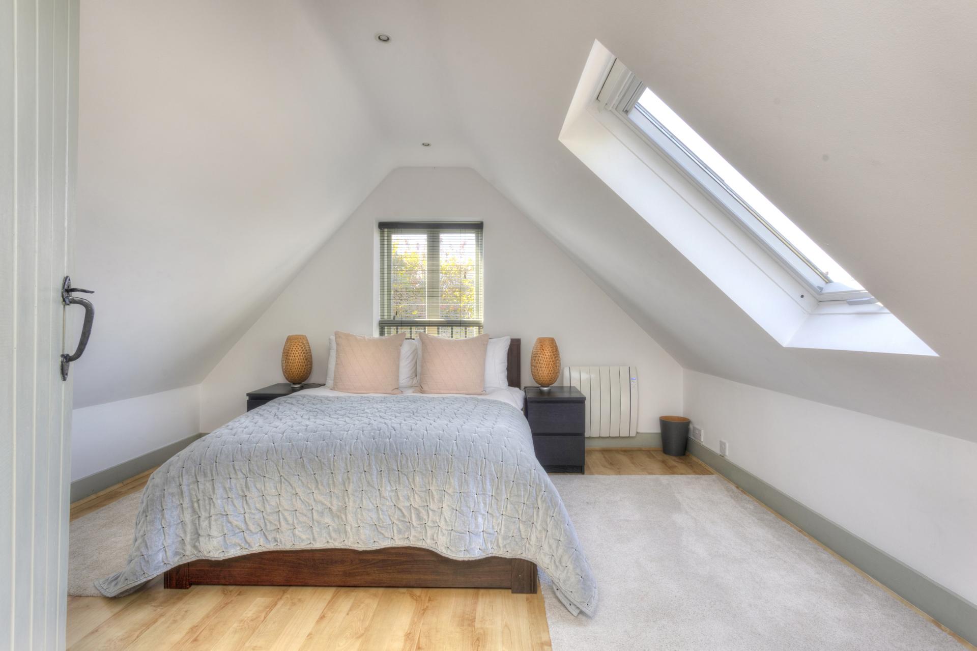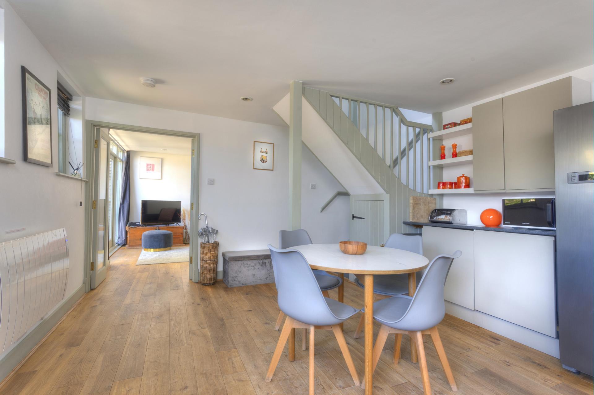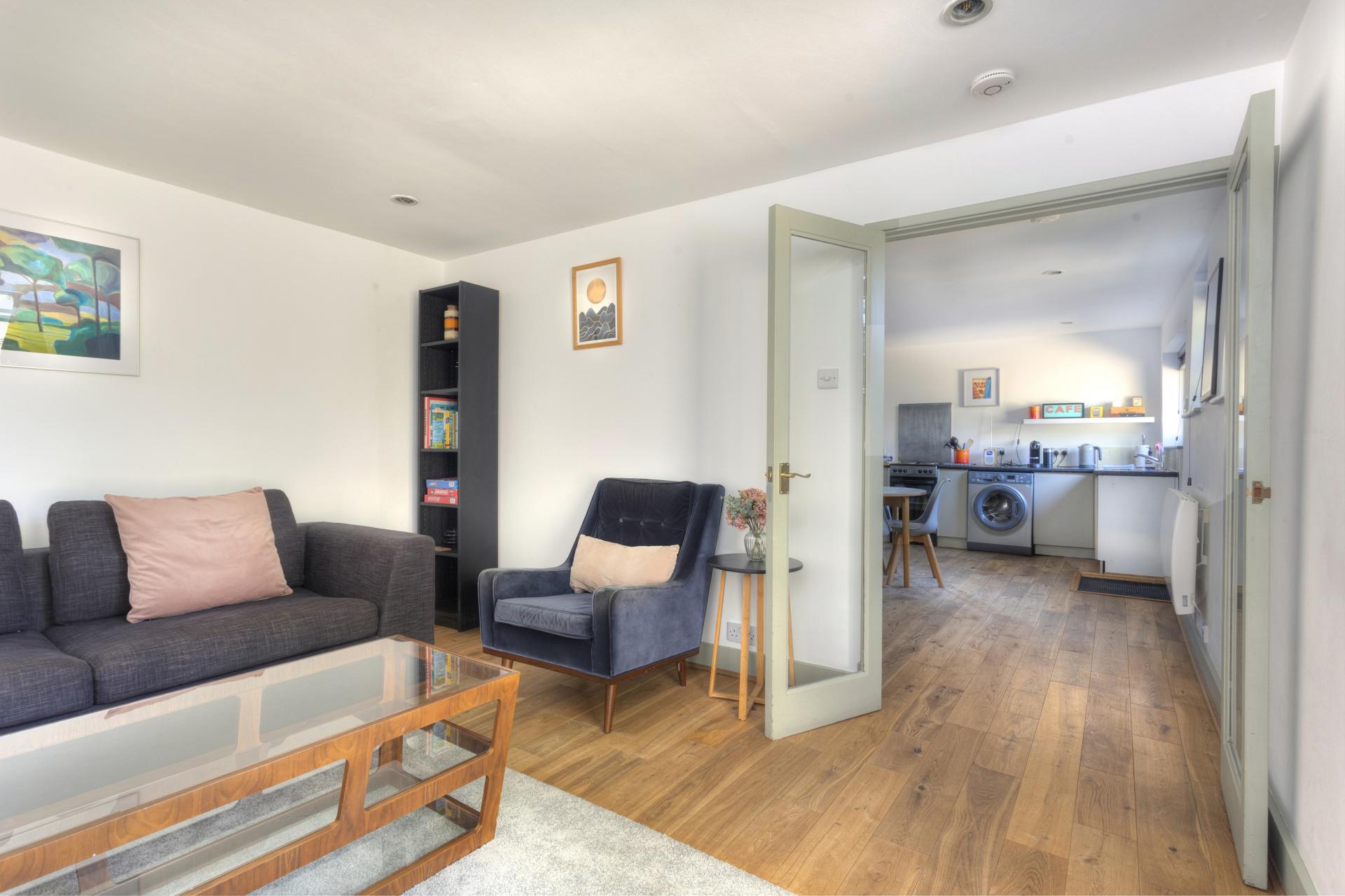 The two double bedroomed detached renovated Coach House with its private walled garden and off street parking can be accessed via the rear garden of the main house, or if you wish to be completely separate you can drive down the private lane affectionately known by locals as Blackberry Lane. An open plan kitchen-diner opens to a light filled lounge with floor to ceiling hardwood and glass doors. Contemporary oak flooring throughout and neutral palette make this a luxurious offering to friends and family for longer stays, or a fabulous workspace for a home business.