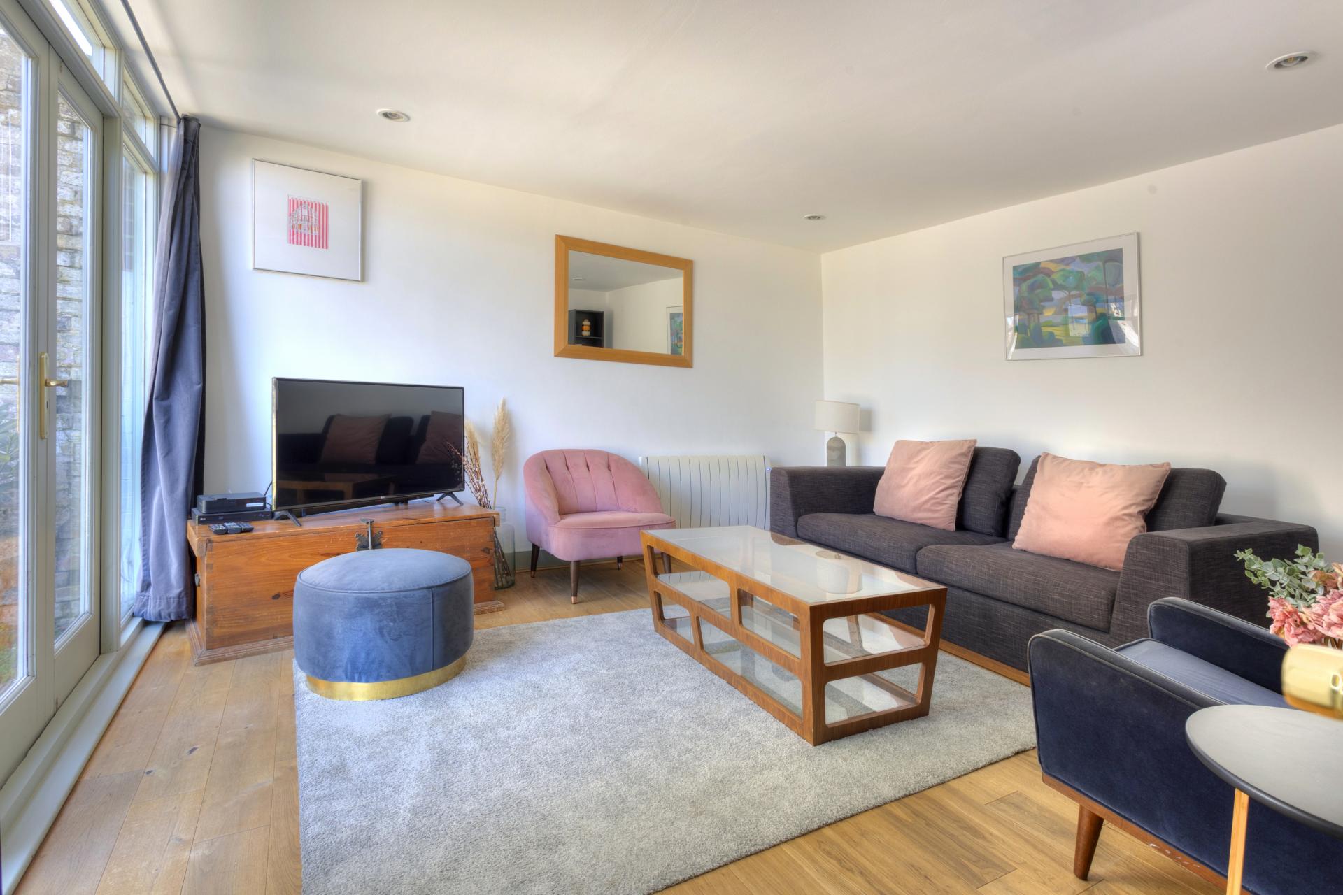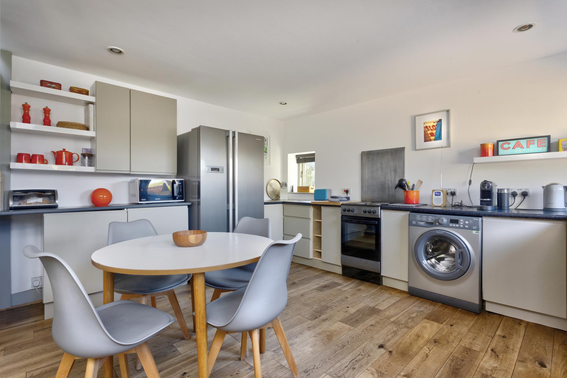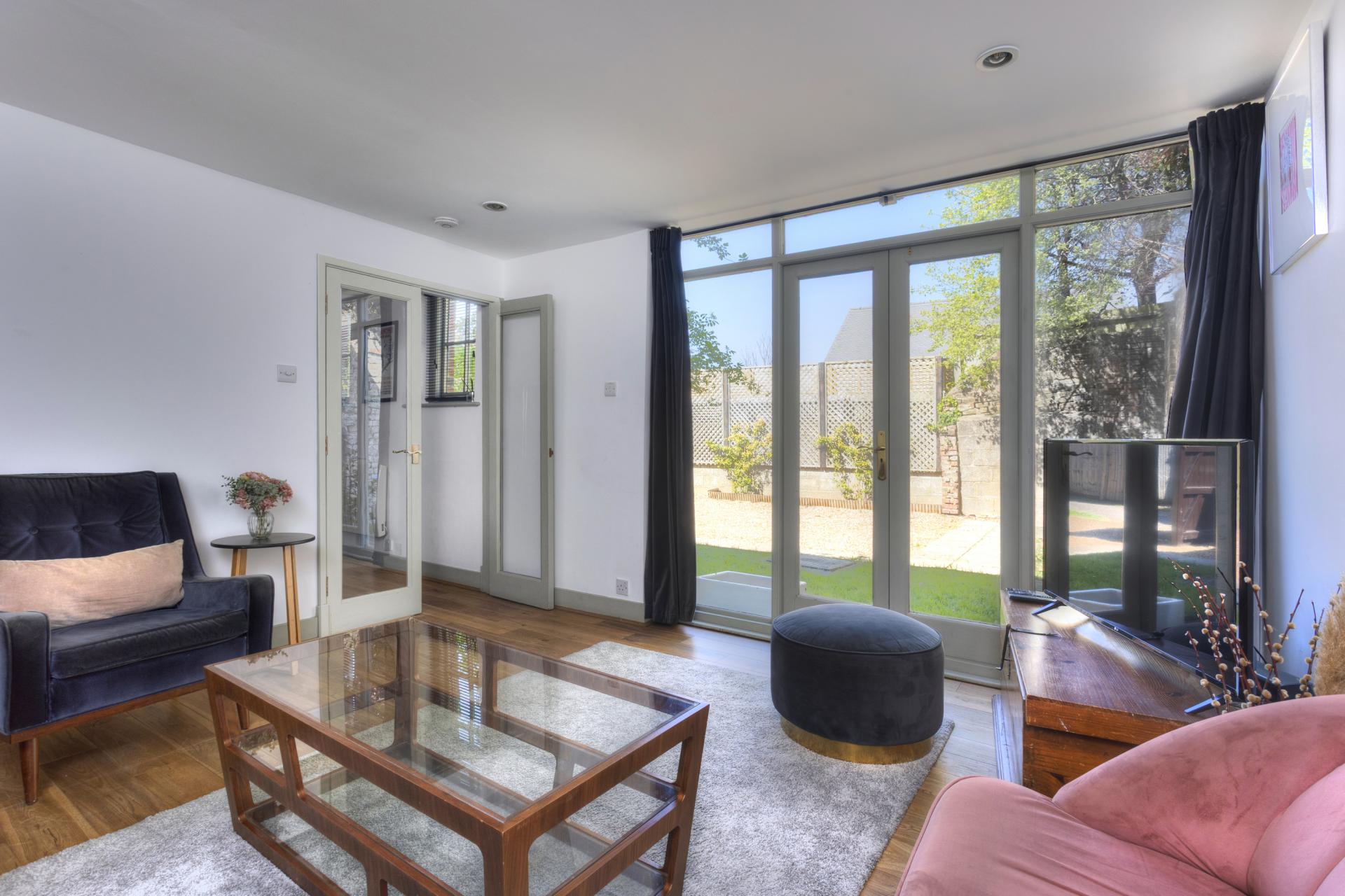 The two double bedroomed detached renovated Coach House with its private walled garden and off street parking can be accessed via the rear garden of the main house, or if you wish to be completely separate you can drive down the private lane affectionately known by locals as Blackberry Lane. An open plan kitchen-diner opens to a light filled lounge with floor to ceiling hardwood and glass doors. Contemporary oak flooring throughout and neutral palette make this a luxurious offering to friends and family for longer stays, or a fabulous workspace for a home business.