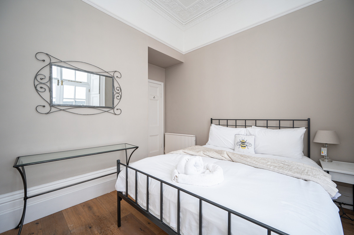 The principal bedroom is a generous retreat, featuring high ceilings, ornate cornicing, fitted wardrobes and French doors leading to a private decked terrace. A second double bedroom, with its own sash window and shutters, enjoys access to the front balcony. The shower room is sleek and sophisticated, with a walk-in shower, vanity unit, heated towel rail, and marble-effect tiling.