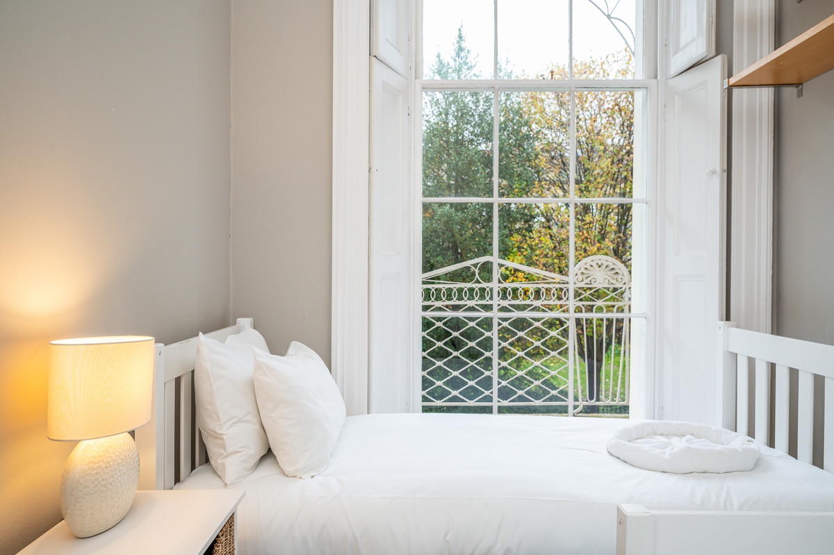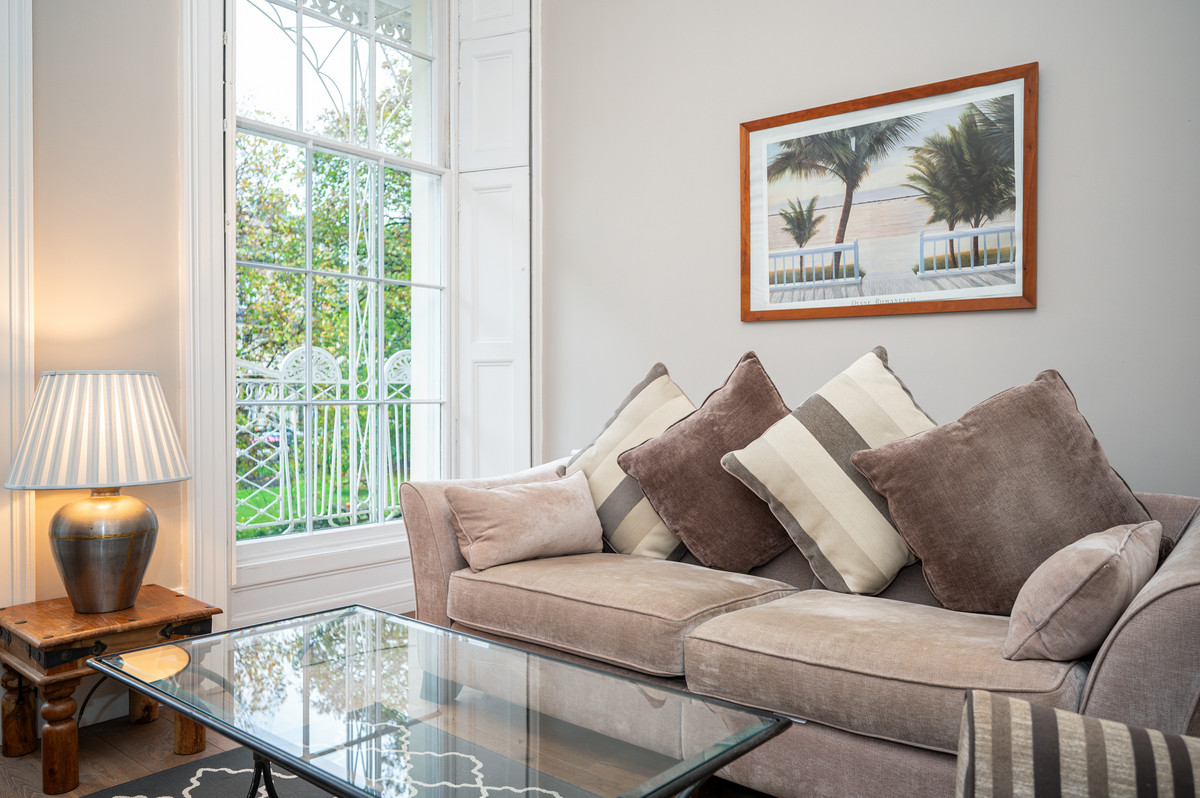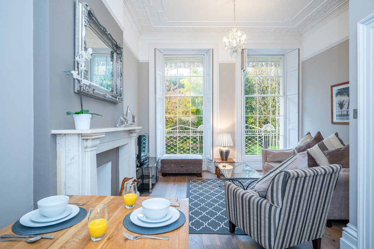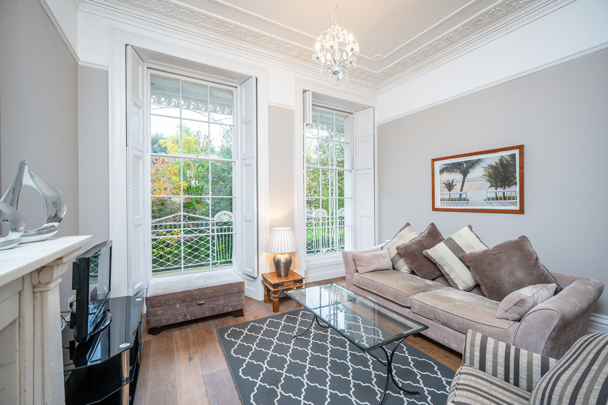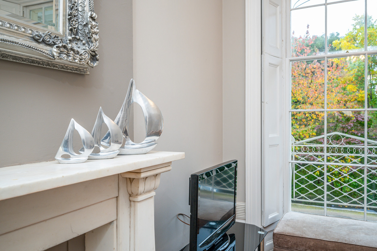 The stunning sitting room, with its ornate cornicing, carved marble fireplace and two full-height sash windows, is both grand and inviting. Working shutters open to reveal a stone and wrought-iron canopied balcony, the perfect spot for al fresco dining with leafy garden views and a glimpse of the Clifton Suspension Bridge.