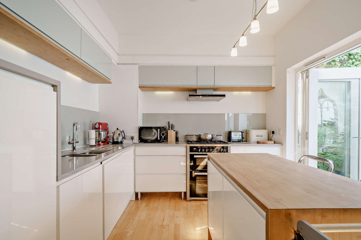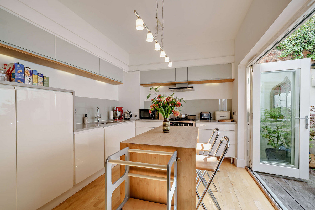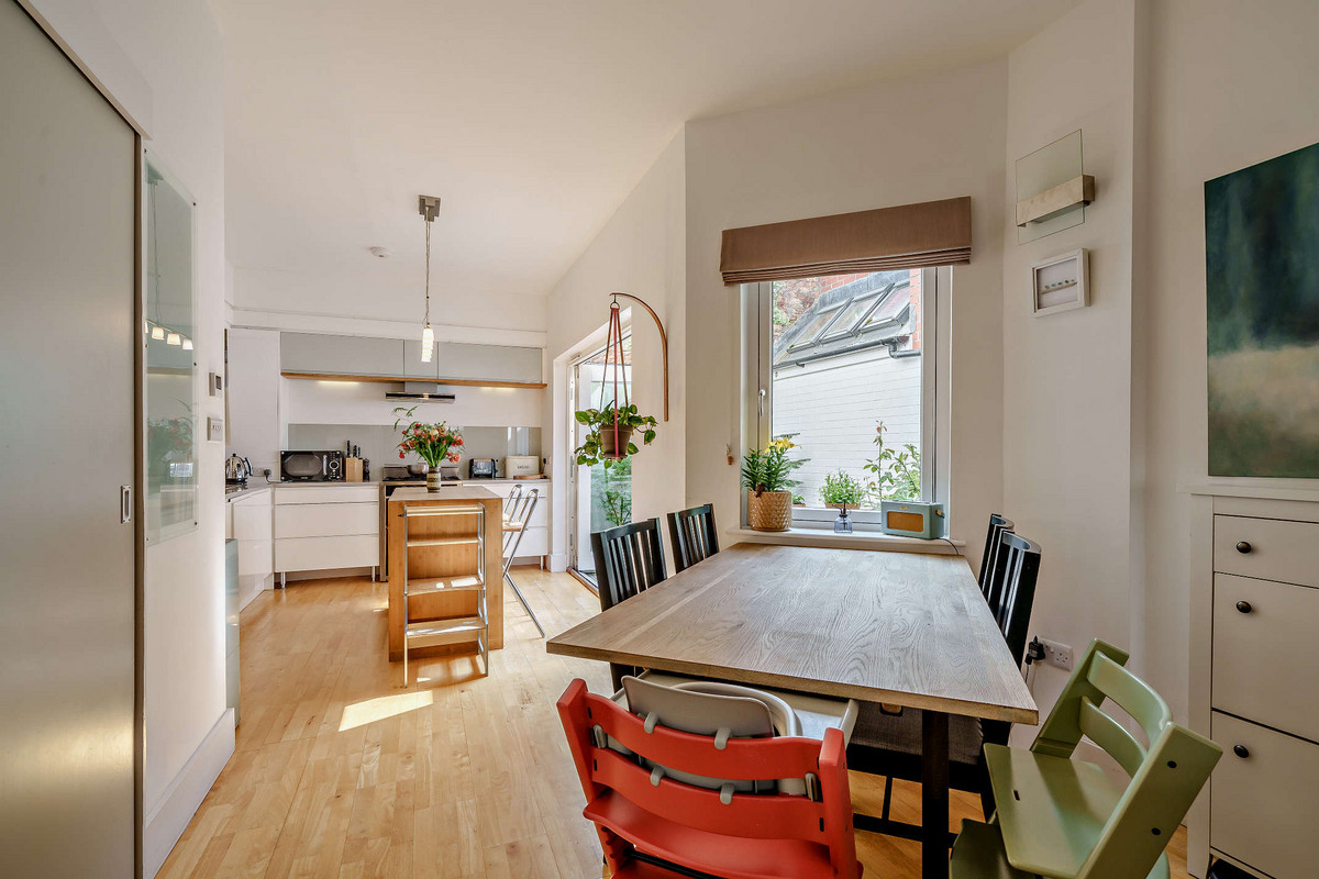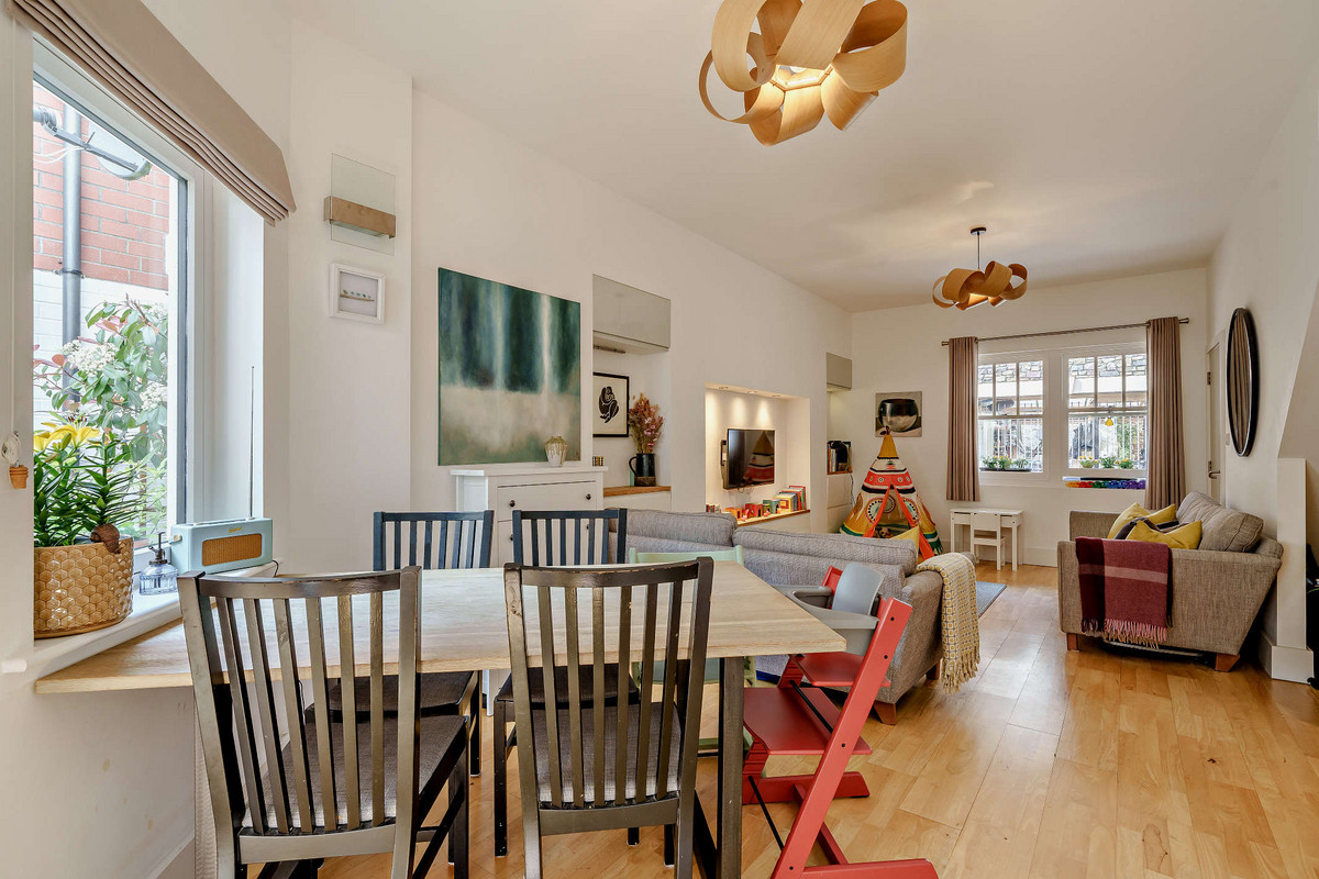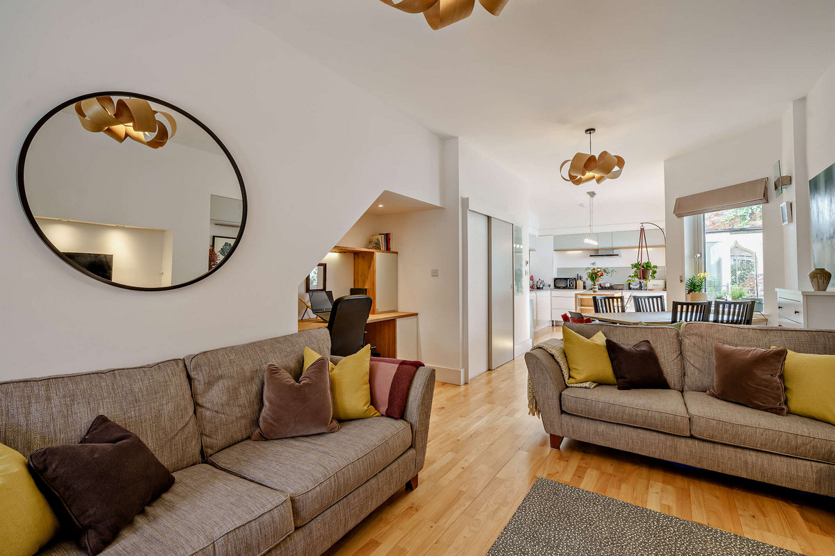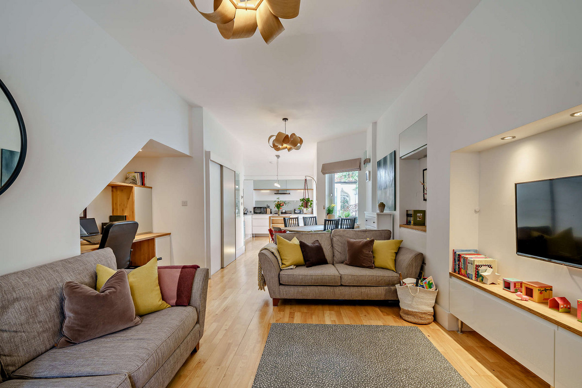 The open-plan ground floor features underfloor heating and high ceilings, creating a warm and airy living space filled with natural light from large sash windows. A cleverly designed understairs study nook provides the perfect space for remote working, while a discreet sliding door reveals a utility room complete with built-in storage, a sink, and a convenient downstairs WC.