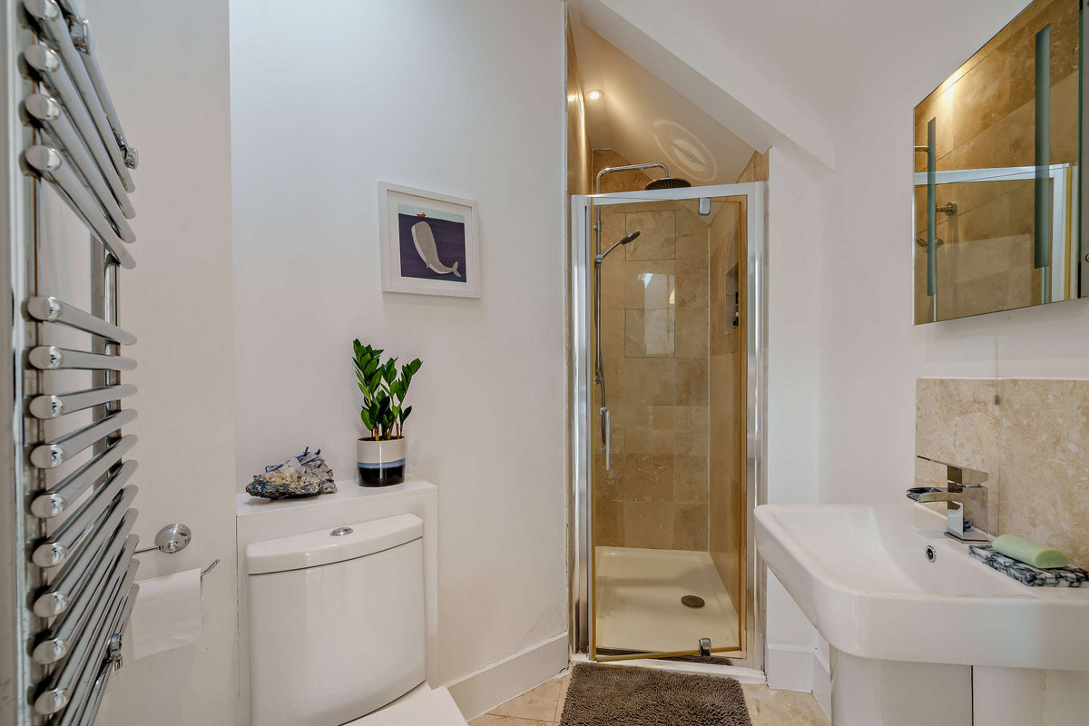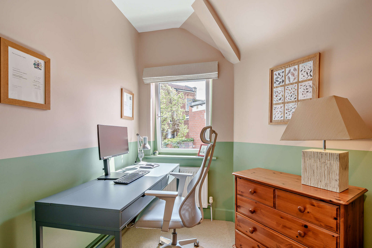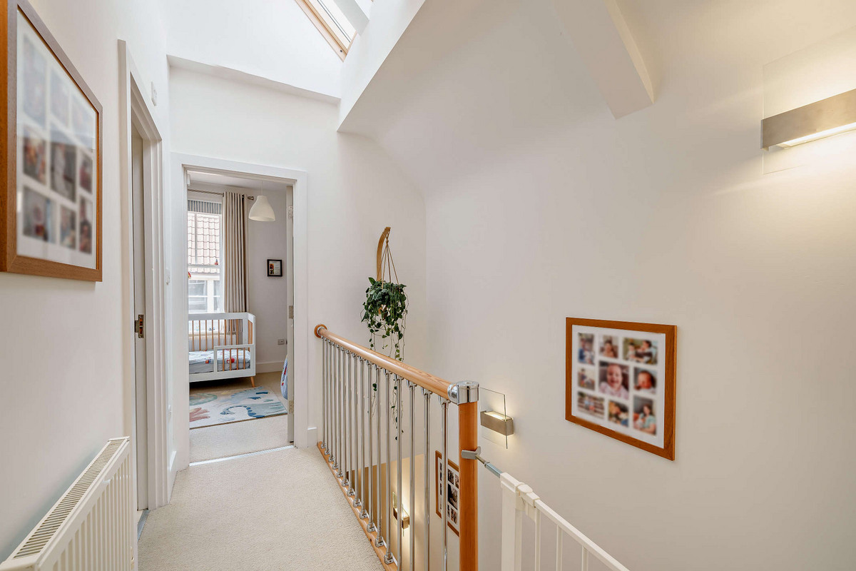 Upstairs continues the sense of space and light, with vaulted ceilings and twin Velux windows illuminating the landing. The generous primary bedroom includes a stylish en-suite shower room, while the second double bedroom offers a large built-in wardrobe, desk, and a sash window with views over the quiet mews. A third bedroom - currently used as a nursery/study - overlooks the courtyard below.